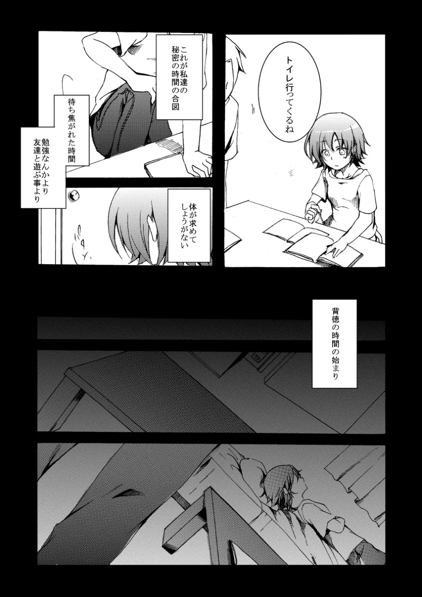 私たちには秘密がある。この夏に入ってからこうして近所の憧れのお兄さんに勉強を教わるようになり、いつの頃か勉強とは違うあの時間のために足繫く通うようになってしまった。「トイレいってくるね。」これが私たちの秘密の時間の合図。待ち焦がれた時間、勉強なんかより友達と遊ぶことより体が求めてしょうがない。背徳の時間の始まり―。