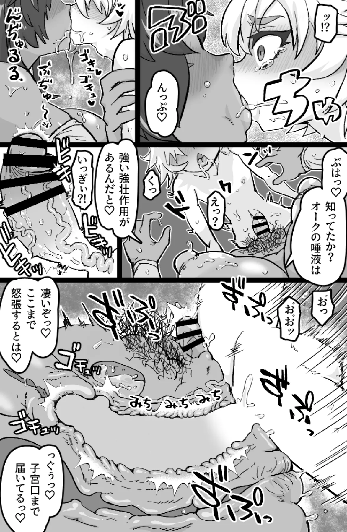 賞金首のオーク「フライフェイス」を狩るためにやってきたハンターの男。草むらから飛び出して剣を振りかざすも返り討ちにあって捕らわれの身となってしまう。しかし賞金首だと思って攻撃を仕掛けたオークは、実は女オークだった。勘違いで攻撃を仕掛けてしまったらしい。傷の手当がされており、その副作用でチンポがフル勃起。そのチンポを見て欲情した女オークは突如フェラを始める。「その槍の腕前、確かめさせてもらおうか」膣内で膨張するチンポを存分に感じながら中出しされる女オークでしたとさ。