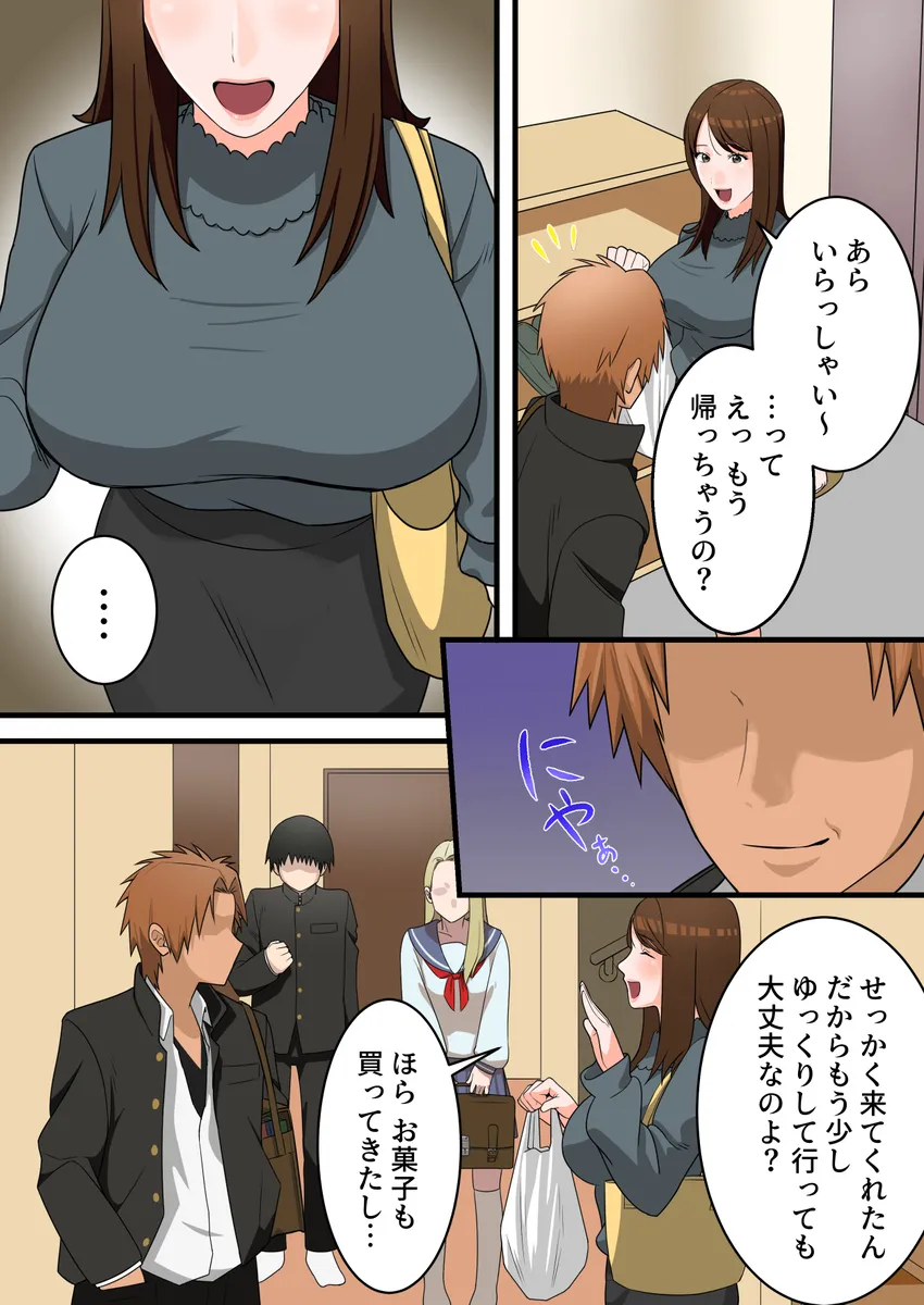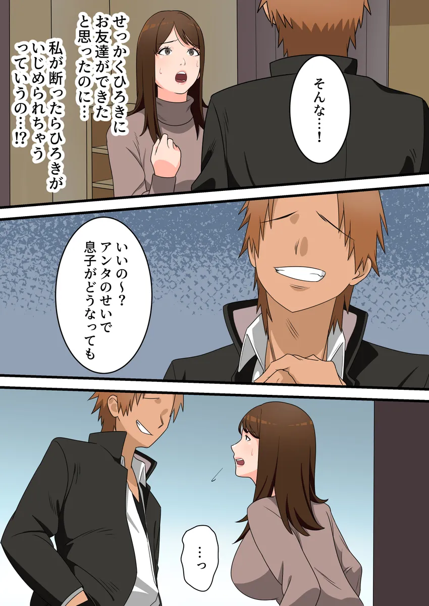 息子のひろきが友達を家に連れてやって来た。普段大人しく友達付き合いが苦手なひろきに友達が…?母親はそれを喜んでその友達をお出迎え。しかし何やら様子がおかしい。このヤンキー友達タクミはラブホ代わりにひろきの家に来ただけだったのだ。ひろきの部屋を借りて彼女と一発ヤるタクミ。ヤり終えると早々にひろきの家を後にする。その後、タクミが一人でひろきの家にやってくる。目的はひろきではなくひろきの母親だった。そのデカ乳揉ませろよ。母親はひろきが虐めの対象になってしまうのを避けるためにタクミの言うことを聞き入れ…。