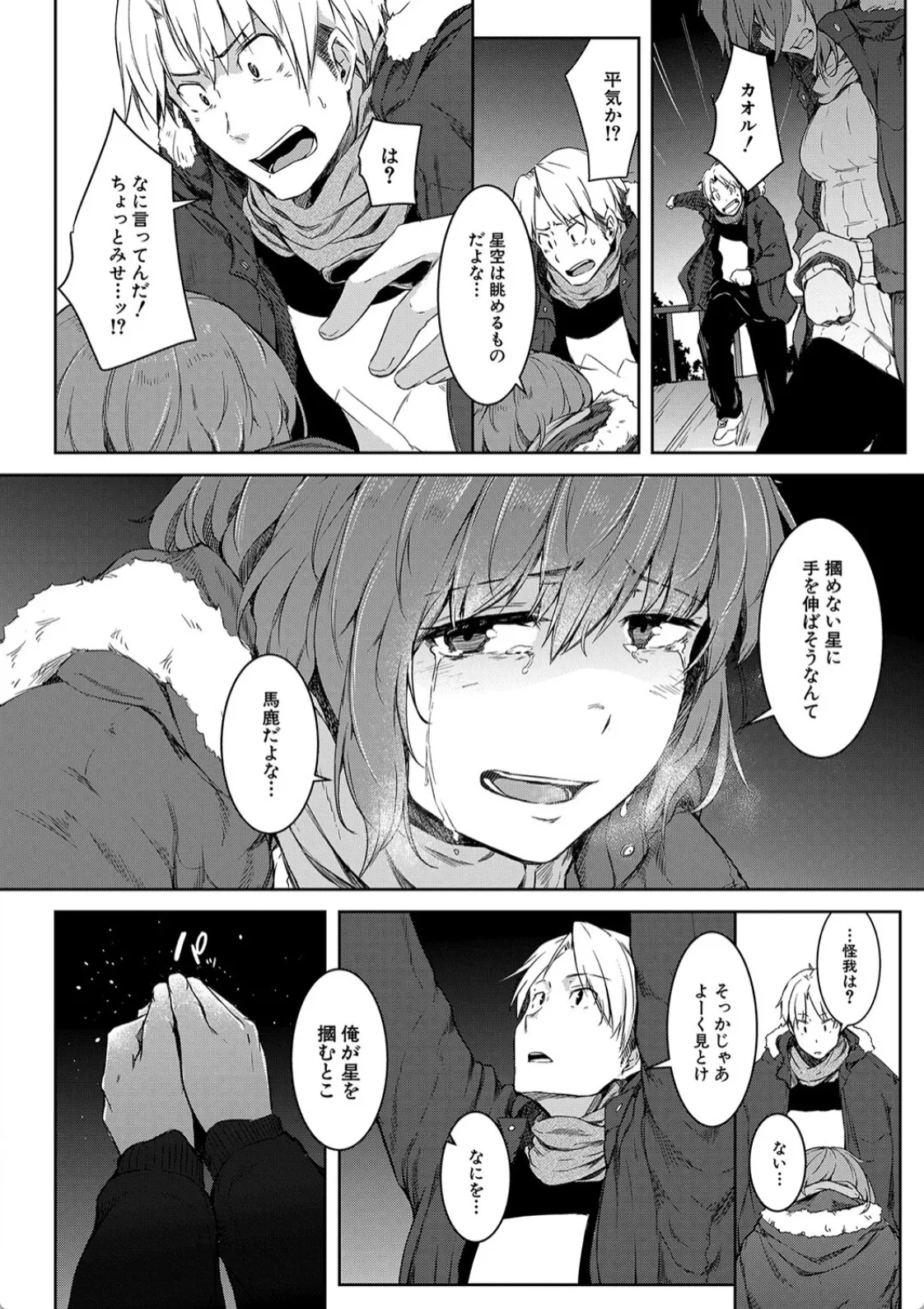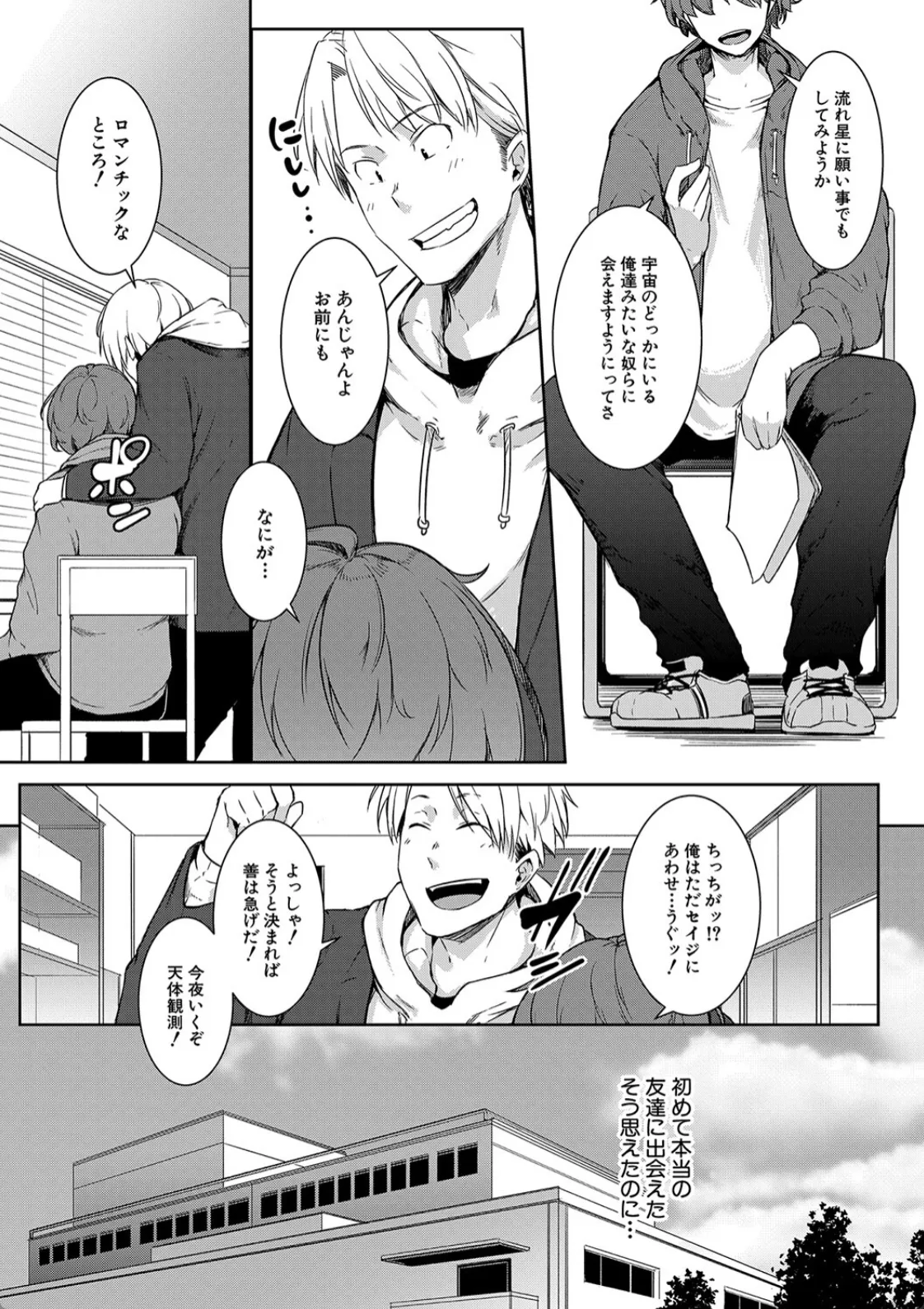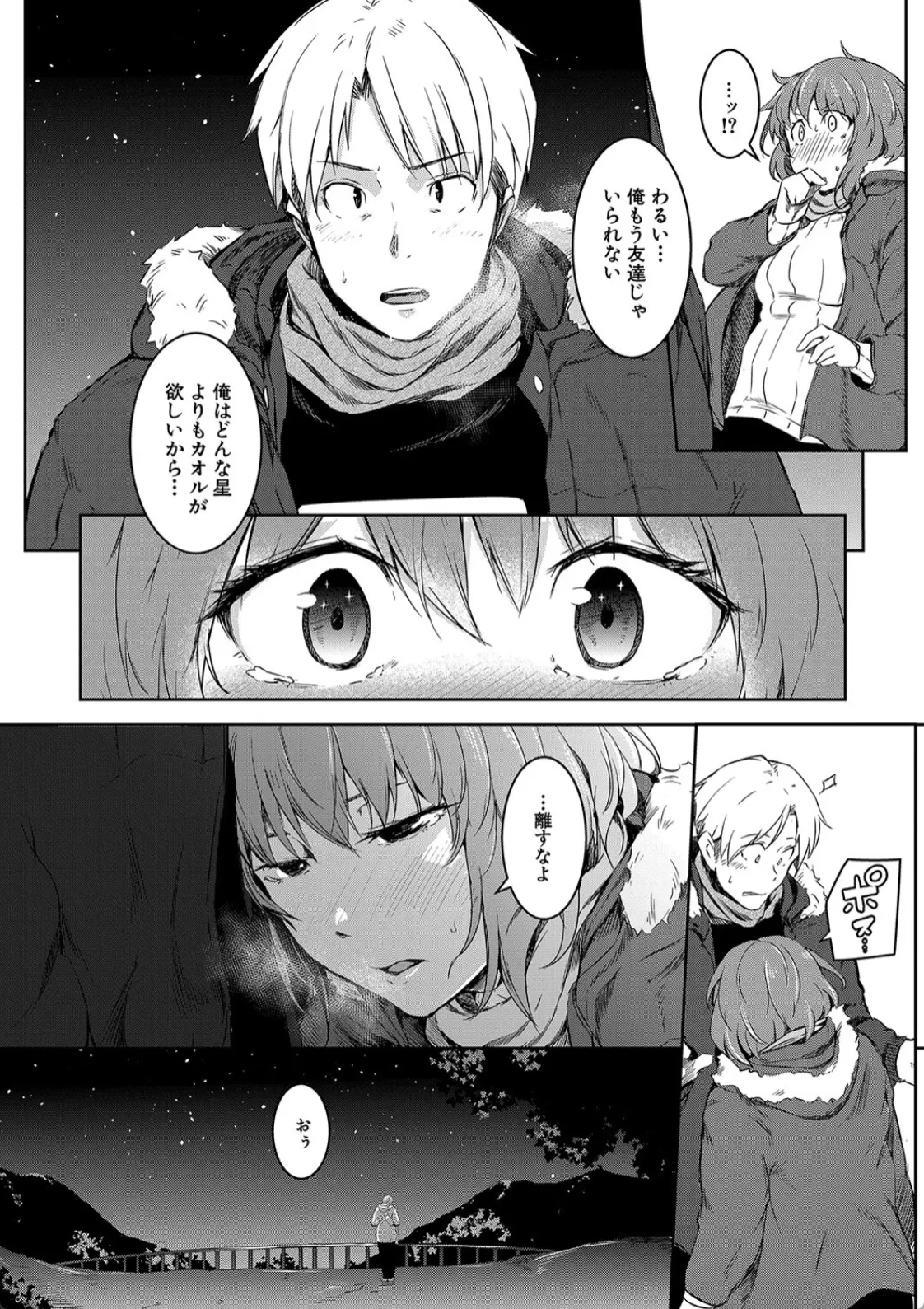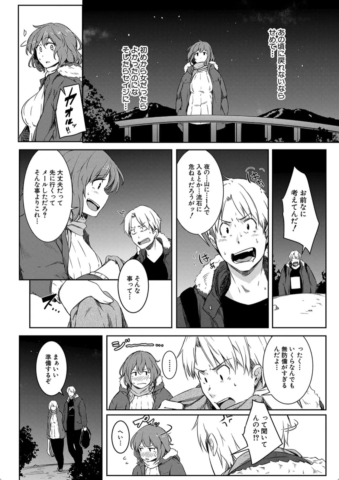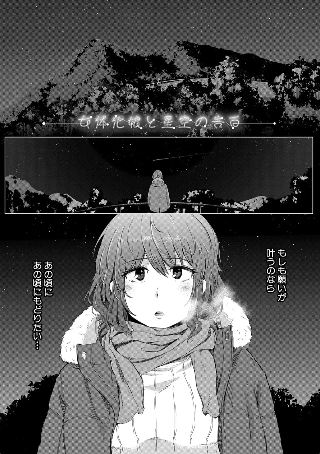 天文部に入部したカオルはそこでセイジと出会う。初めて本当の友達に出会えた…そう思えた矢先カオルは女体化してしまう。セイジは今まで通り接してくれているが何故か心がムズムズする。カオルはセイジの残したマフラーの残り香を嗅ぎながらオナニーして気を静めるも…この感情は…。そしてその日の天体観測でセイジの方からキスをされて告白までされてしまうカオル。答えはもちろんイエスだった。二人は満点の星空の下で野外セックスに耽る。この日、二人にとってここが思い出の場所となったのだった。