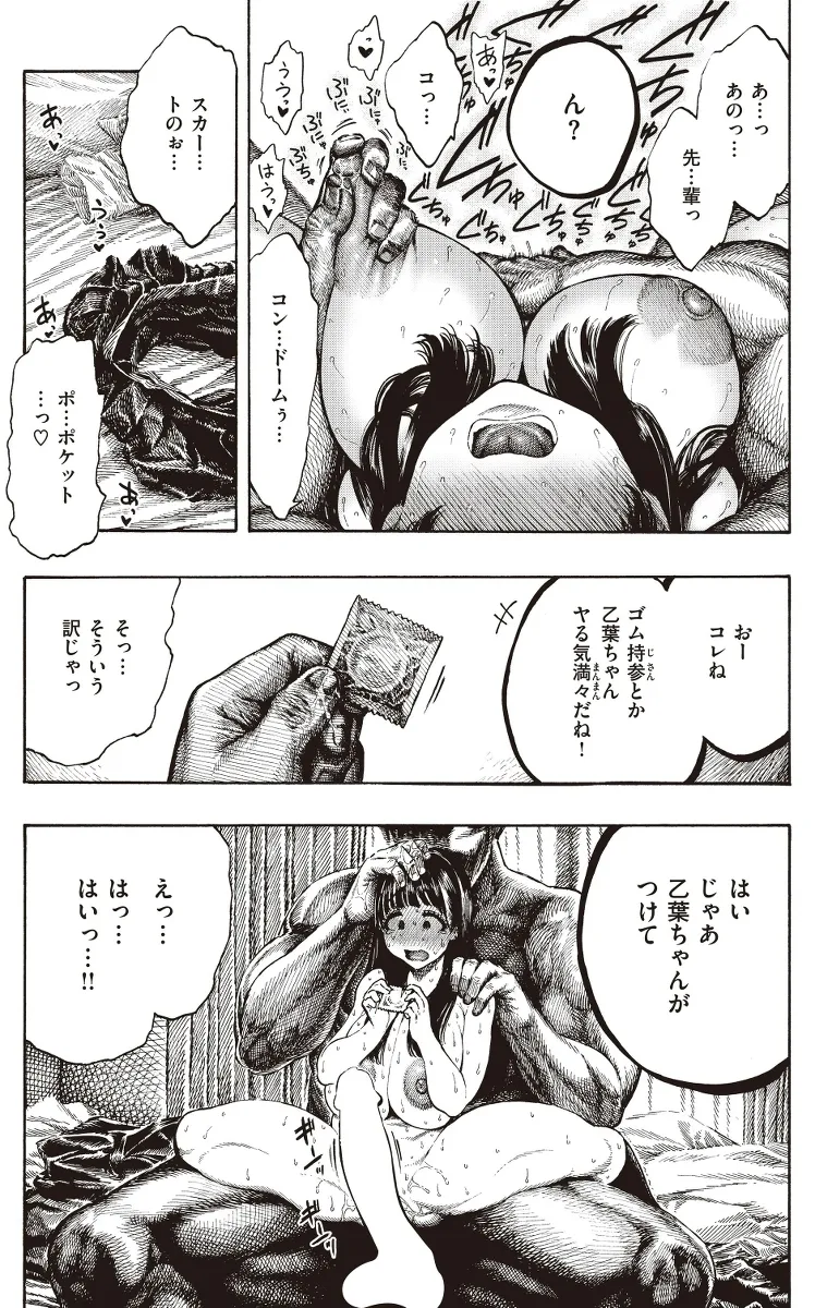 バスケ部の松岡先輩に告白された乙葉。返事はもちろんOK。松岡先輩は身長2m、一方乙葉は146cmでまるで巨人と小人である。そして、昨日付き合ったのに既に今日、乙葉は松岡先輩の家に呼ばれていた。明らかにペースが早い。そんな話を友達にすると、友達は流石に心配して乙葉にコンドームを持参させるのだが、乙葉は大丈夫だからと結局松岡先輩の家へ…。「またイったね乙葉ちゃん」乙葉は着いて早々に脱がされてセックスさせられるハメに。松岡先輩はかなりの巨根なためコンドームのサイズが合わずに、最後は生で入れられて中出しまでされ…。