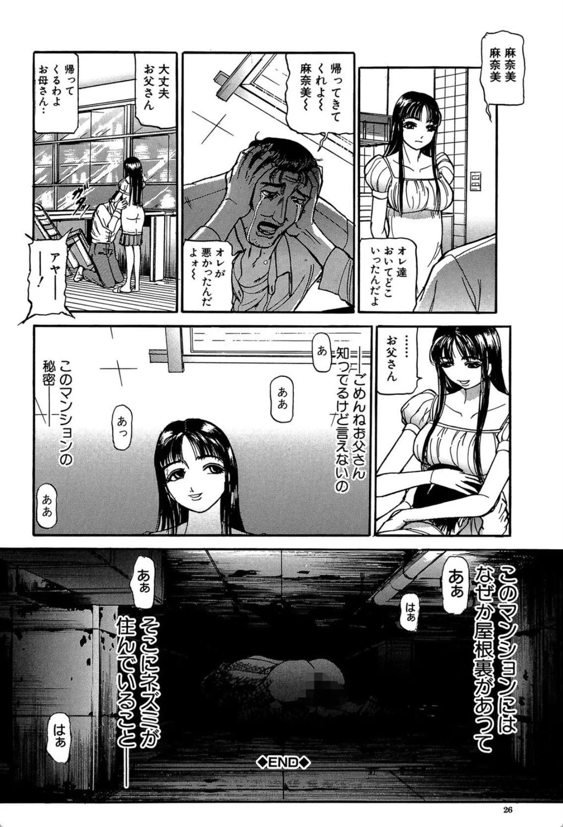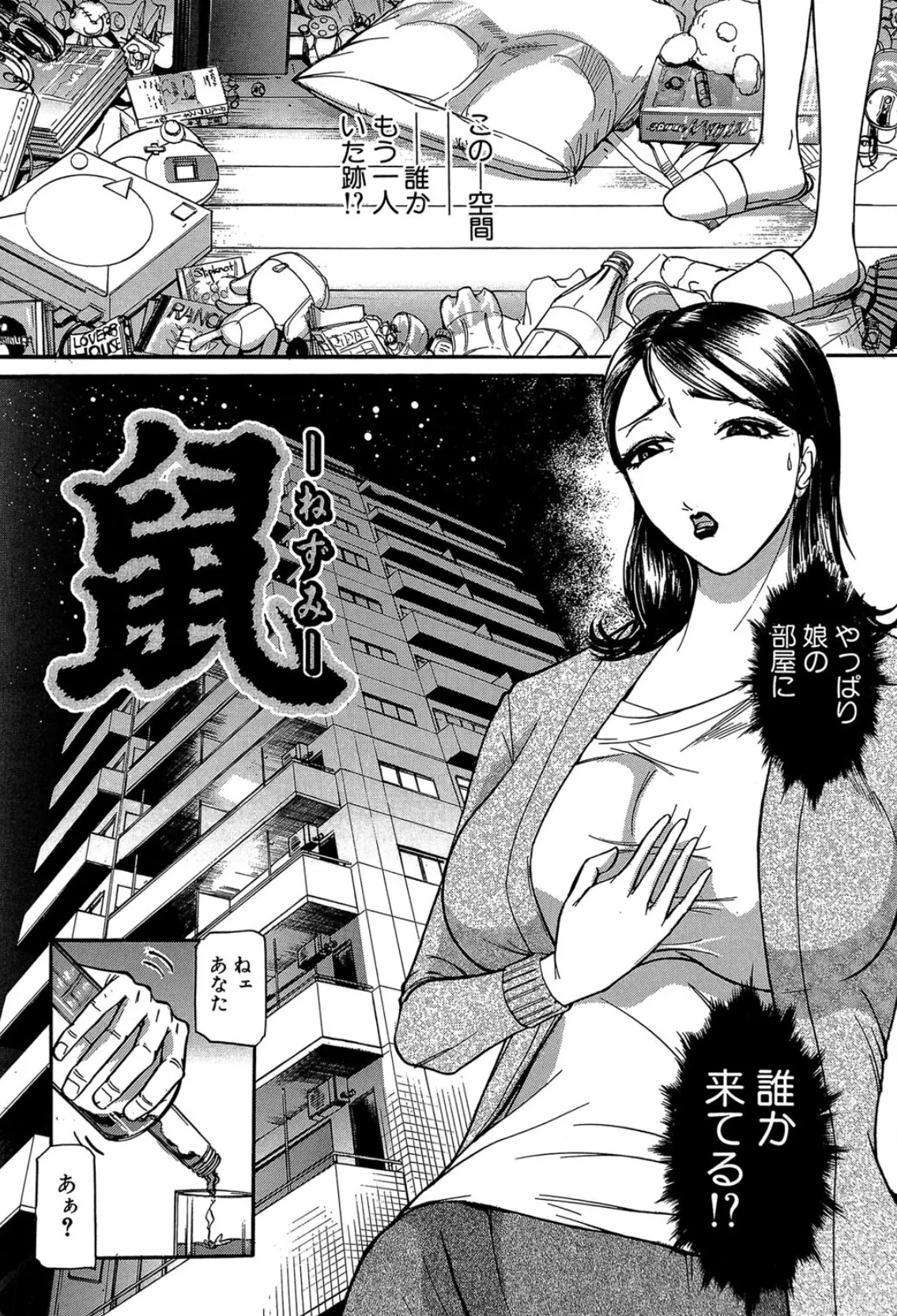 麻奈美には夫と娘がいる。しかし夫の会社の経営が上手くいかず、夫婦仲はこじれるばかり。さらに娘は引きこもりである。昔は夫も娘も自分の事を愛してくれていたのに…。そんな時、娘の部屋から男の声が聞こえてくる。ここはマンションの10階、玄関のドアも開けずに娘の部屋に入る事なんて不可能だ。麻奈美はその真相を程なくして知ることになる。ある日の夜、うちの冷蔵庫を漁る男を発見。見つけたと同時に「ボクが慰めてあげるよ」といきなりキスをされてマンコを弄られる。この男は一体誰?自らをねずみと名乗る男に手マンをされてメスとしての悦びを呼び覚まさせられる麻奈美。このマンションには何故か屋根裏部屋があってそこにねずみが棲みついていたことをまだ麻奈美は知らない―。