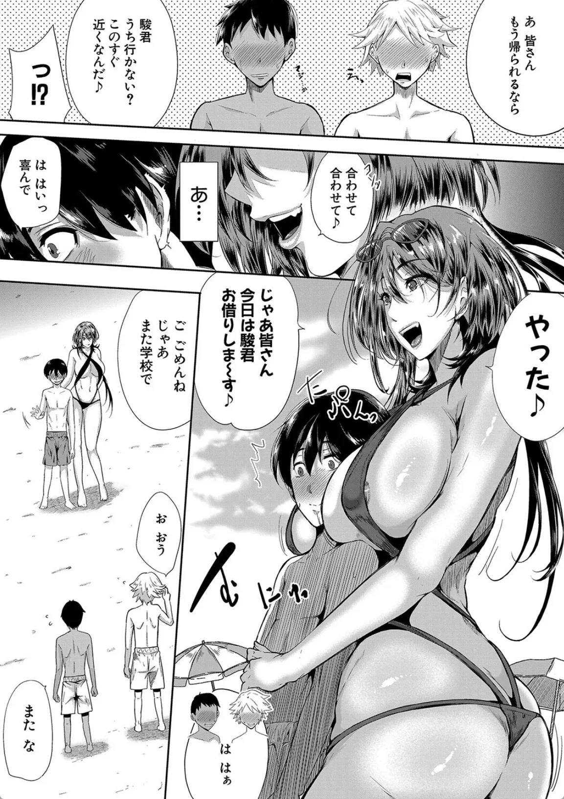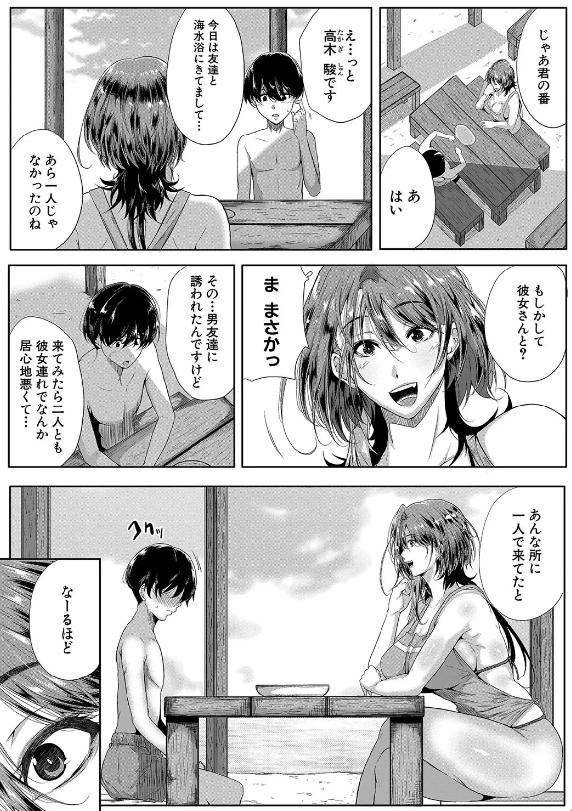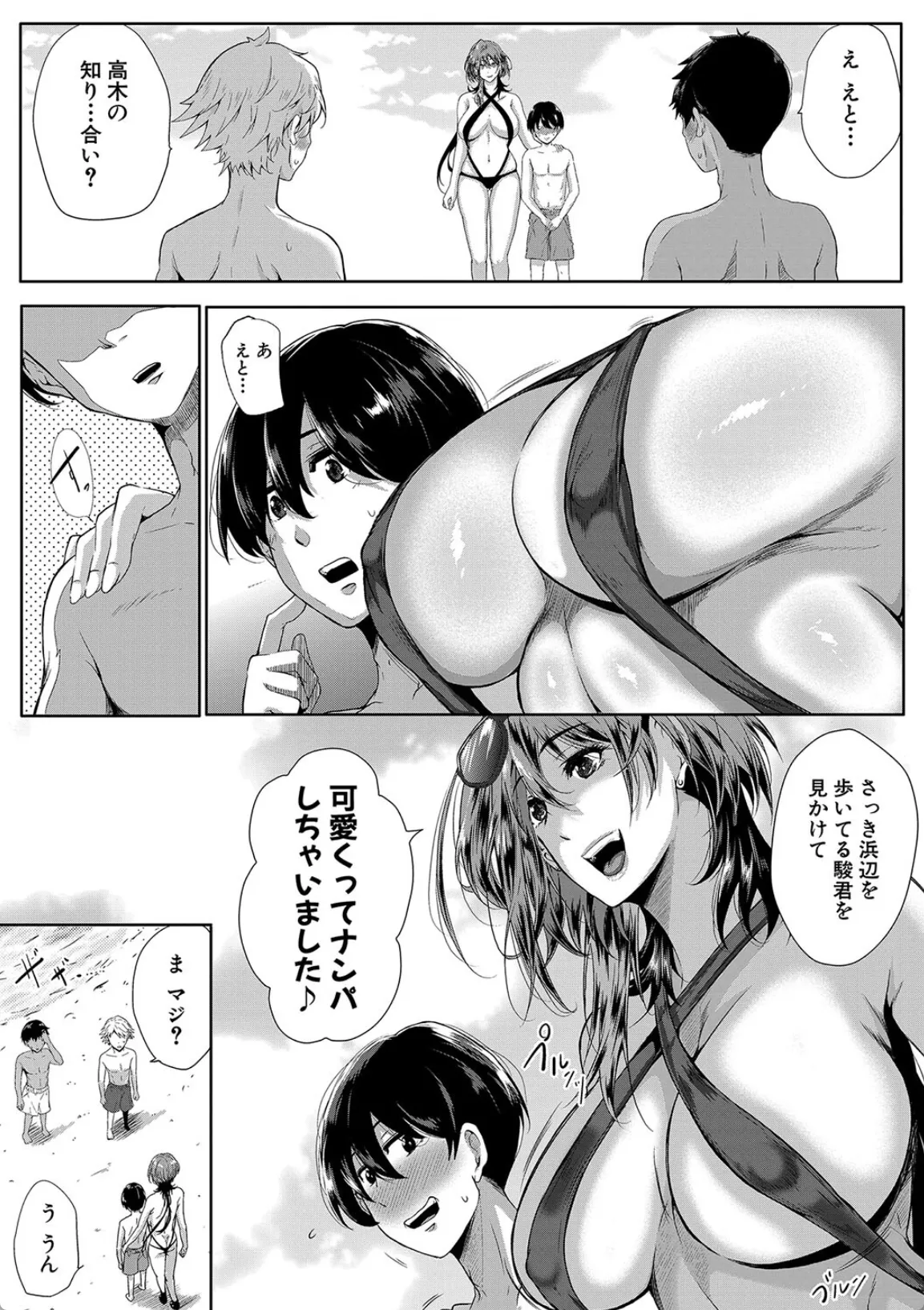 夏休みに友達に誘われて海にやって来た駿。その友達二人は彼女を連れて海に来ており、駿だけが寂しい思いをしていた。駿は一人でビーチを彷徨っていると洞窟でおっぱい丸出しの璃帆と出会う。璃帆は海の家の店主をしており、暇だから泳ぎに来ていたのだとか。事情を聞いた璃帆は今日一日だけ彼女になってあげると駿と一緒にその友達の元へ。璃帆はグラマラスボディを見せつけて、駿は友達を見返すことに成功する。その後、駿は璃帆の家に呼ばれておっぱいを直揉みさせてもらい、お互い興奮した二人はその流れでセックスへ。駿は童貞チンポをフェラ抜きされ、璃帆に跨られたまま膣内射精。駿はまた璃帆と会うことを約束する…。