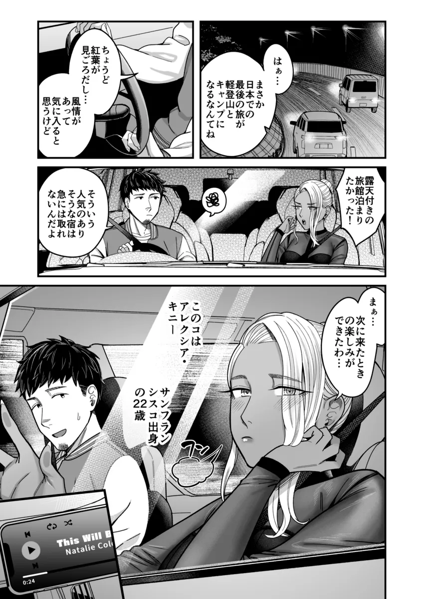日本での最後の旅が軽登山。アリーはサンフランシスコ出身の22歳。アリーはかれこれもう日本に二か月滞在している。アリーとコースケは沖縄の離島で出会い、こうして二人旅をしているというわけだ。軽登山の前日、アリーとコースケは車中泊をすることになるのだが、アリーからエッチはお預けを喰らってしまう。明日の登山に備えるために体力は消耗できないのだとか。そこでアリーとコースケは相互オナニーをすることに。チンポをシコってアリーのマンコに精子をぶっかけるコースケ。しかし、一発出してもまだムラムラはおさまらなかった…。