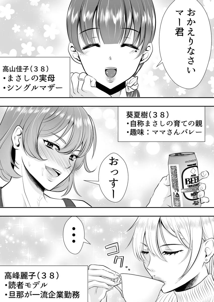 高校生のまさしは早く家に帰りたくてしょうがなかった。何故なら今日は母親の友達二人が家に来ているからだ。佳子はまさしの実母でありシングルマザー、夏樹は自称まさしの育ての親で趣味はママさんバレー、麗子は正確こそきついが読者モデルをしている。まさしは美熟女達に囲まれいつもトイレでシコっていた。この日もママ友たちの美爆乳に耐えきれずトイレで一発シコシコ。部屋に戻ると母は仕事へ出かけ麗子はコーヒーを買いに行き夏樹と二人きりに。まさしには秘密があった。この夏樹とセフレ関係にあることだ。二人きりになるや早速セックスをおっぱじめ…。