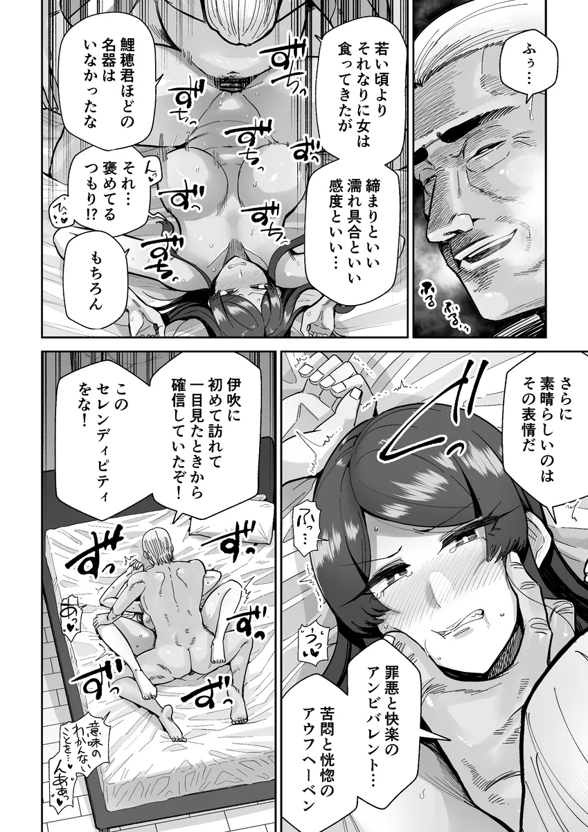 常連客のじじいにわかめ酒を提供する鯉穂。酒を飲まれると同時にマンコを吸われてびくびく痙攣して…。話は数日前に遡る。夫と一緒に割烹料理店を営んでいる妻の鯉穂。しかし、資金繰りが上手くいかずに経営難に。そこで、鯉穂は常連客の山根に相談を持ち掛ける。すると山根はこんな良い店を潰すわけにはいかないとお金を貸してくれたのだ。しかしこれには裏があった。そして、鯉穂は今山根の愛人として肉体奉仕を強いられている。還暦チンポを舐めさせられて挿入される鯉穂。徐々にマンコに山根のチンポが馴染んでいく。還暦なのに容赦ないピストン運動。鯉穂はイキ我慢するのに必死だった…。