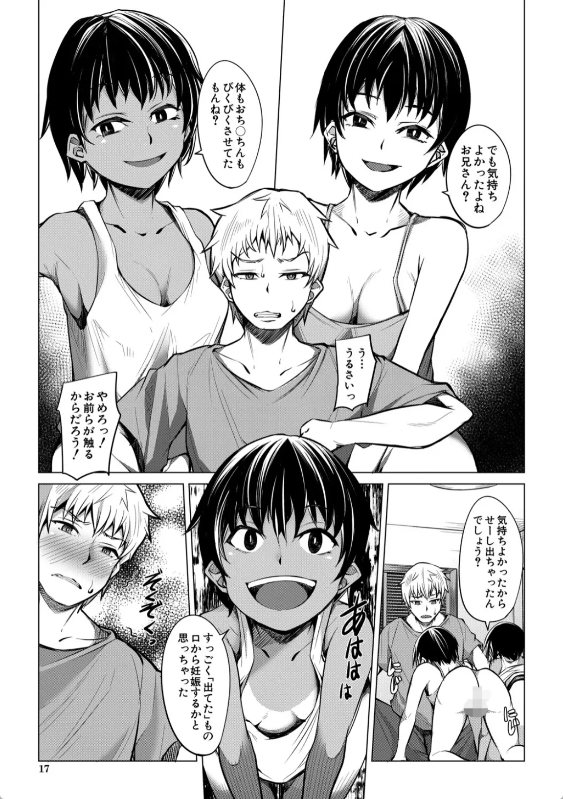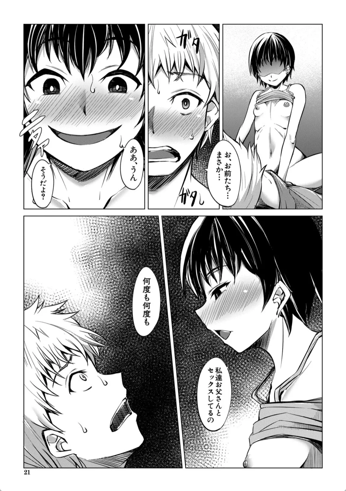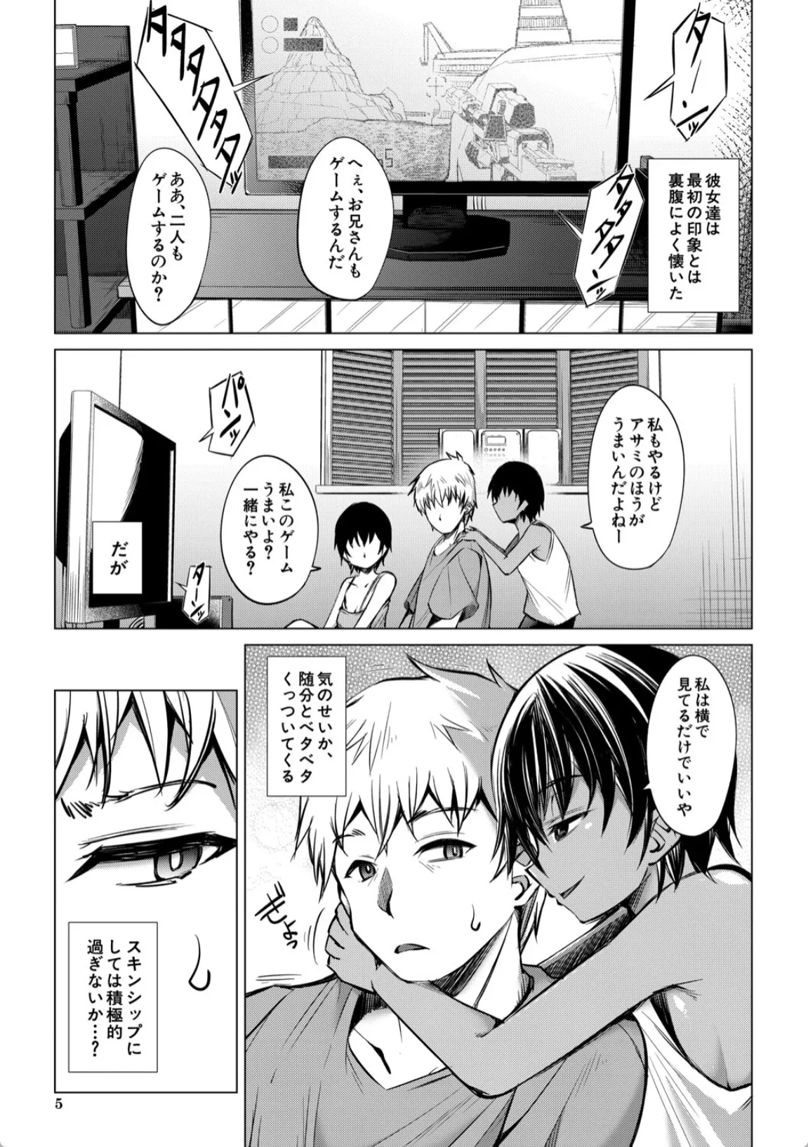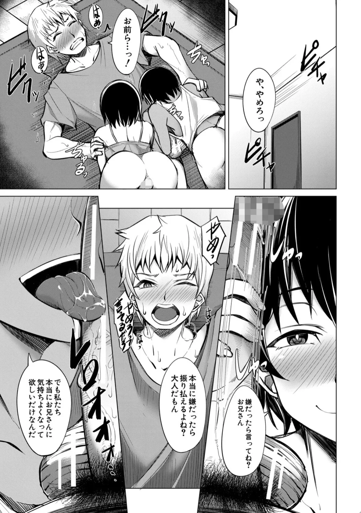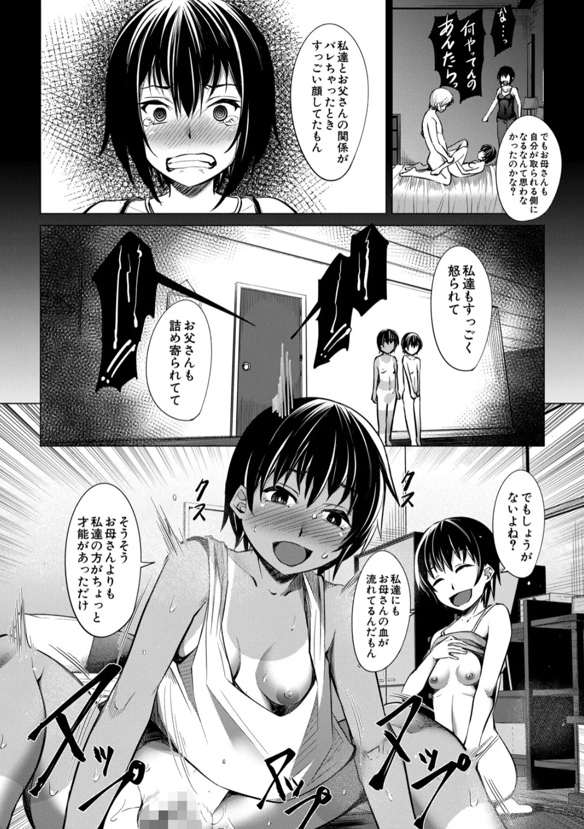 カズヒロは、おばさん夫婦が旅行中に娘二人ヒロミとアサミを預かることになる。一緒にゲームをして遊んだりしているうちに徐々に慣れて来たのか、やけにべたべたとくっついてスキンシップをとってくる二人。カズヒロは勃起を隠すので精一杯だった。風呂に入っていると、なんと二人が全裸で乱入。カズヒロの勃起したチンポを見て咥え始める。カズヒロはそのまま口内に発射。ヒロミとアサミは普段から父親と近親相姦をしており、テクニックには自信があるのだという。そして、部屋に戻って本格的な3Pエッチが始まり…。