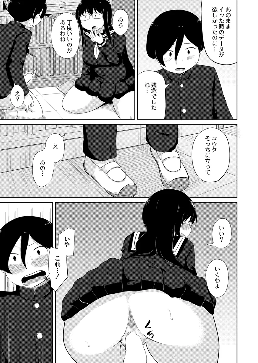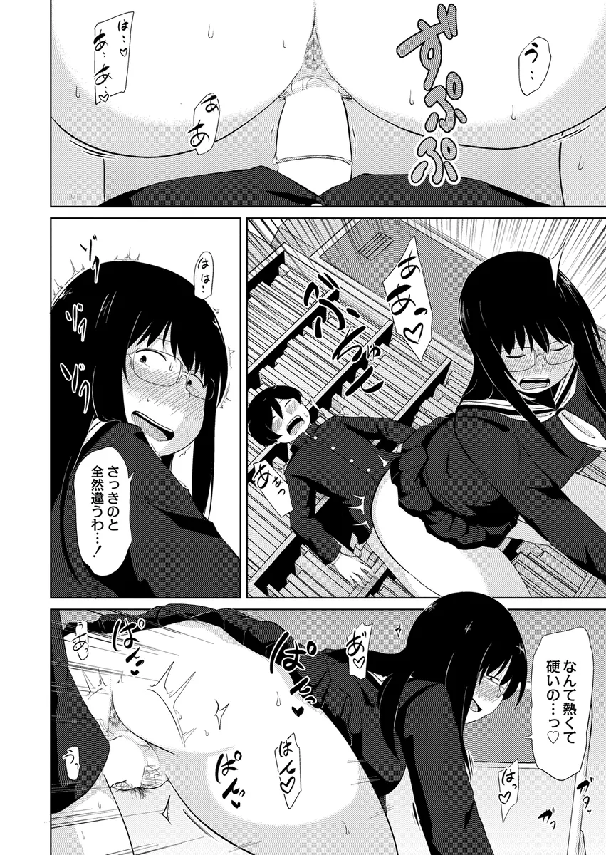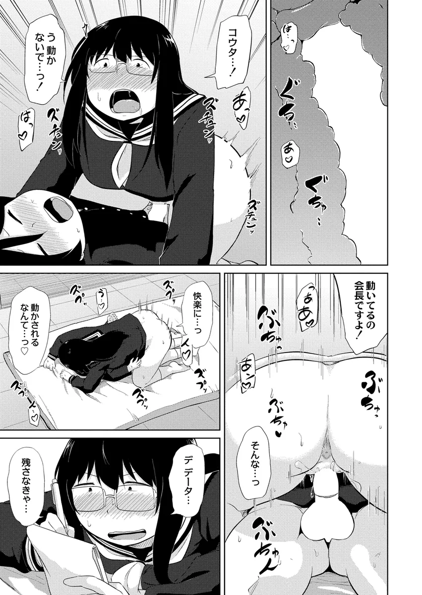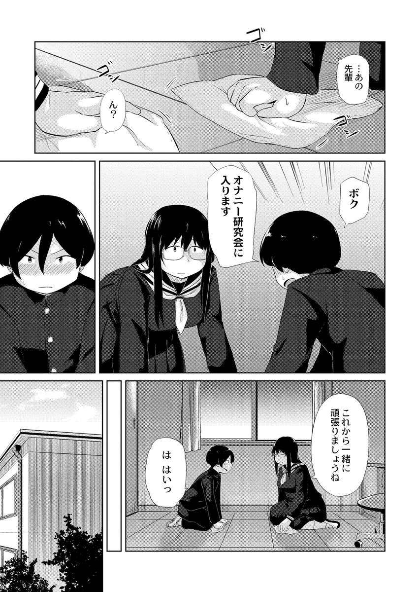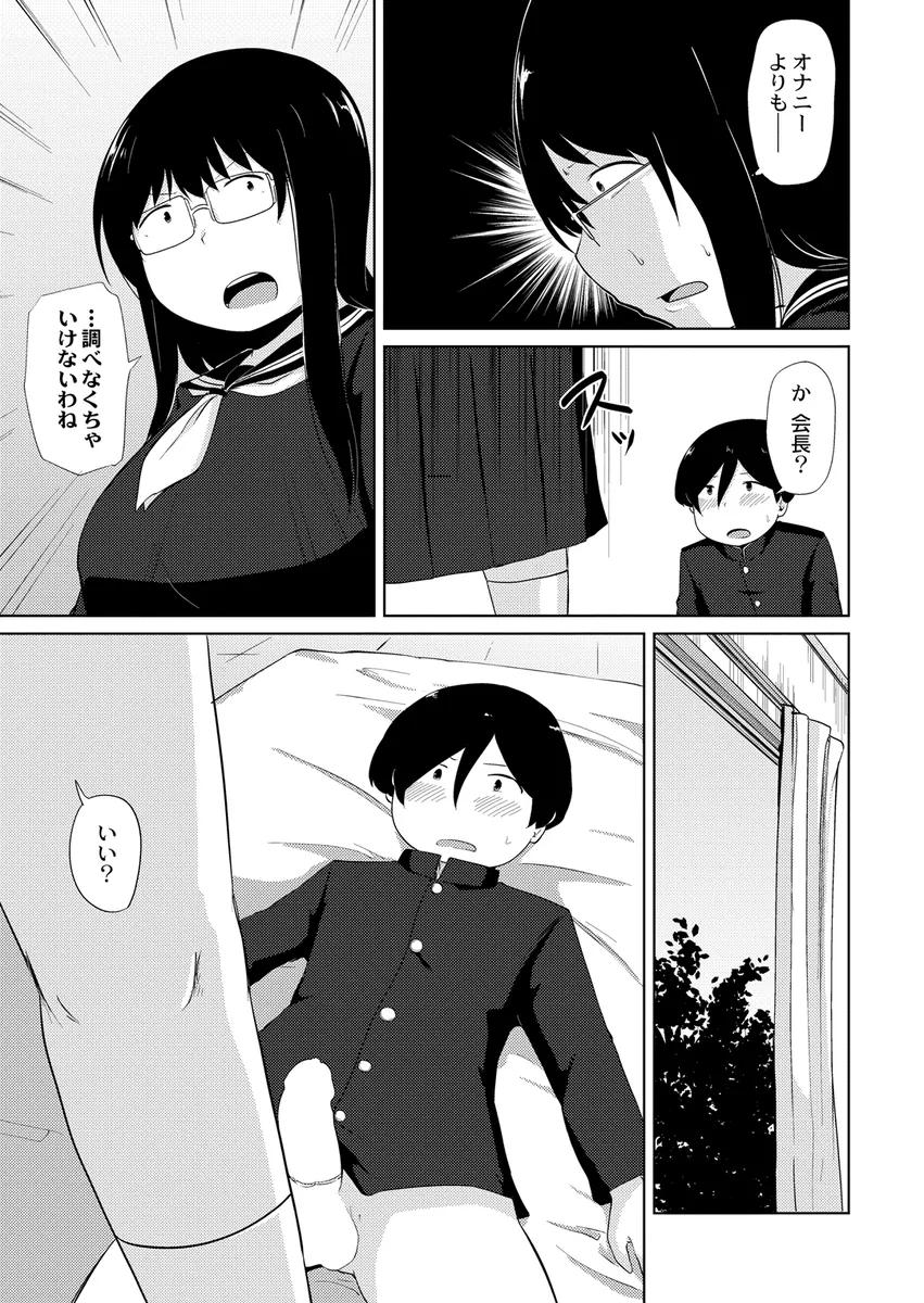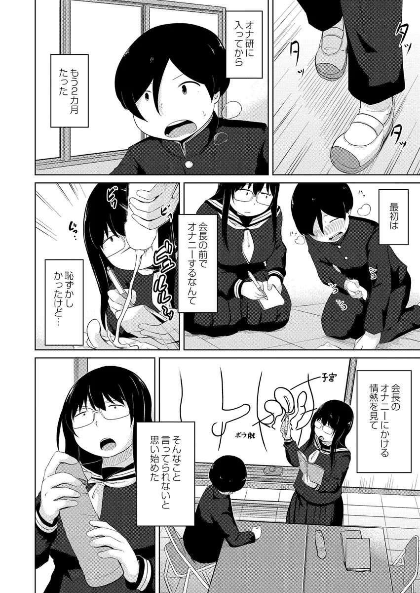 初めて見る女の子のオナニー、それに感動を覚えてそのままオナニー研究会に入った男子生徒。あれから二か月が経過。最初は会長の前でオナニーすることすら恥ずかしかった。今では、会長の前で射精することもなんとも思わなくなり、オナニーの研究に没頭している。今日は、壁にオナホールとディルドを取り付けてオナニーをする研究だ。しかし、取り付けた玩具が動いてしまいなかなかうまくいかない。そこで会長は丁度良いのがあったと言って、男子生徒のチンポを自分のマンコに入れてしまう。これはオナニーではなくもはやセックスだ。オナニーよりもセックスの方が気持ちいいことに気付いた二人は…。