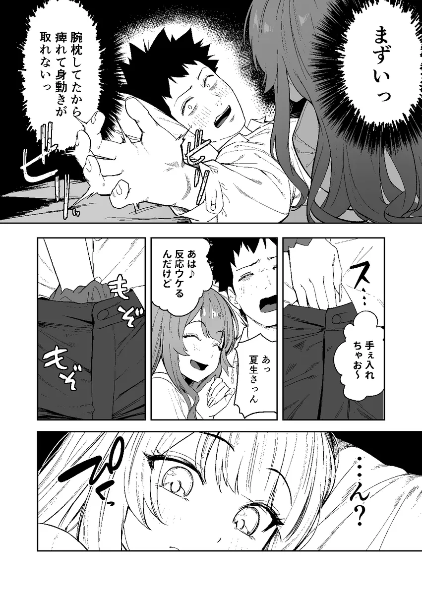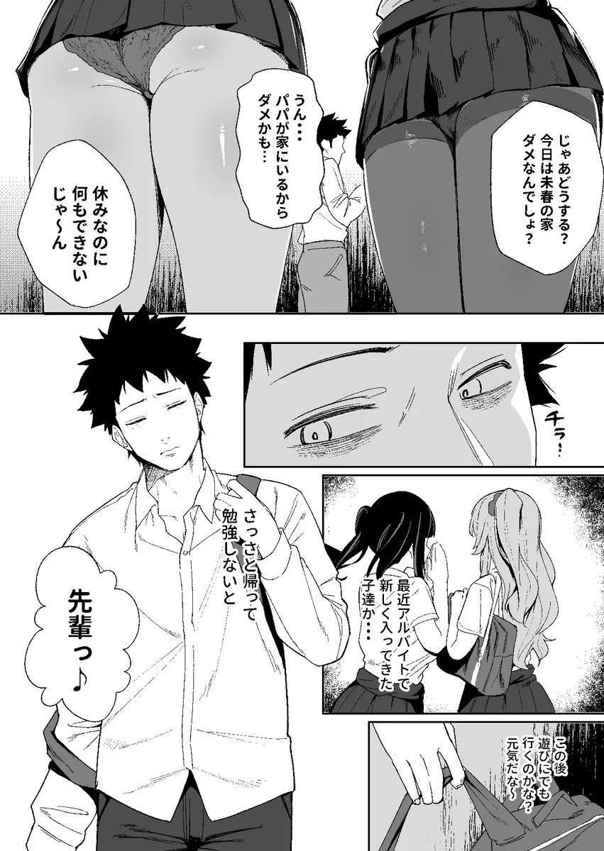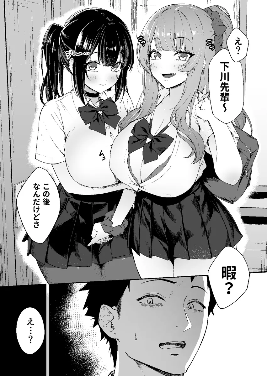 大樹は大学生に上京、少しでも学費を稼ぐために平日はネットカフェ、土日は運送会社でアルバイトをしている。貧乏な実家から仕送りを送ってもらうわけにはいかず、そんなこんなでバイト終わりは体が鉛のように重くなる。この日、新しく入った新人バイトのJK夏生と未春に声をかけられる。「下川先輩、このあとなんだけさ、暇?」結局大樹は二人を家に連れてきてしまう。大樹はお願いされると断れない性格なのである。大樹は二人を部屋に残し、自分の部屋で眠りにつくのだが、気が付くと二人に挟まれて添い寝されていた。そして、夏生にチンポが勃起していることがバレて…。