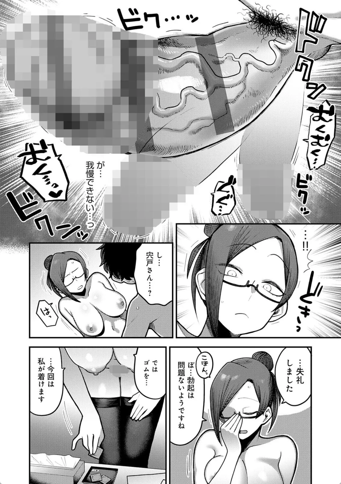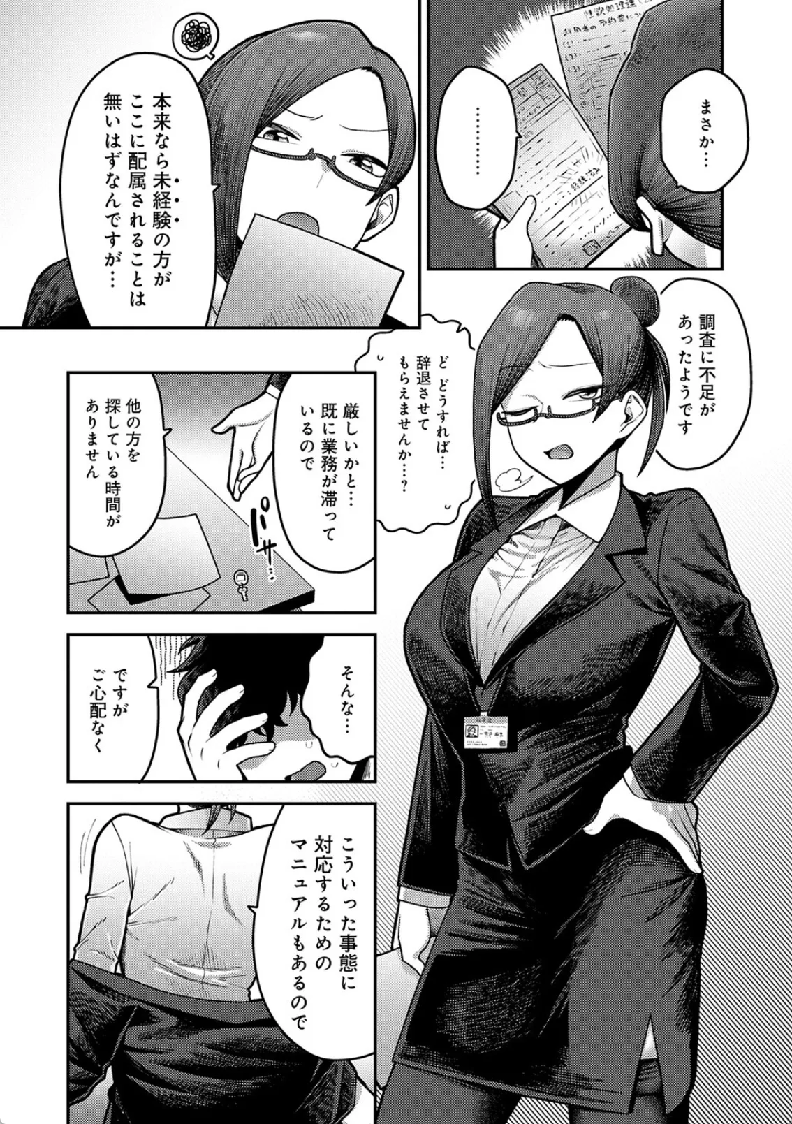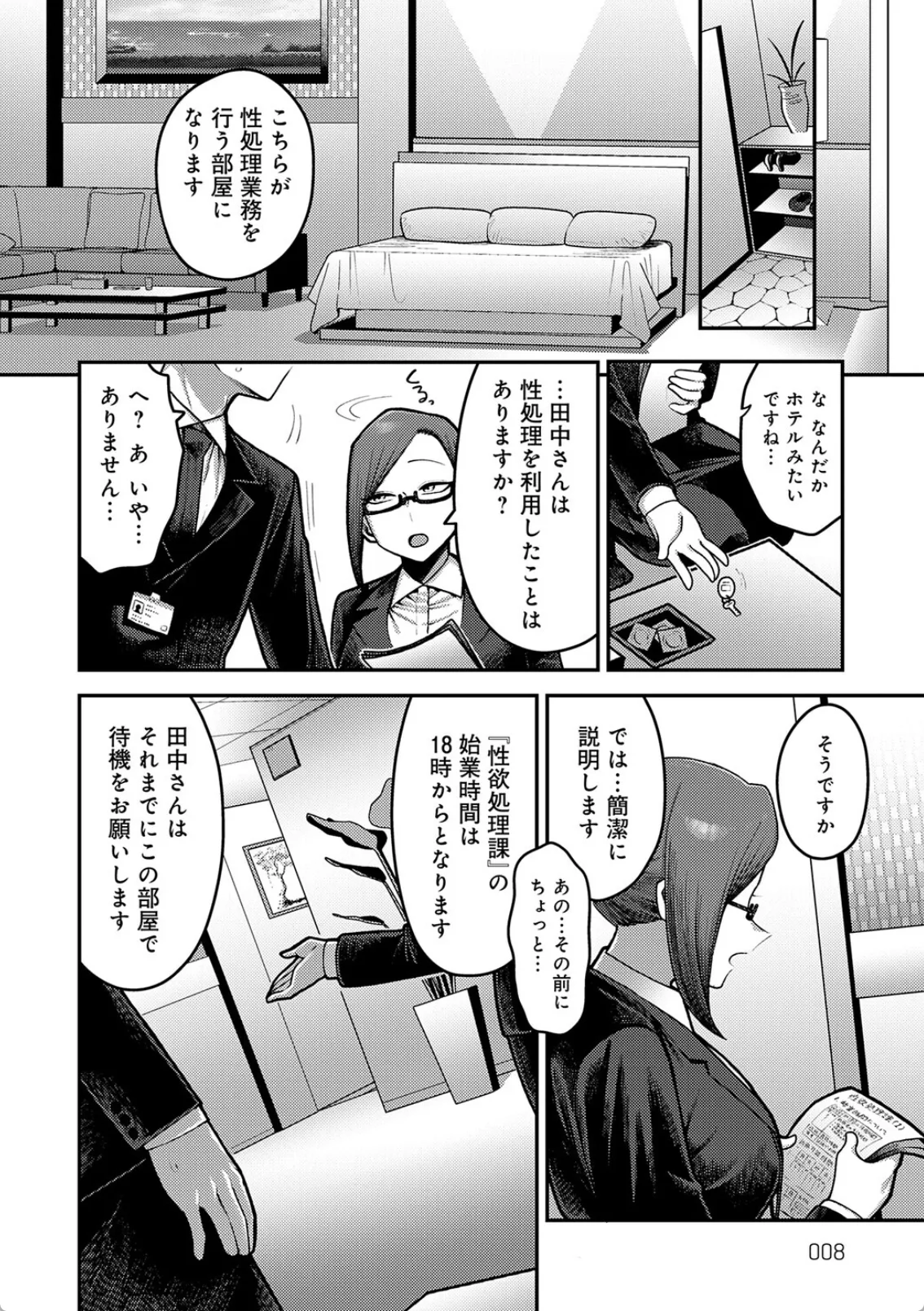 性欲処理課―。ストレス発散や業務効率アップなどを目的として一定数のある社員がいる会社には男女別の性処理室を設置することが義務付けられている。田中は就職して早々に性欲処理課に配属されるのだが、未だに童貞だった。そのためまずは性欲処理課補佐のOL宍戸とセックスの研修をすること。体臭、身だしなみをチェックされてゴムを装着。マンコを開いて入れる位置を確認しながらチンポを突っ込む田中。田中は童貞故にすぐイってしまうも、勃起がおさまらない。田中は絶倫チンポというやつだった。研修を早々に終了して、続けざまに宍戸の性欲を処理するためだけの生セックスをすることになり…。
