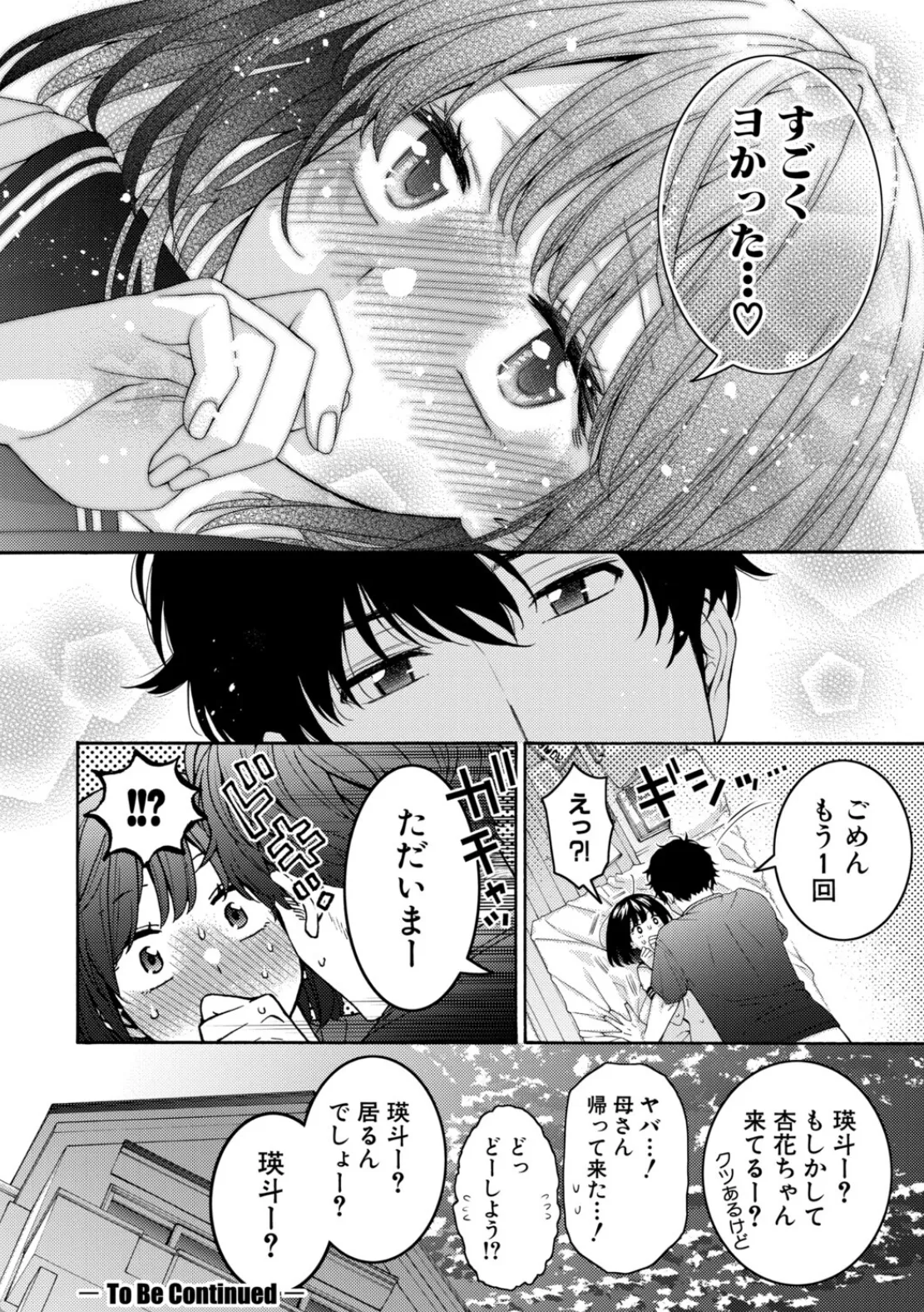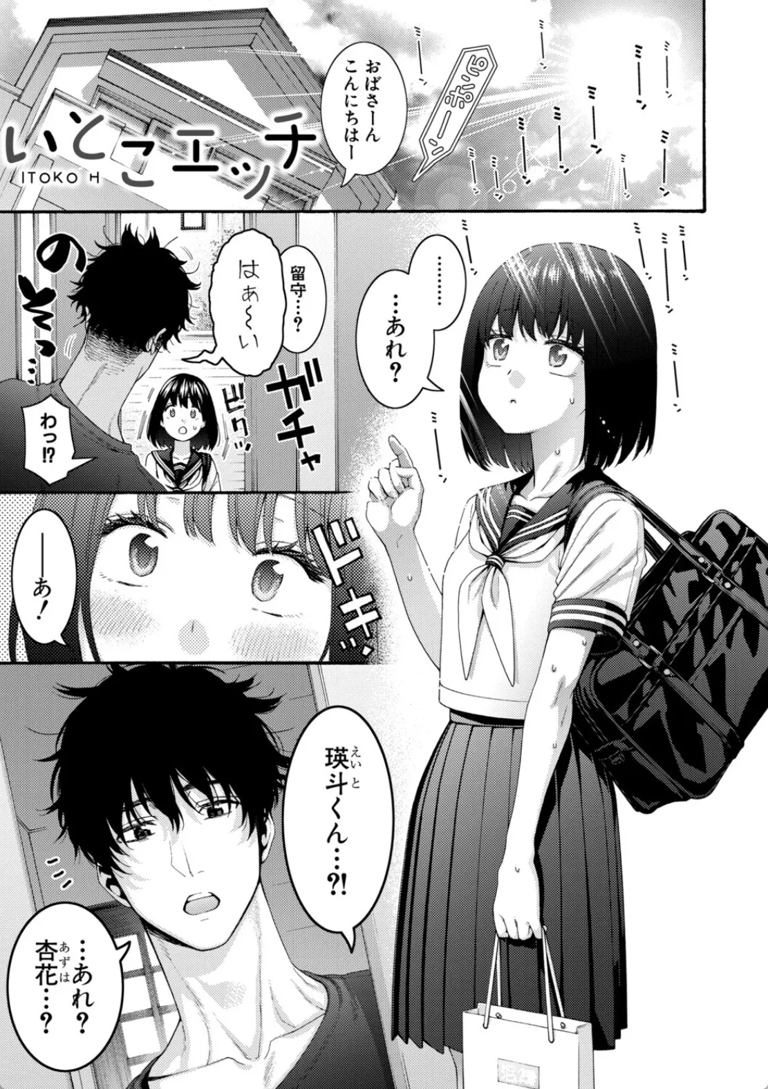 瑛斗の家に従妹の杏花が家族旅行のお土産を持ってやってくる。外は暑いからと、とりあえず家にあがらせてもらった杏花だったが、リビングのエアコンは故障中で瑛斗の部屋へ。瑛斗は飲み物を買いに外へ。瑛斗の部屋に一人残った杏花は瑛斗のベッドの匂いをオカズにオナニーを始める。激しい角オナニーを腰をへこつかせて絶頂する杏花。しかし、それを戻って来た瑛斗に見られてしまう。杏花はその勢いで瑛斗に告白。返事は意外にもOKだった。瑛斗もずっと杏花の事が好きだったのだ。瑛斗は最初こそゴムはしていたものの最後は生のまま杏花にマンコに挿入して中出しを繰り返す…。