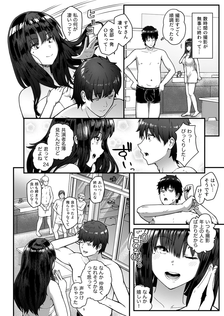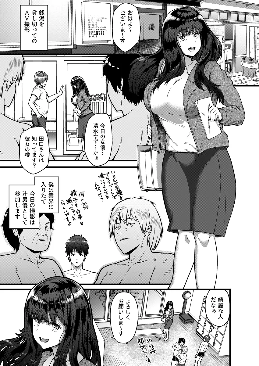 銭湯を貸し切ってのAV撮影。その撮影にたくみは汁男優として参加する。AV女優は清水すず。彼女は一見清楚に見えるも、裏で男優を喰いまくっていた。この日、たくみは無事にザーメンをすずにぶっかけて撮影を終える。するとすずの方からご飯に行こうと誘われるたくみ。しかし、連れてこられたのはラブホだった。すずはたくみのデカチンポに一目惚れしてしまったのだそう。たくみは早速チンポをしゃぶられすずの口の中に射精。すずもこんなデカチンポは初めてらしい。膣を無理やりチンポで広げられる幸福感は何物にもかえ難い。そして、すず愛用の首輪をつけて…。