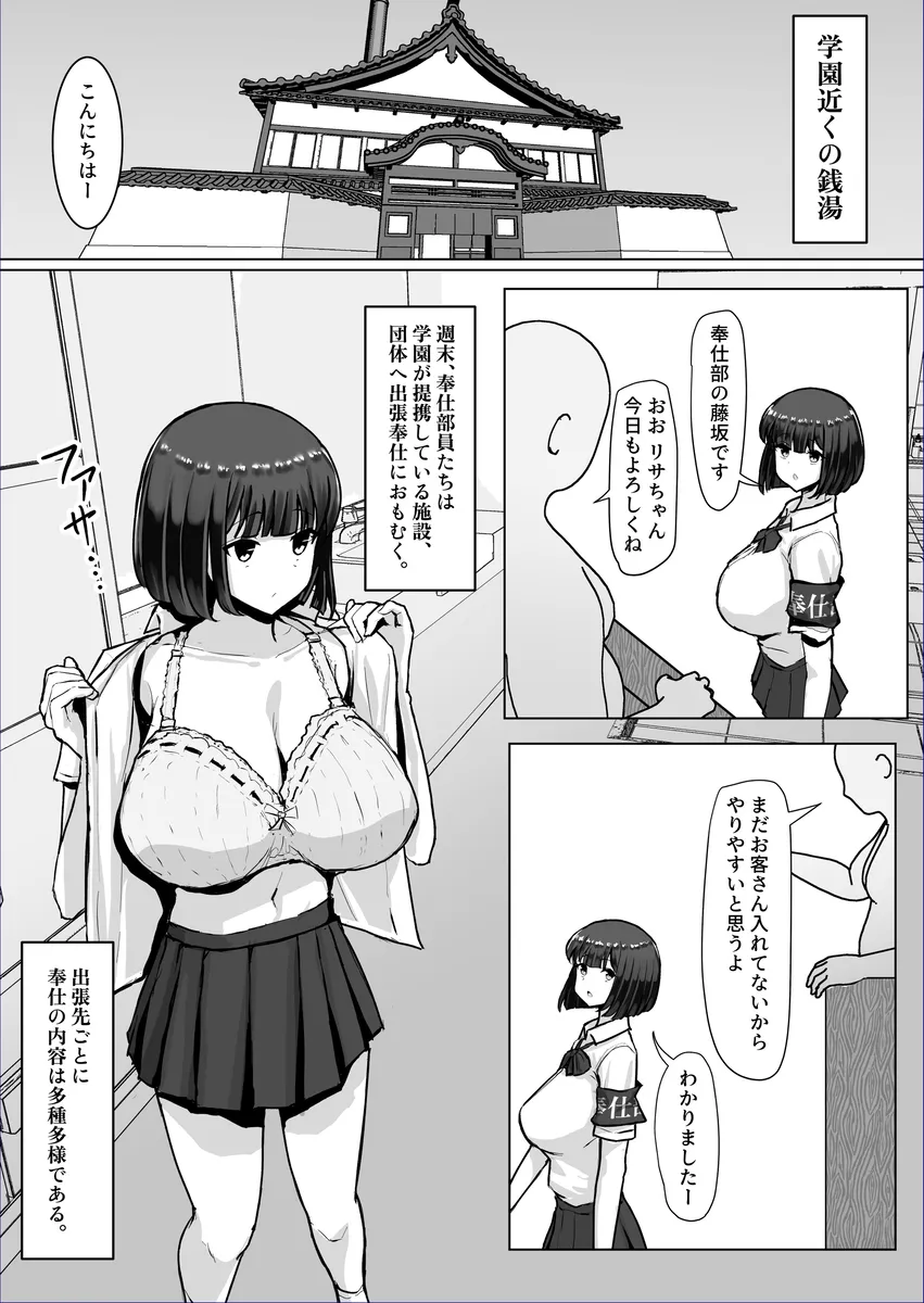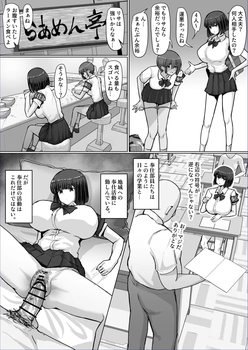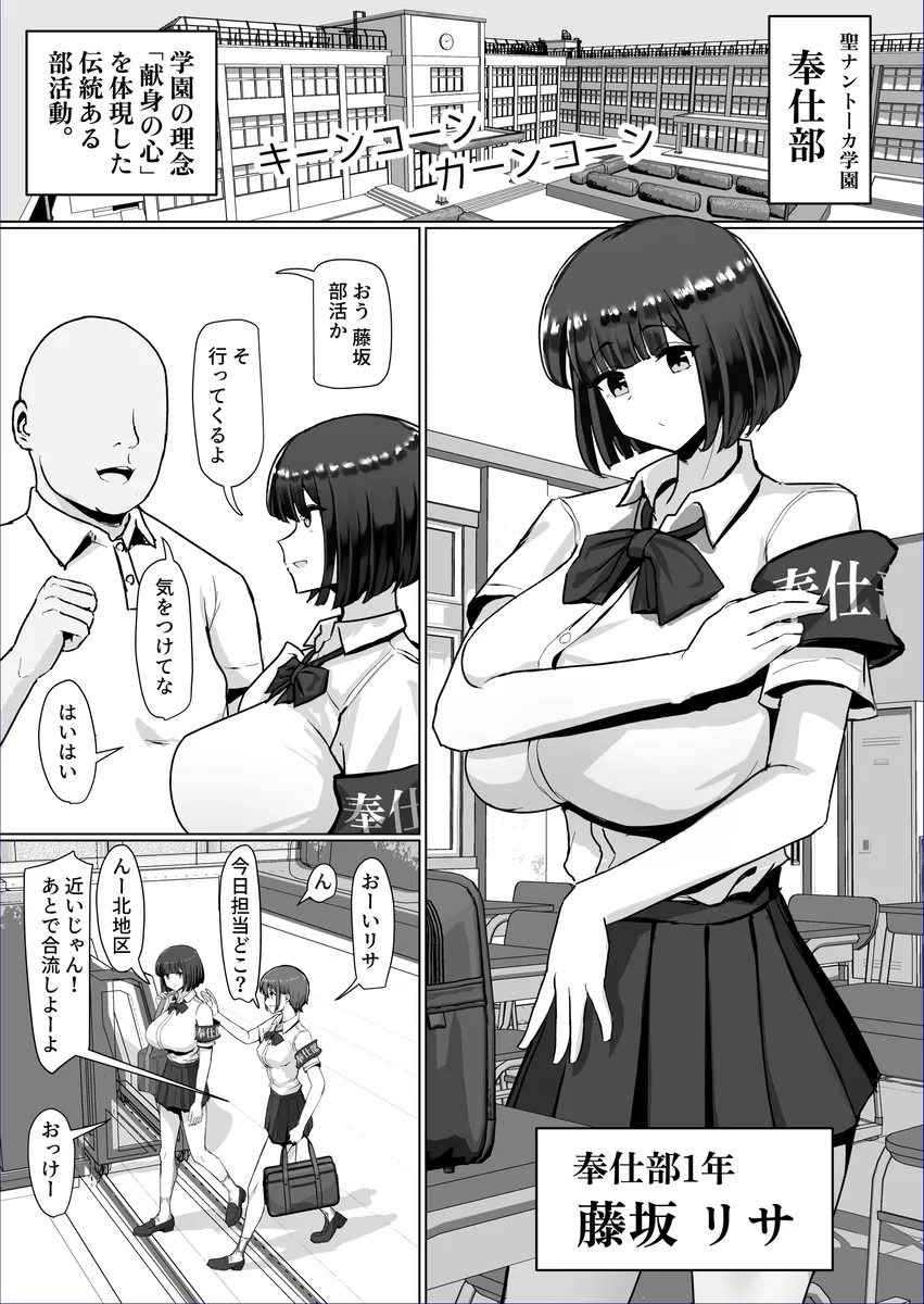 JKの藤坂リサは奉仕部に所属している。奉仕部とは地域の方々に性的なご奉仕することを目的としている。学園と地域が連携しており、円滑にご奉仕が行えるようにラブホなどの施設は無料で利用できる。今日も呼んでくれたおじさんにラブホで生セックスご奉仕するリサ。生セックスは部の規則となっているらしい。ダウナー系のリサはチンポで突かれるもほぼ無表情で中出しフィニッシュ。奉仕部は予約分のご奉仕が終われば帰宅することができる。しかし、帰宅中にご奉仕を求められれば必ず応じなければならない。呼び止められたリサは裏路地で今度は青姦して…。