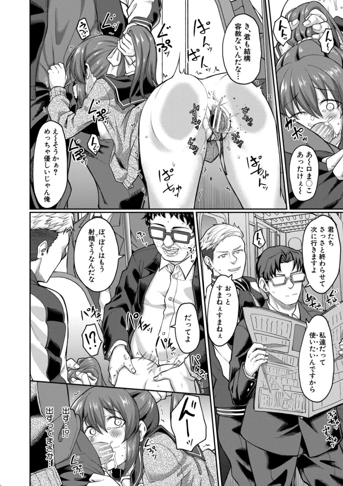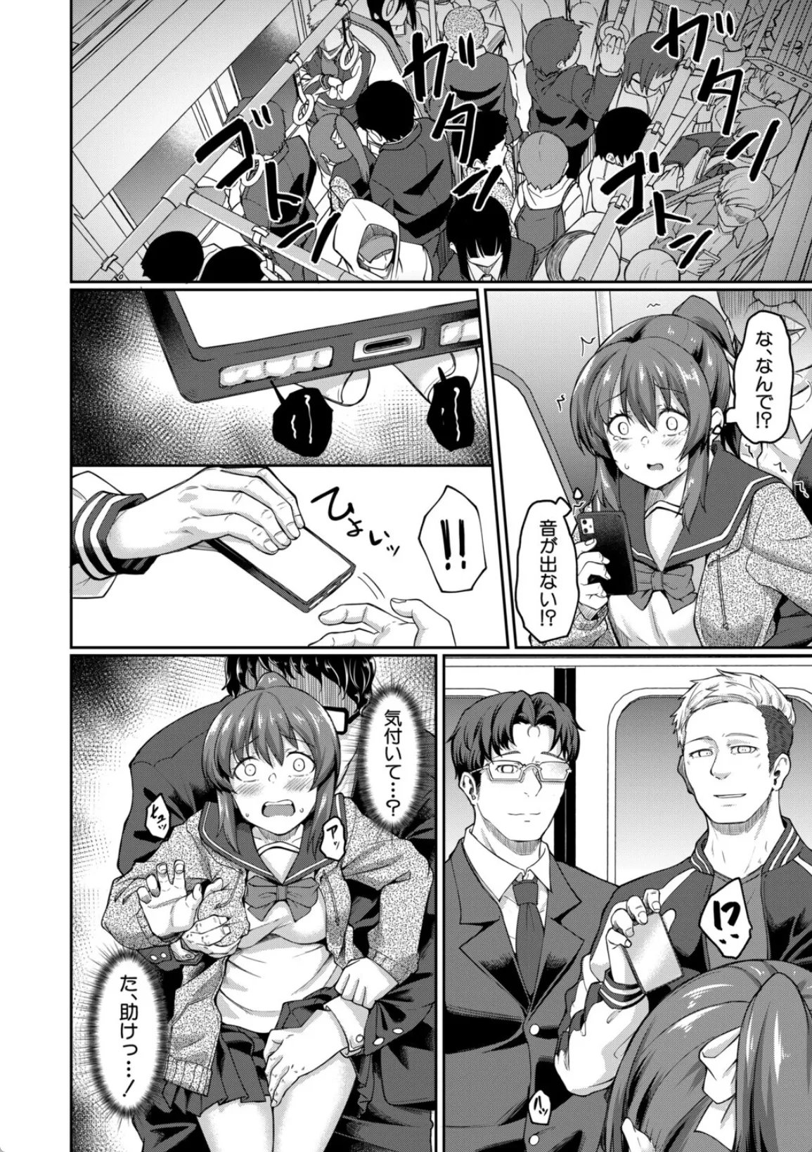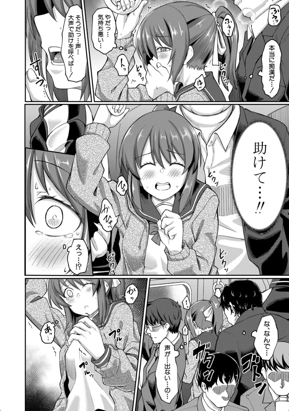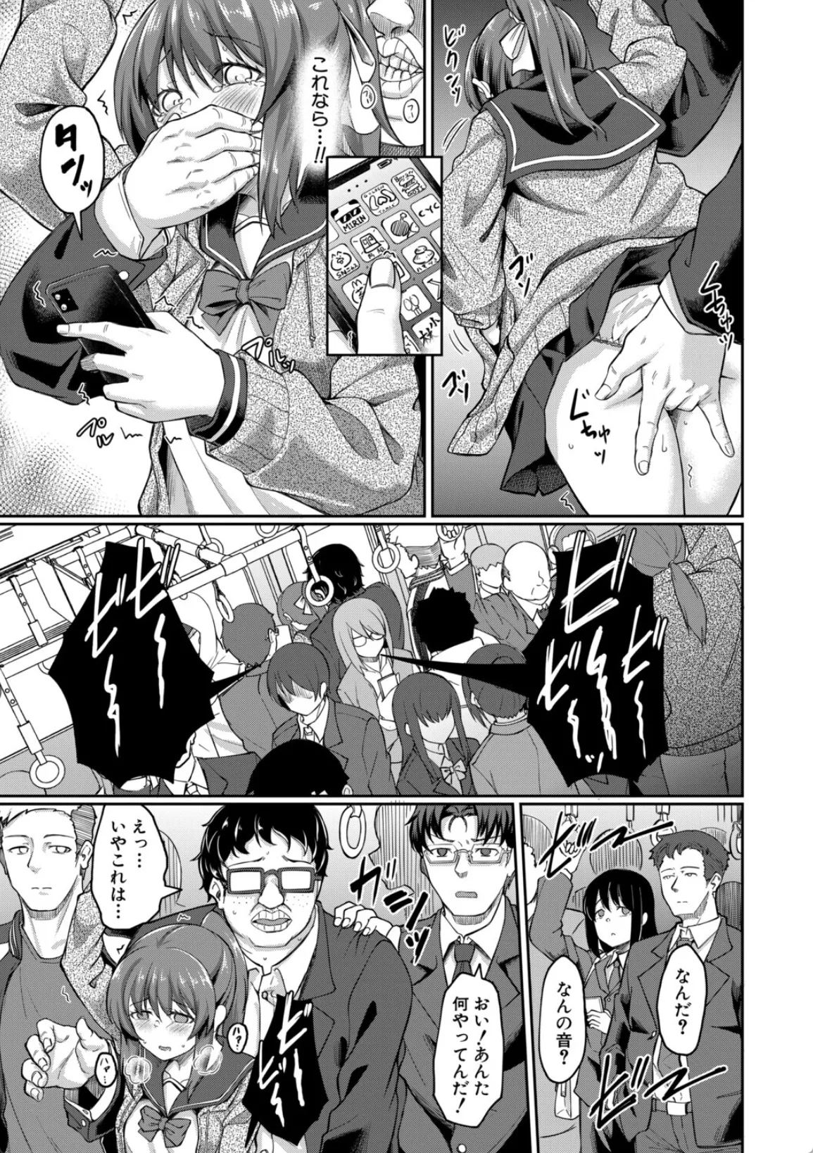 しのぶは、友人に痴漢対策として防犯アプリを勝手に入れられる。この日まで、まさか自分が痴漢に遭うなんて思ってもいなかったしのぶだったが、その日、初めて電車の中で尻を触られるという痴漢被害に遭ってしまう。そのアプリを使ってブザーを鳴らしその場はなんとかなったのだが、その日の下校中の電車の中でまた同じ男に遭遇する。仲間を引き連れて来た男に今度は集団痴漢されてしまう。しのぶはチンポで処女膜を貫通され、チンポを口に咥えさせられる。中出しと口内射精の同時フィニッシュから、下車したあとにトイレに連れ込まれて…。