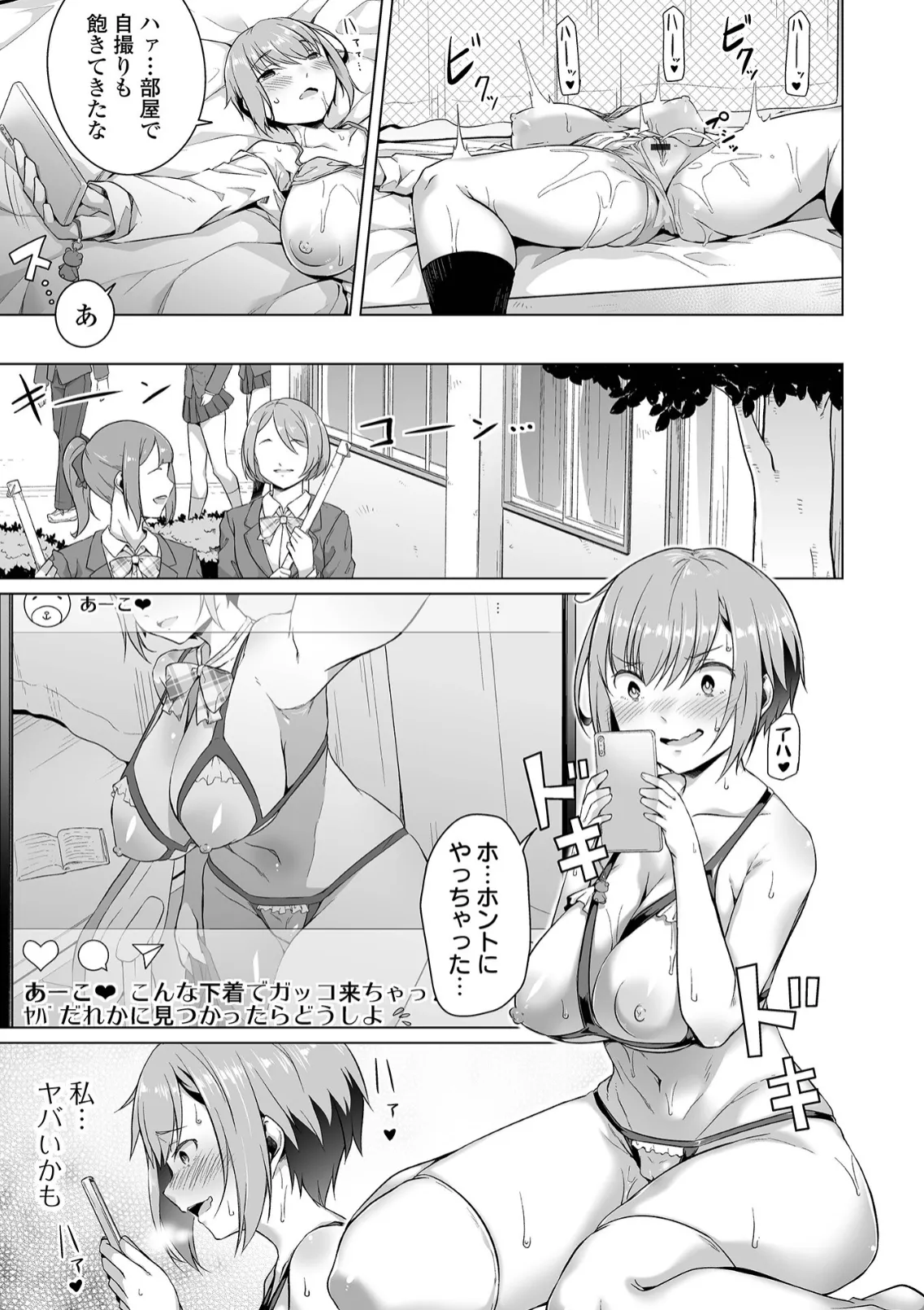 爆乳JKアラタとたもつは幼馴染。学校では仲が良くてよく付き合っているんじゃないかと疑われている。しかし、たもつはアラタのことを全く女として見ていなかった。しかいアラタの方はとっくの前に意識しており、たもつとの写真をオカズにオナニーをする日々を過ごしていた。アラタは自分に女としての価値があるのか知りたくなってエッチな裏アカを始める。自宅で自撮りしたエッチな画像をアップし始めるアラタ。次第にもっと刺激が欲しくなり、この日、学校でエッチなつけた写真をアップする。これが運の尽きだった。その裏アカが他の男子生徒にバレて…。