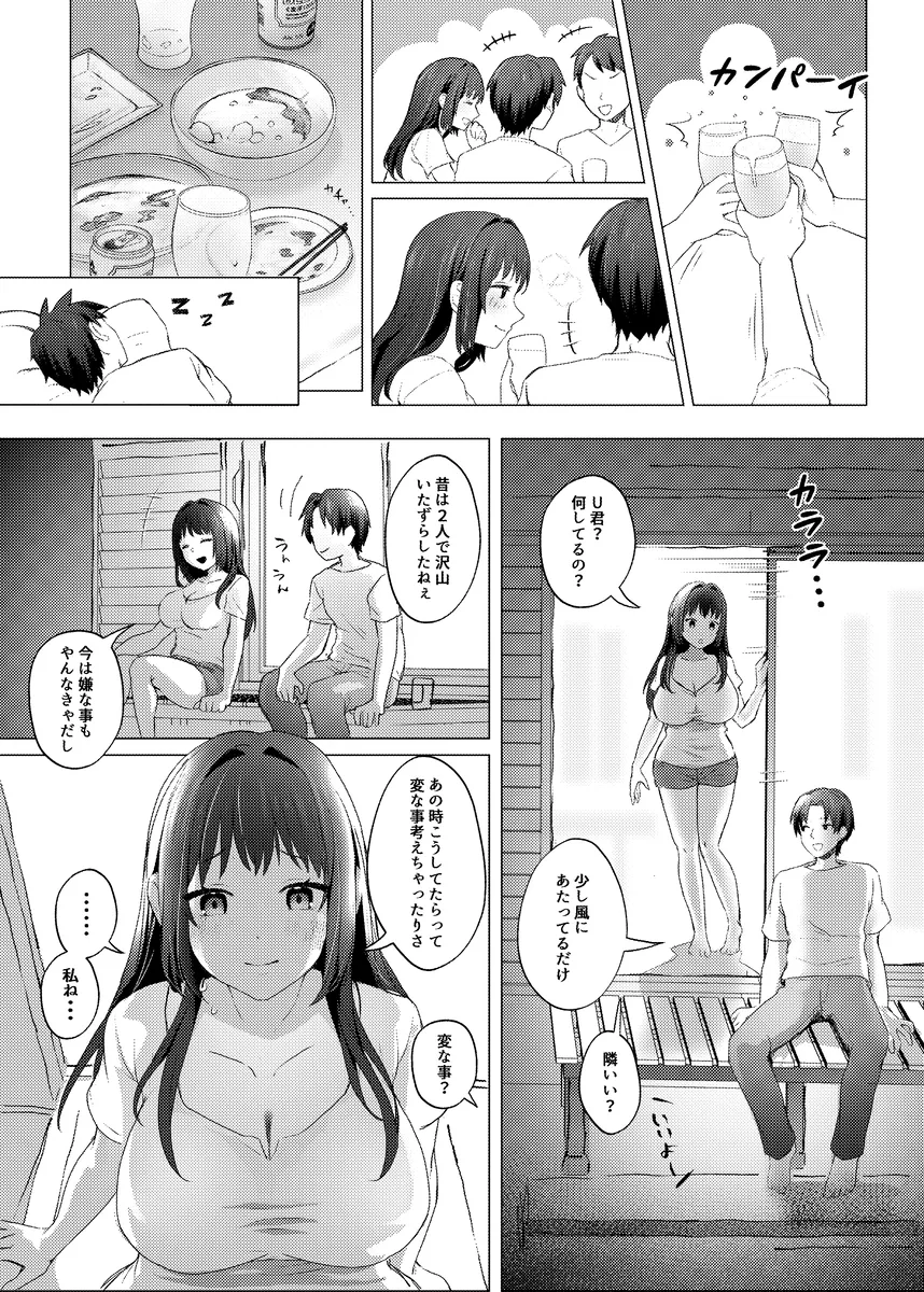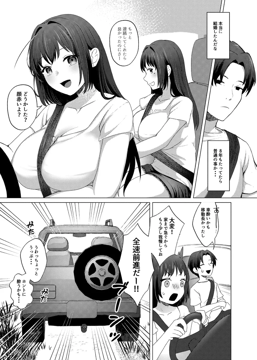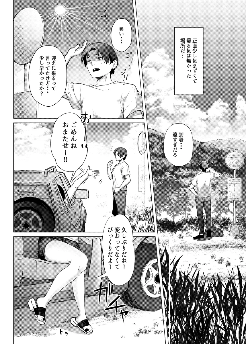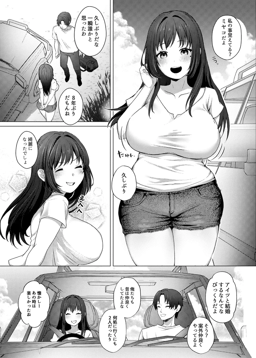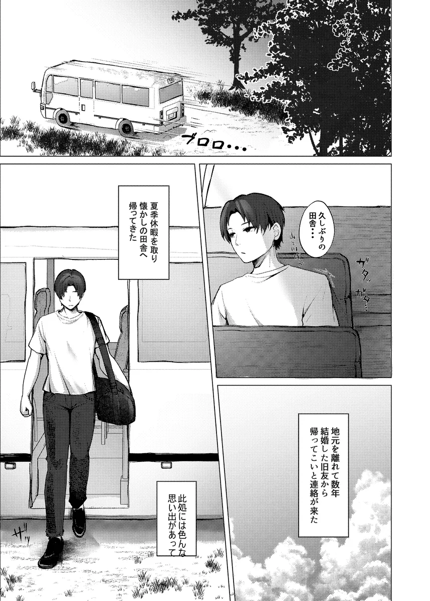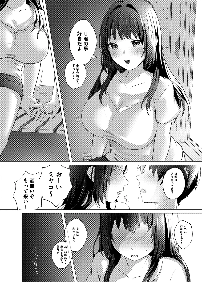 地元を離れて数年、結婚した級友から帰って来いと連絡がきた。そこで夏季休暇を利用して久しぶりに田舎の故郷に帰って来た男。田舎のバス停に着いて車で迎えに来てくれたのは旧友の妻ミヤコだ。ミヤコと会うのは8年ぶりである。今夜は三人でミヤコの家で飲む約束をしている。その日の夜、久しぶりの再会を祝い、飲み終えてベランダで涼んでいるとミヤコがやってくる。そこで思わぬ告白をされる。ミヤコはずっと自分の事が好きだったらしい。どうして自分を選んでくれなかったのか。二人は両想いだったのだ。そして、寝ている部屋にミヤコが勝手に入って来て…。