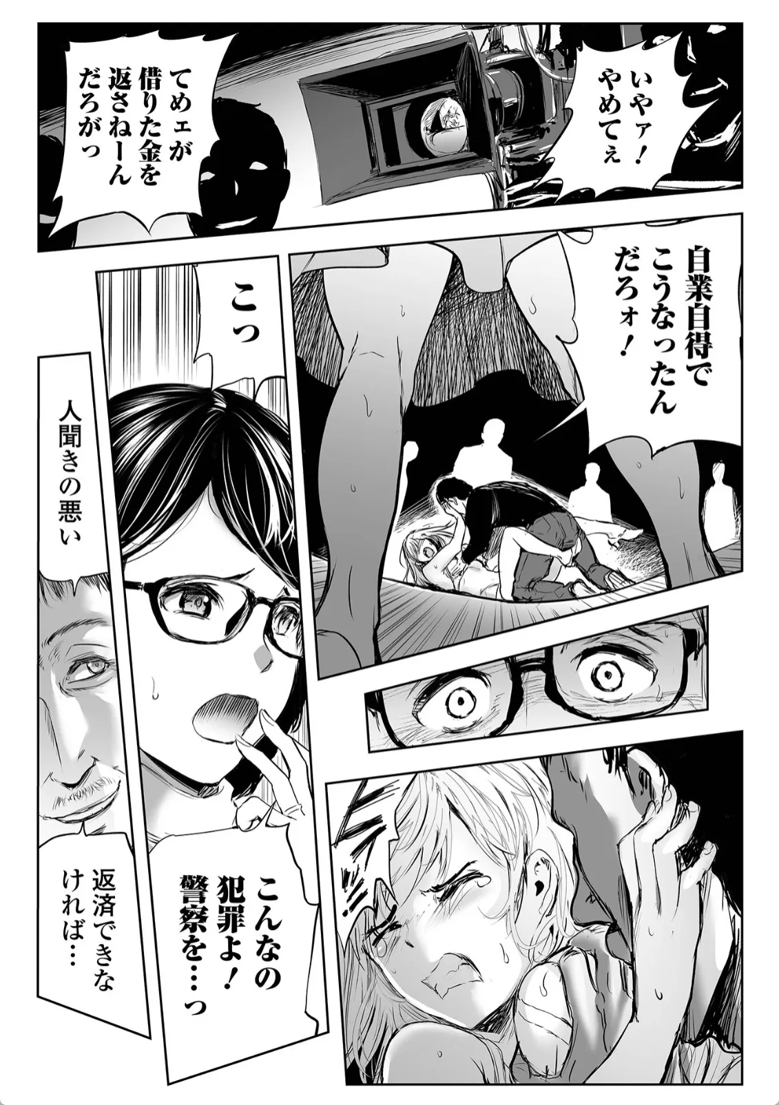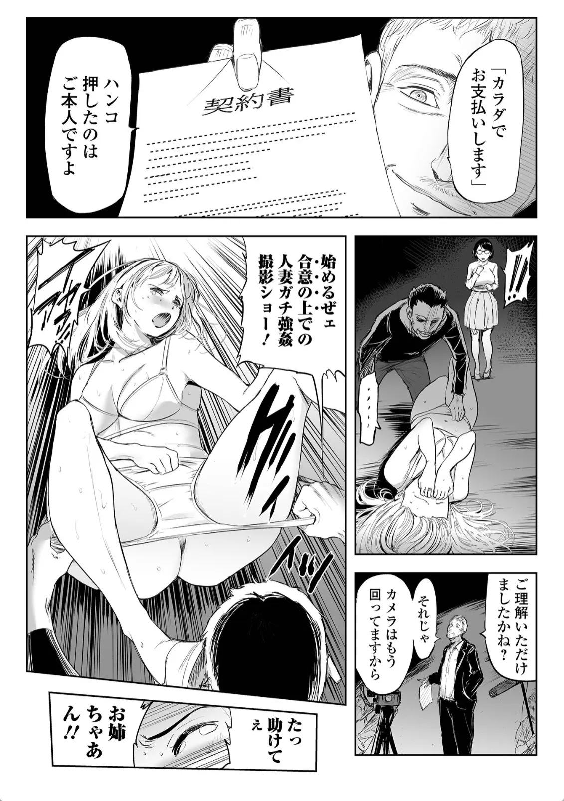 借金一千万円を背負ってしまった妹。妹はそのことを姉に相談していると、借金取りがやって来て二人を連れ去る。妹は契約書に支払えなければ体で返済することに同意済みだった。犯されそうになる妹を庇って姉は自分が身体で返済するという。借金取りたちは妹の前で姉を犯し始める。そんな状況であるにも関わらず姉のマンコは濡れていた。ズコバコ突かれて中出しアクメを決める姉。そこへ妹が割って入って今度は自分が姉を守るという。姉妹サンドで仲良くアヘ顔アクメ。結局この姉妹はヤられたがりの変態姉妹だった―。