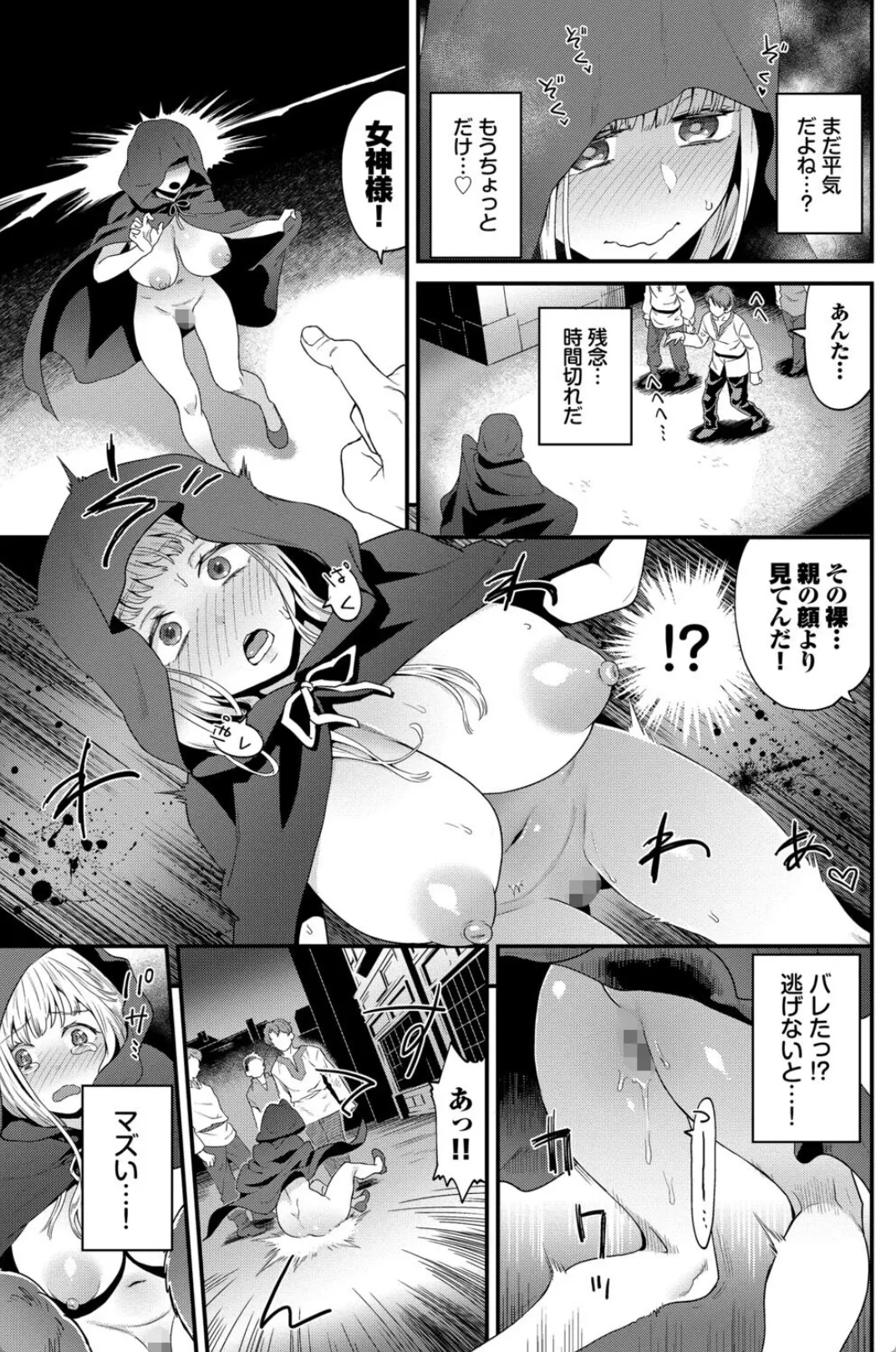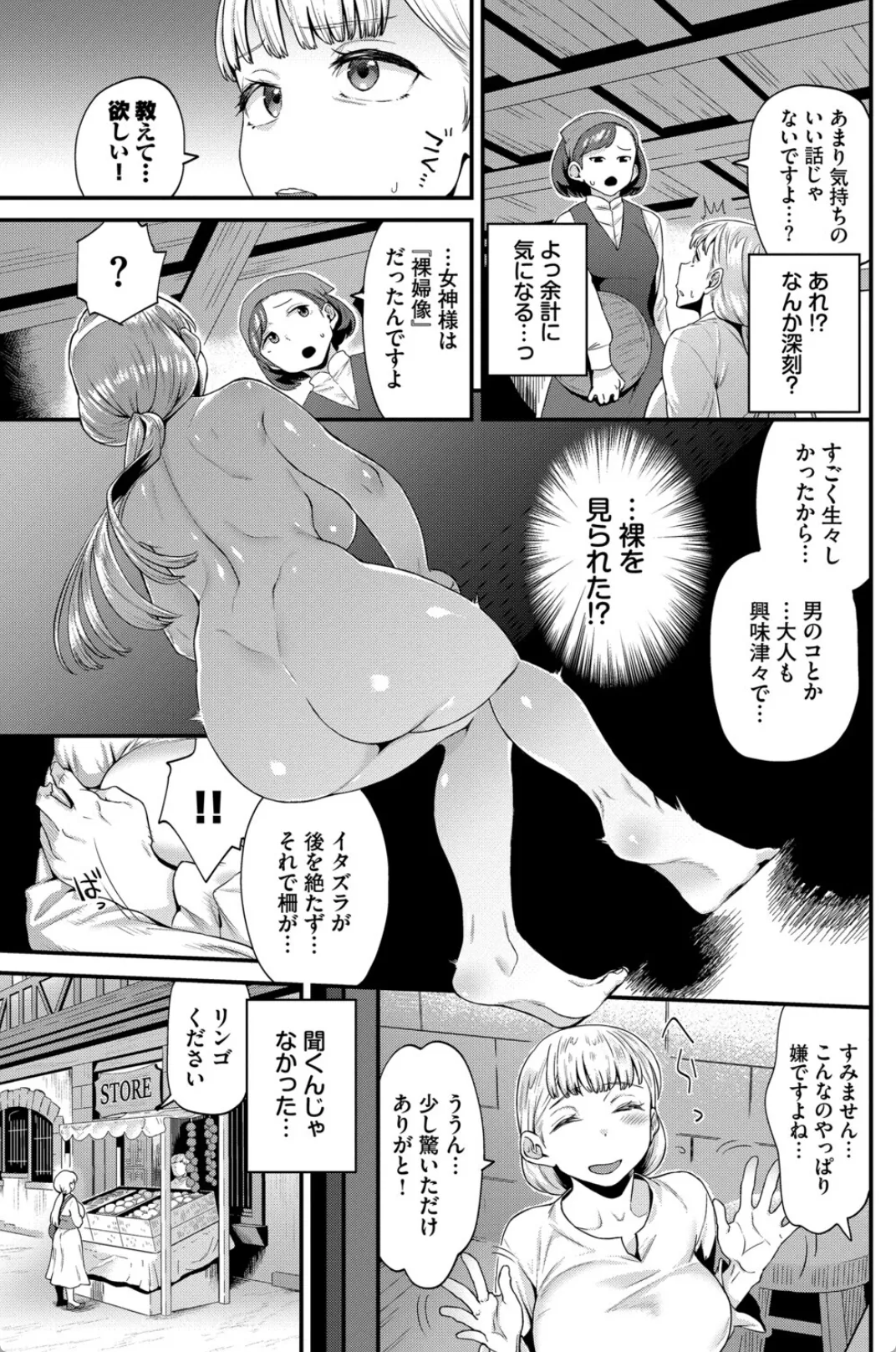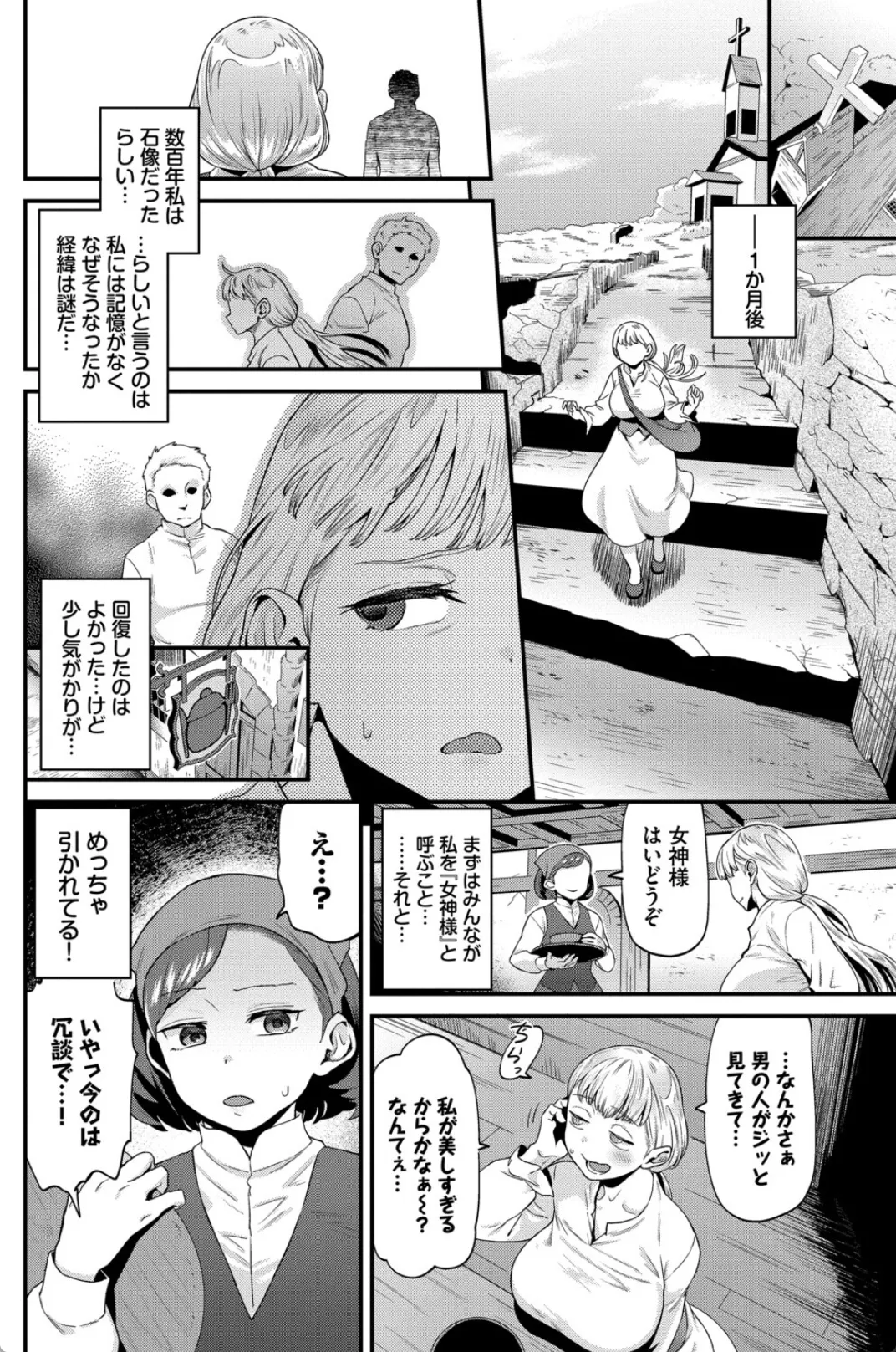その女は石像だった。街のシンボルで裸婦像として日々人々の目にさらされていた。しかし、ある日突然石像から普通の人間の女の子に戻ってしまう。服を着るようになった今も街の人は皆その女の裸を知っているため好奇な目で見られていた。女は、それに興奮したのか、人に見られているのを想像しながらオナニーに耽る。そして、その夜見られたい欲求が止まらなくなり、道端で全裸露出してしまう。男たちは裸を見てそれがすぐに女神像の女だということに気付く。そのまま路地に連れ込まれてチンポをハメられ中出しされる女。女はチンポの快楽を教え込まれただの変態女に―。