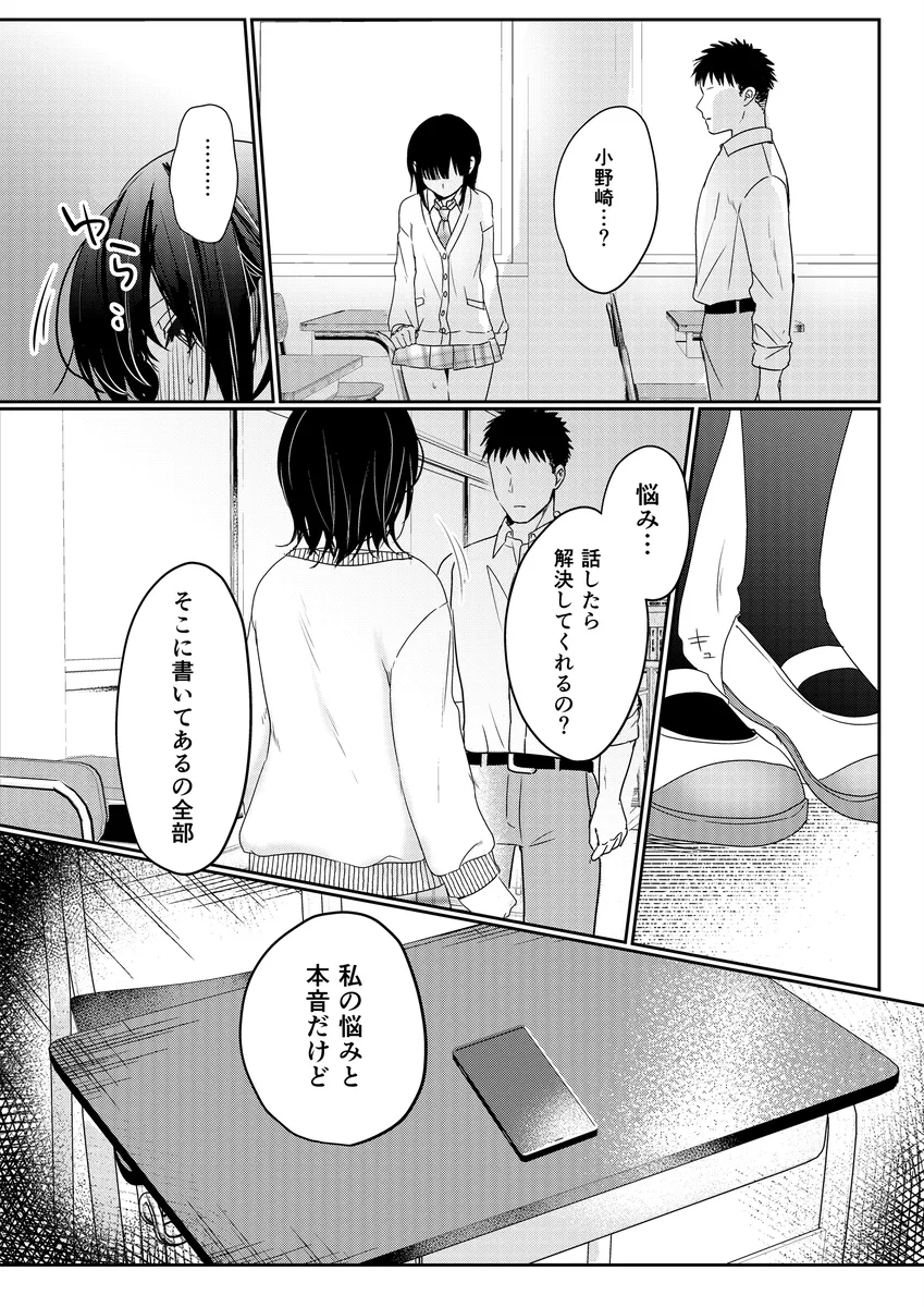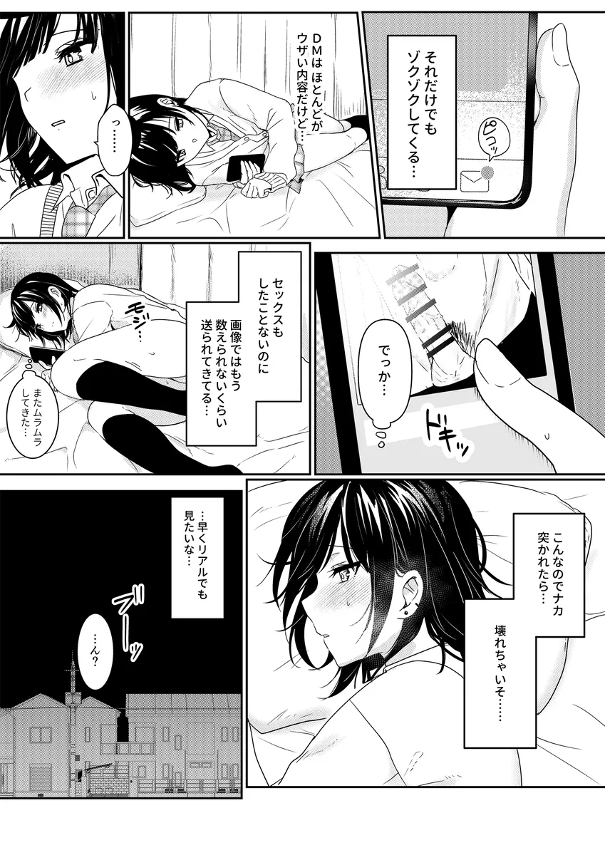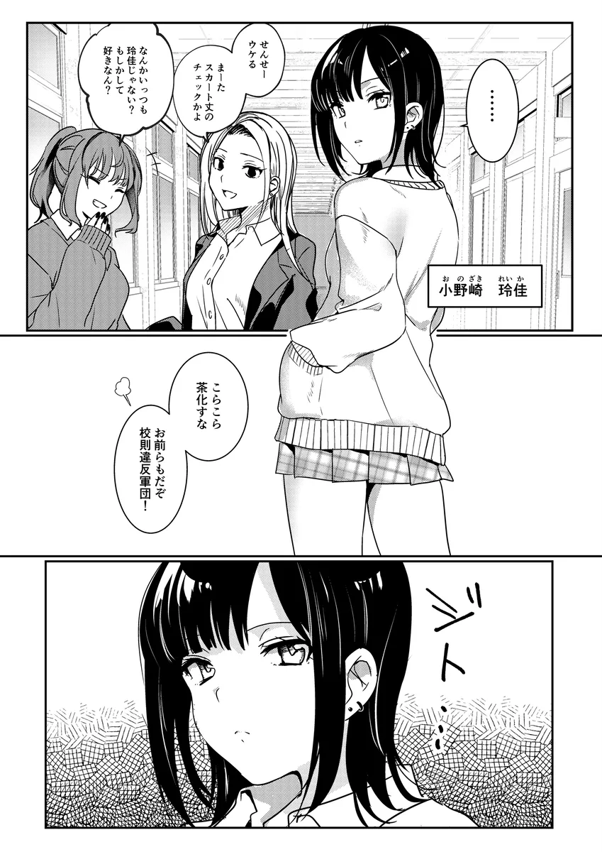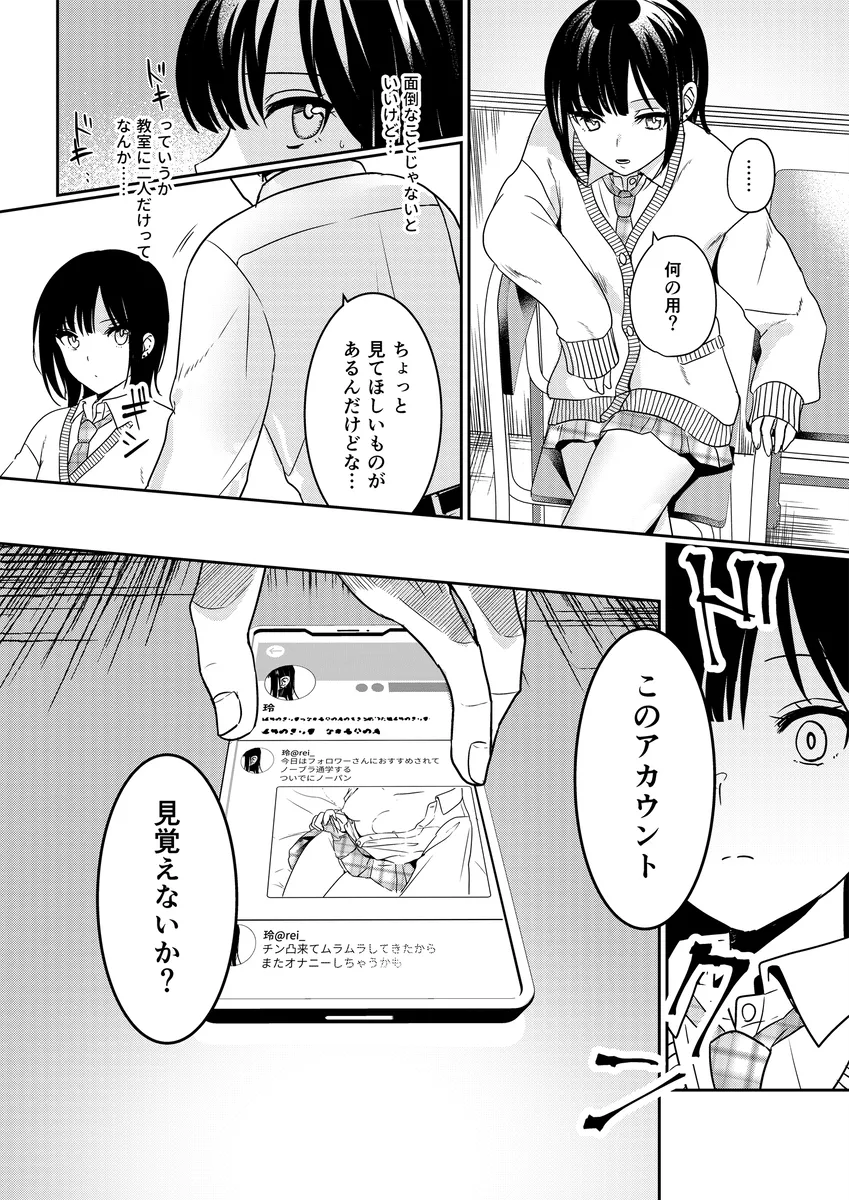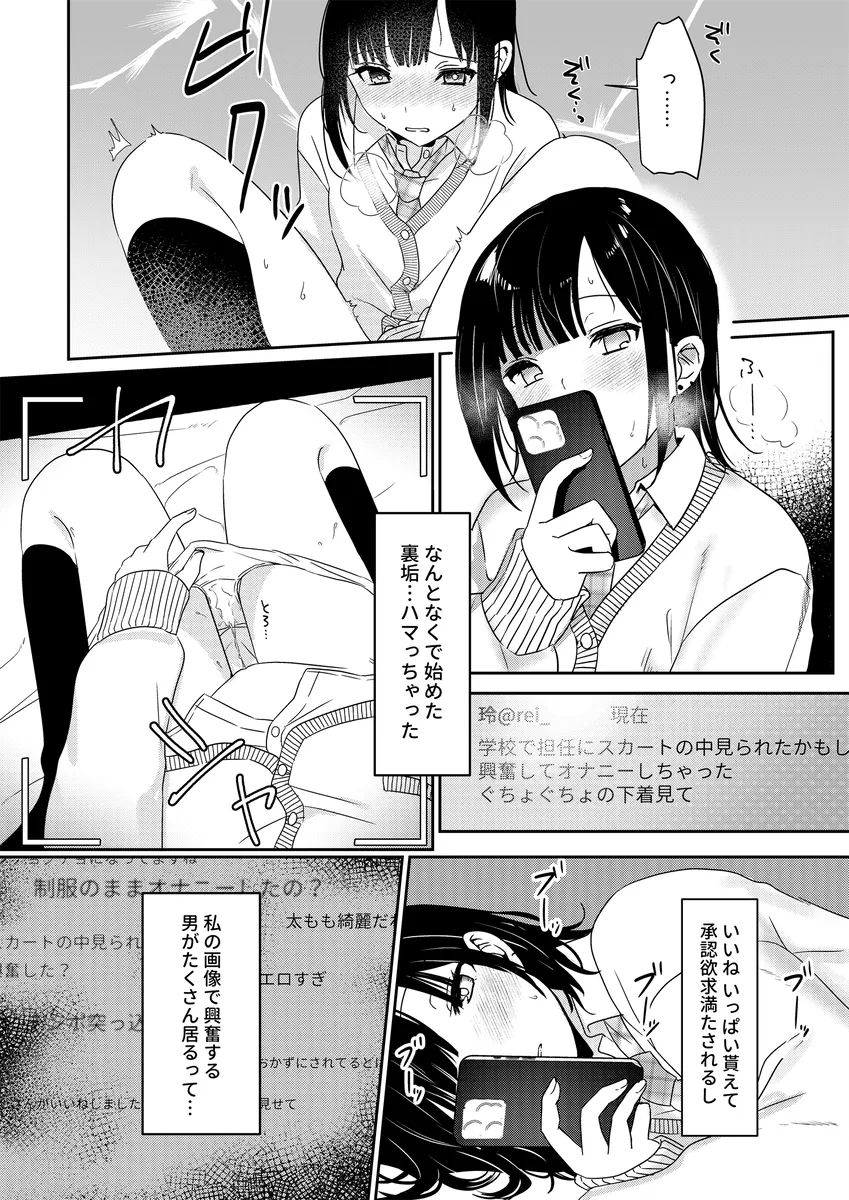小野崎玲佳は友達と学校の廊下を歩いていると先生にスカートの丈の短さを注意される。ジト目で先生を睨みつけて「キモ」と一言。ツンツンな玲佳だが、実はこの時興奮していた。玲佳は家に帰って妄想オナニーに耽る。ぐちょ濡れになった下着を裏アカにアップ。みんなからいいねを貰って承認欲求も満たされる。自分のエッチな画像でこんなに興奮してくれる男の人がいるなんて、それだけでもマンコにキュンキュンくる。DMで送られてくるチンポ画像で玲佳はさらに興奮する。そして翌日、玲佳は先生に呼び出される。裏アカがバレてしまったのだ―。