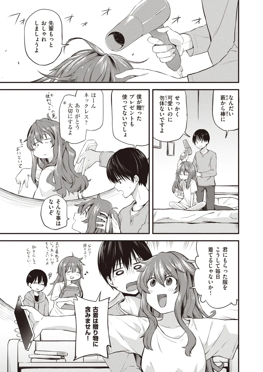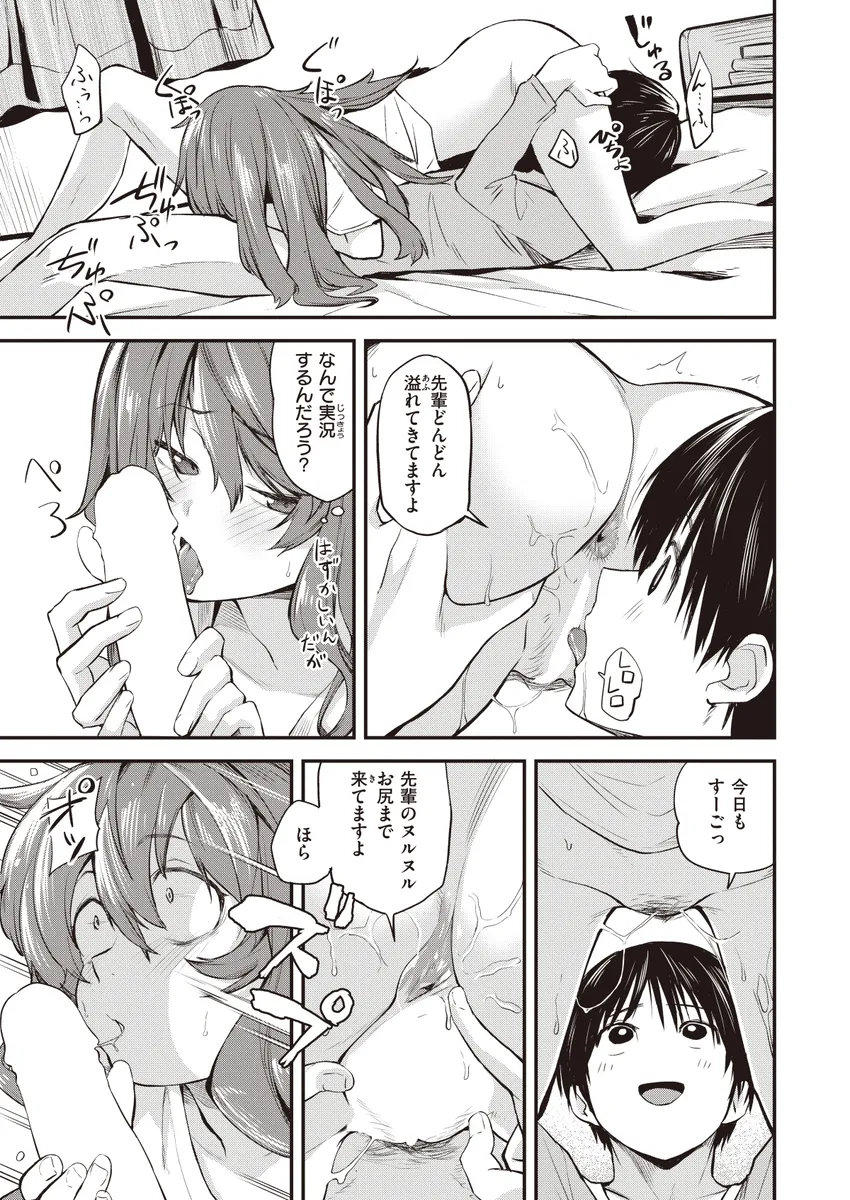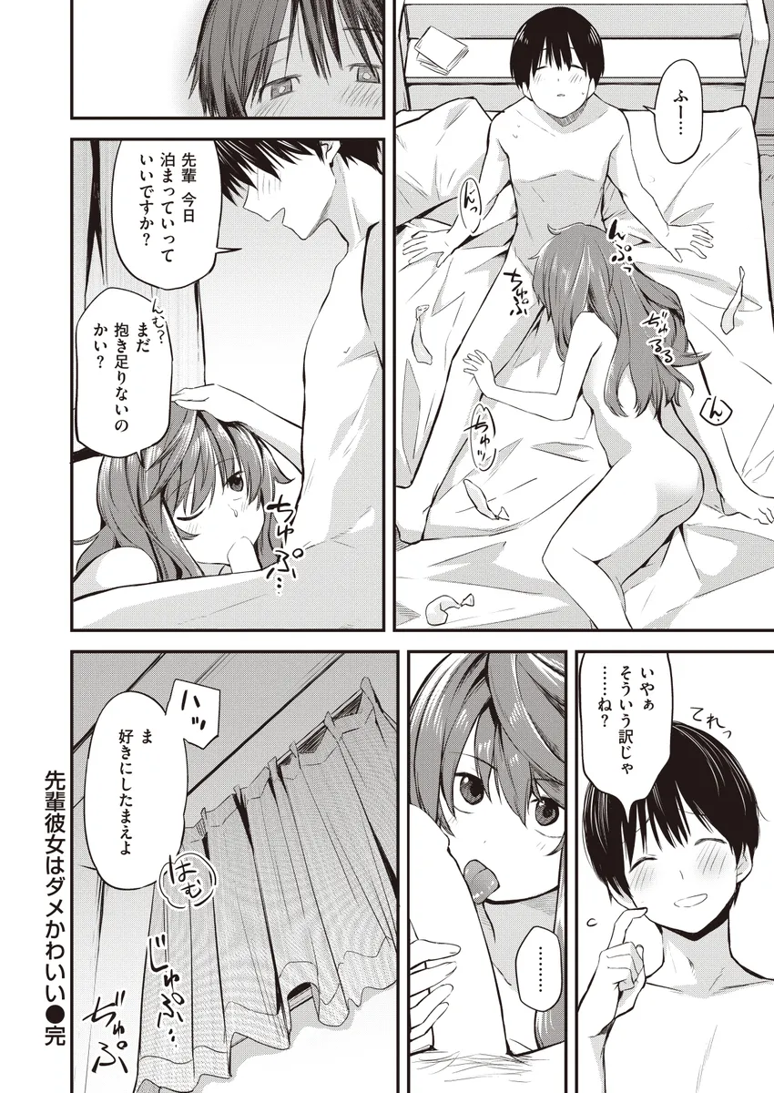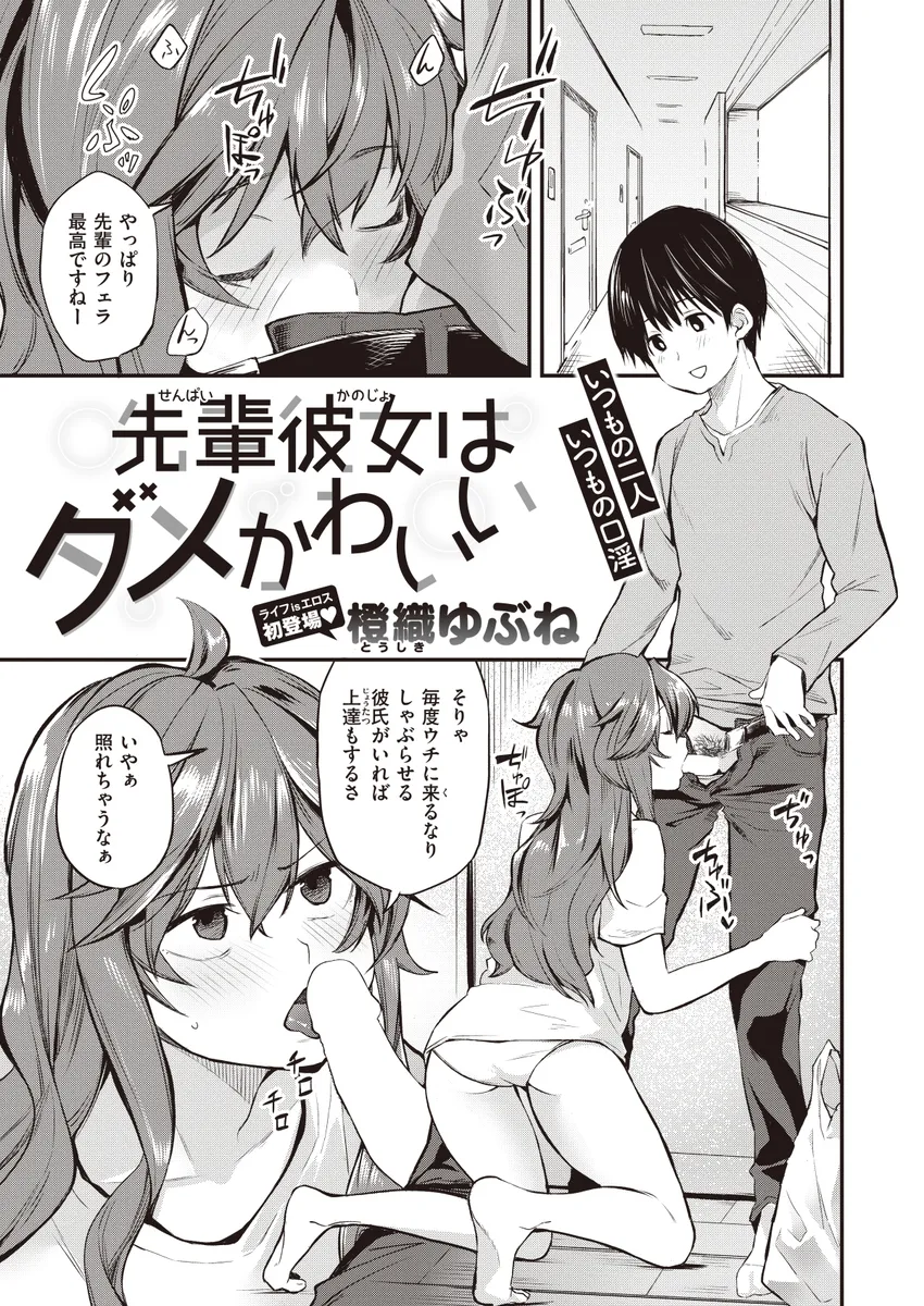 彼女の家にくるなりチンポをしゃぶらせる彼氏の若宮。どうせこの後お風呂に行くのだからと最初の一発目はためらわず大量顔射。先輩彼女と付き合ってもう一年になる。こうして家にやって来ては、家事ができないダメ彼女に代わって若宮が家事をしている。今日の夕飯はオムライスだ。そして、食べた後はお待ちかねのエッチタイム。ベッドにごろんと寝転んでまずは前戯の手マンから。さらにシックスナインでおまんこを広げてちんしゃぶ&クンニ。溢れるマン汁を一滴残らず舐めとってチンポを挿入。結局朝までエッチコースが決定して…。