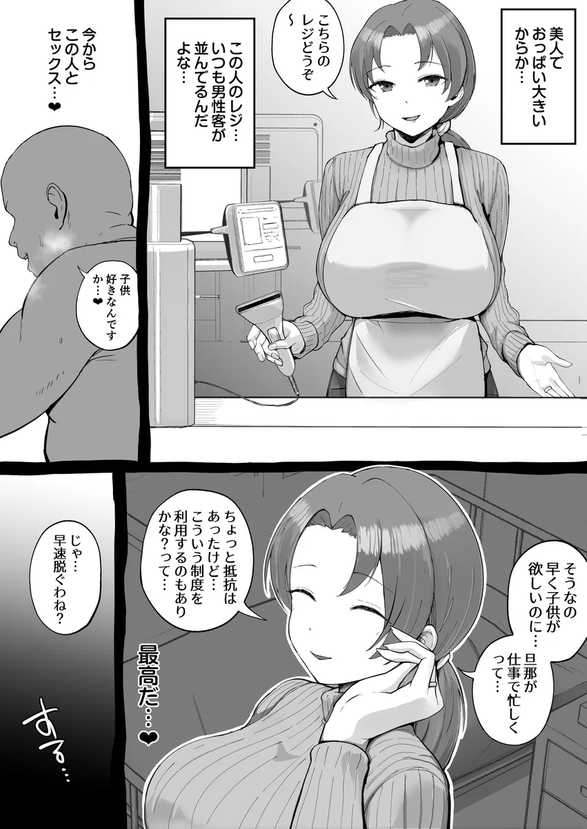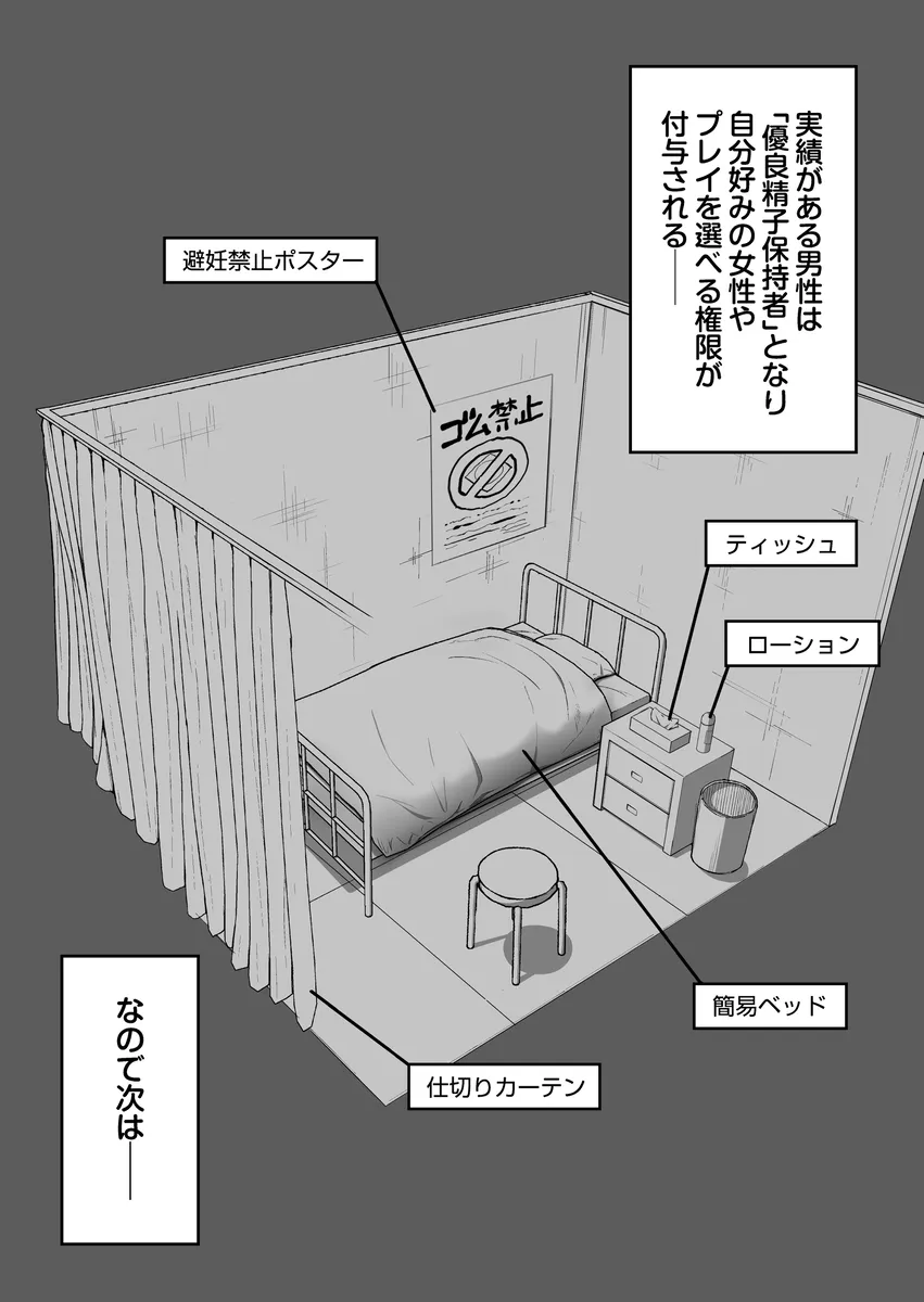少子化と性犯罪を解決すべく政府は新たな政策を執り行った。地域妊娠推進法、大型施設に交尾室を設けて地域の妊娠率向上を図る政策だ。大型モールで行われた抽選会に当選した男。当選すると大型モールに併設された交尾室で女の子とセックスができる。呼ばれて交尾室に入るとそこにはIカップの爆乳JKみいながいた。まさにドストライク。制服をたくし上げた瞬間甘くてフルーティな香りに包み込まれる。おまんこを開くと穴の周りに処女膜が張られている。男は躊躇なく中年チンポをマンコにぶち込んで処女膜を突き破る。本能に任せて腰を打ち付ける激しい交尾で最後は…。