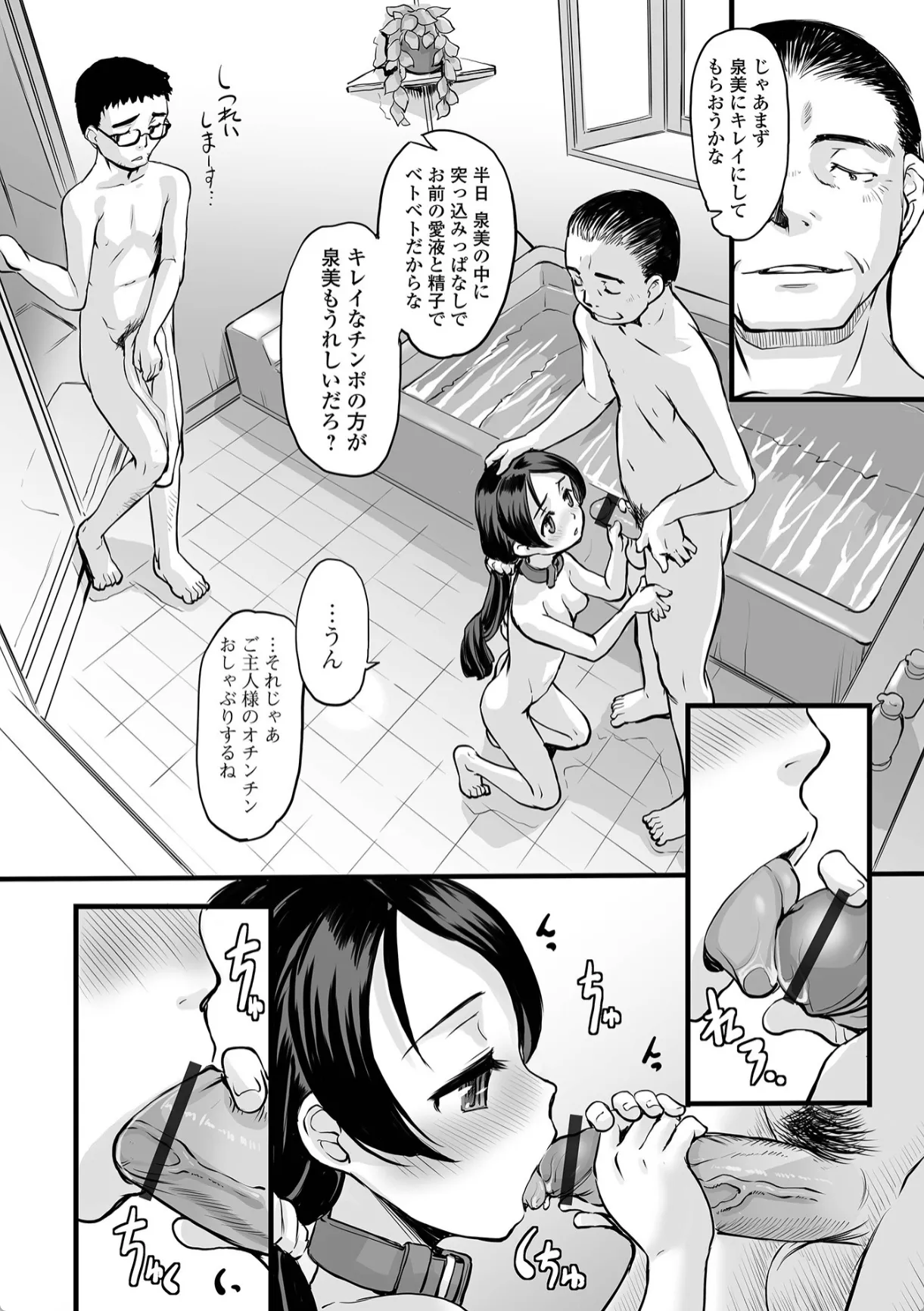 泉美は小路の肉便器になってもう一カ月が経つ。両親だと思っていた人は小路に雇われた一般人だった。育てのママは小路から金を貰ってどこかへ逃亡、パパは未だに小路に雇われており、今も一緒に暮らしている。小路はいつものように泉美に一発中出しした後風呂場へ。風呂場の脱衣所はパパが使用中だった。どうせなら一緒に入らないかということで3人で風呂場へ。パパの目の前で小路のチンポをしゃぶる泉美。パパはそれを見て欲情。そして、アナルにチンポを入れられてアナル中出しされ…。