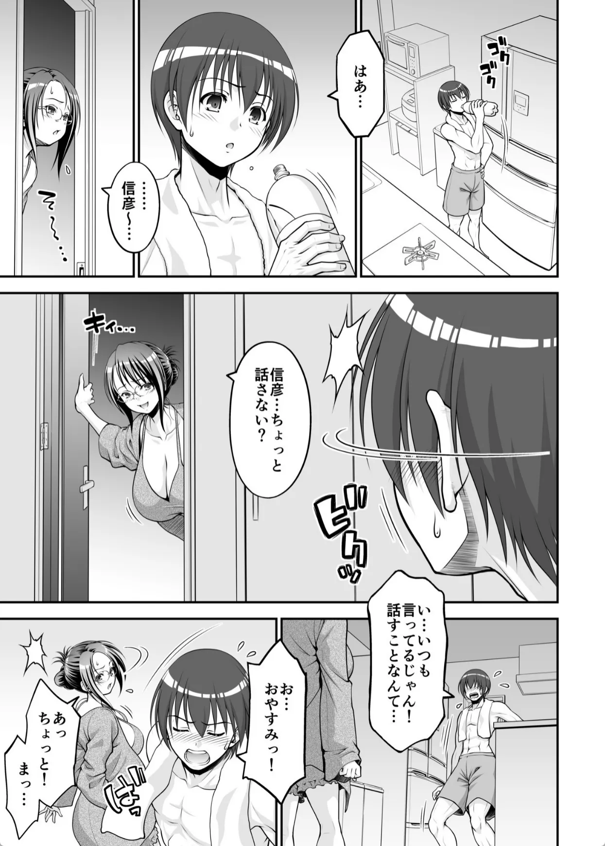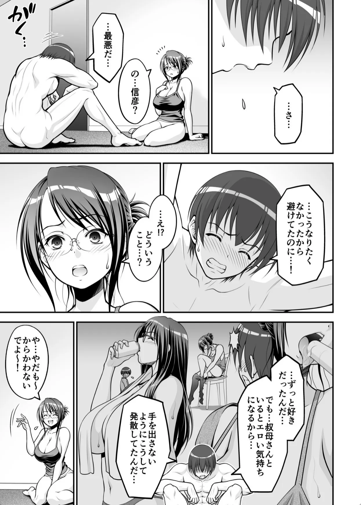 叔母は姉の息子の信彦と二人暮らし。姉が亡くなってからもう10年が経つ。信彦との関係は未だに距離があるままだ。ある時、雨に降られてびしょ濡れになった叔母はお風呂に入ろうと脱衣所に入る。するとそこには自分のパンツをオカズにシコっている信彦がいた。信彦はずっと叔母の事が好きだったのだ。今日限りという理由で叔母は信彦に身体を許してしまう。パイズリフェラで射精させると歯止めが効かなくなった信彦は叔母のマンコにチンポを挿入。そして抱き合いながら中出しフィニッシュ。この一件以来、信彦との距離が縮まったのはいいが…。