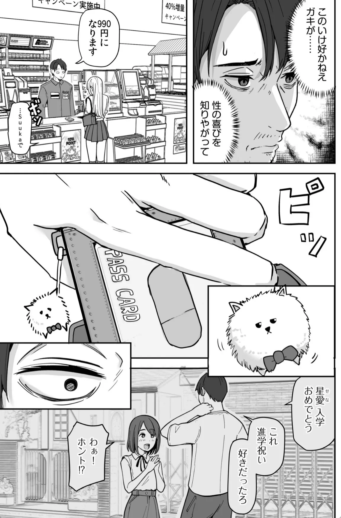 コンビニでアルバイトをする達也。そのコンビニにコンドームを買いに来たJK。恥ずかしそうに早く会計を済ませてと言わんばかりにこちらを見てくる。そして達也は、それが昔一緒に遊んでいた星愛だということに気付く。明らかに様子がおかしい。よく見てみると星愛はノーブラだった。星愛は会計を済ませて逃げるようにコンビニを後にする。達也はその日ゴミを出しに外へ出るとなんと星愛が青姦をしている現場に遭遇する。達也は思わずそれをスマホで撮影するのだが…。星愛は立ちバックで突かれてガチイキ。絶頂したところで達也と目が合って…。