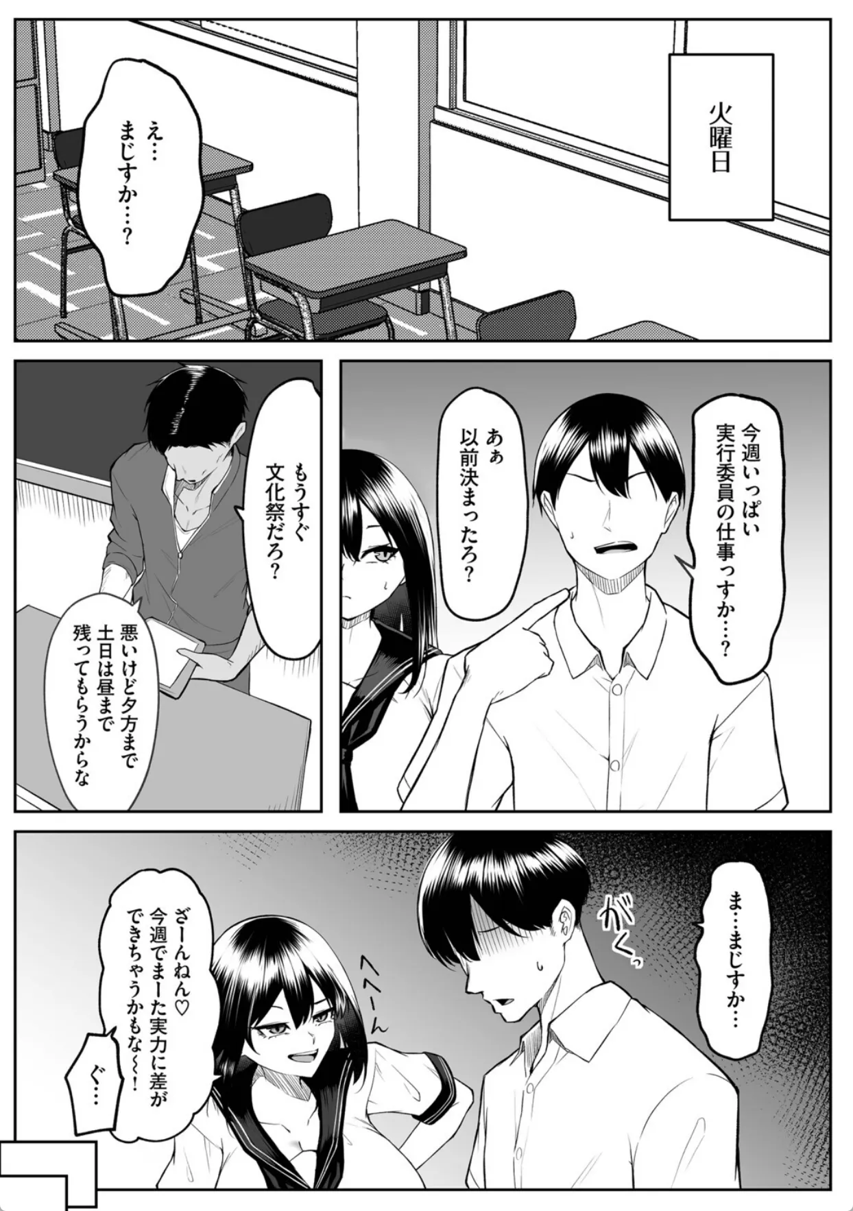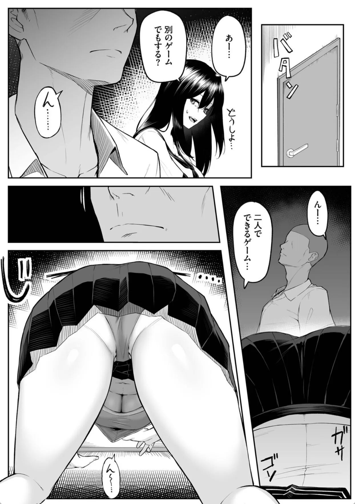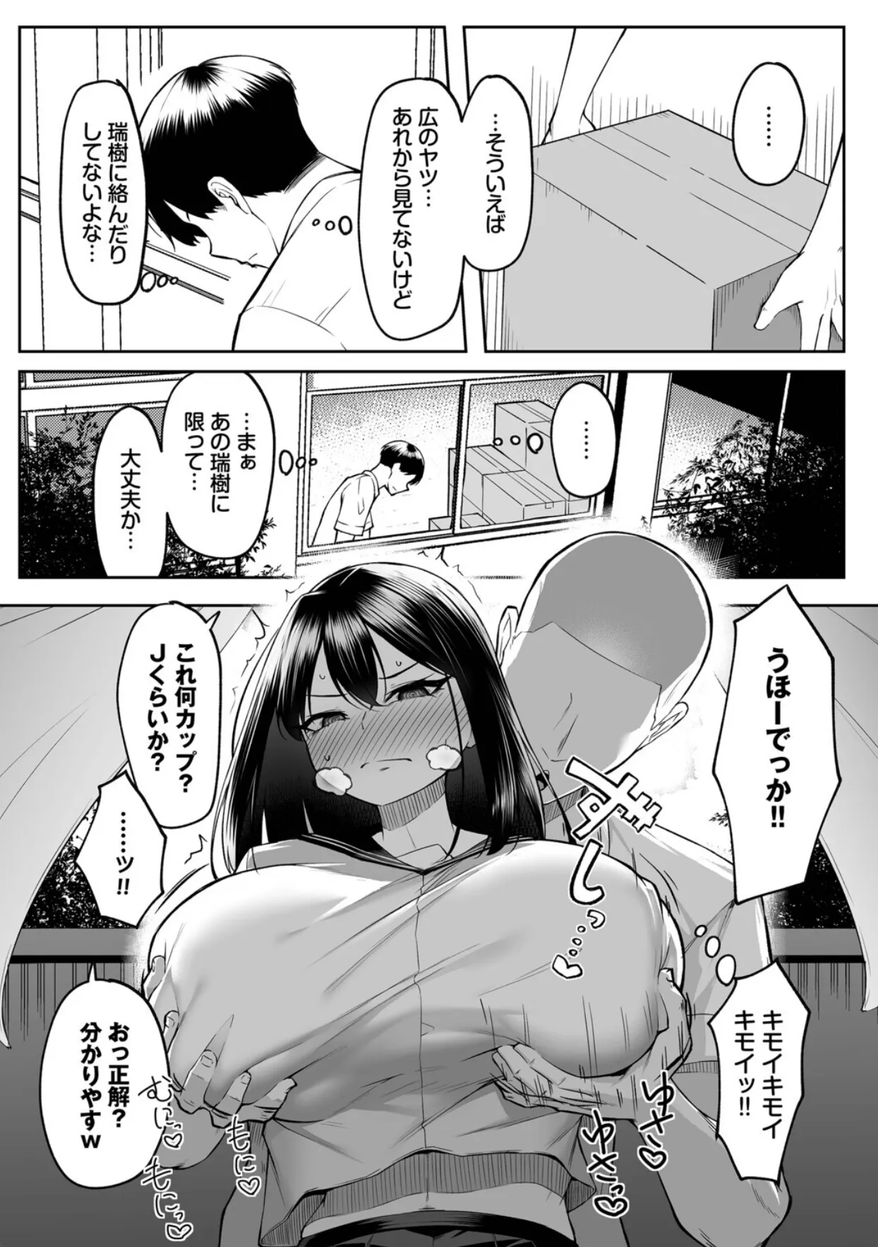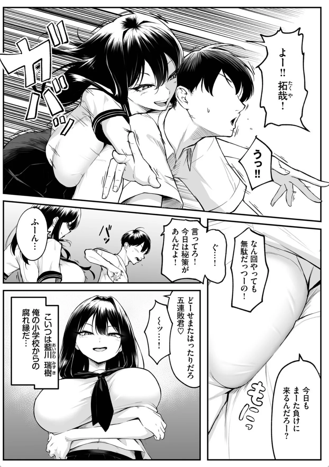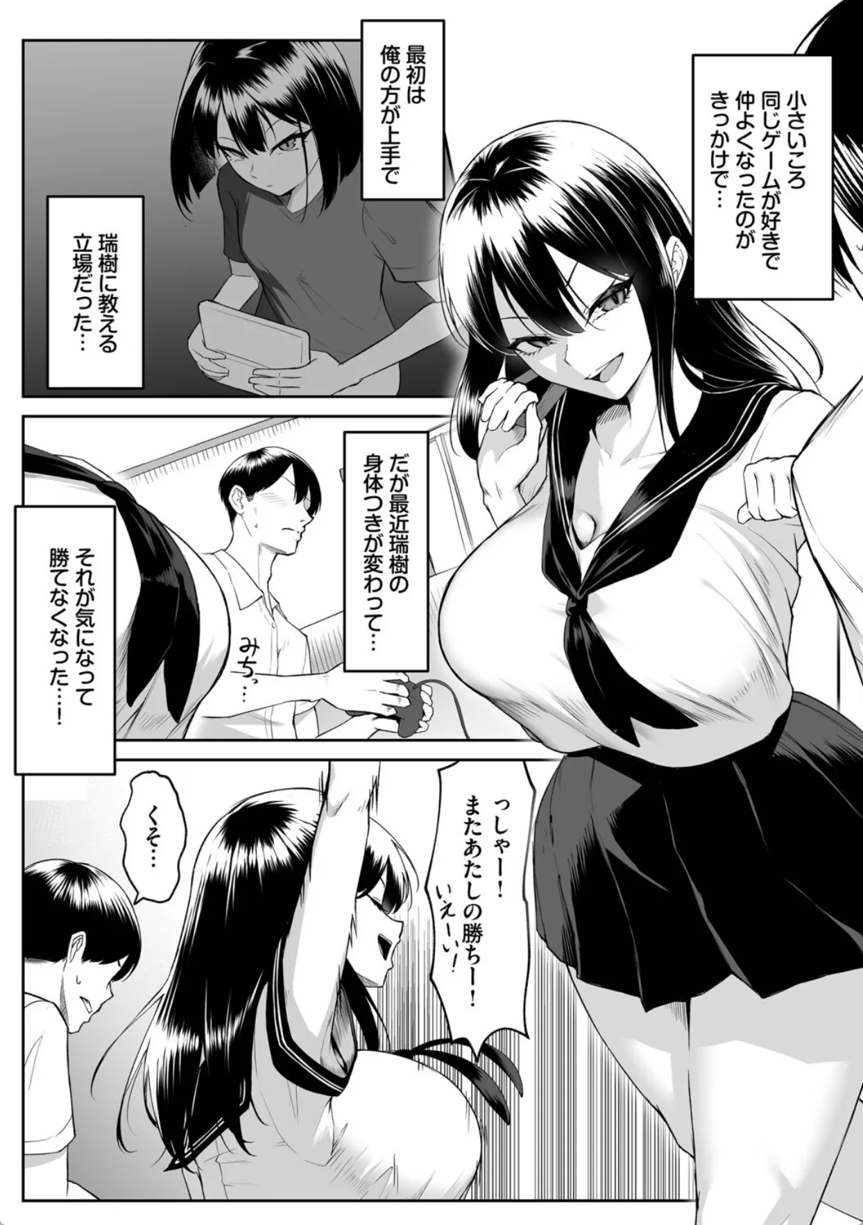 拓哉は幼馴染の瑞樹と放課後家でゲームをするのが日課だった。ゲームが下手な拓哉はいつも瑞樹に負けてばかり。そんな時、広が転校生としてやって来る。学校案内を任された拓哉と瑞樹。そして、何故か広と瑞樹と拓哉の三人でゲームをすることに。拓哉が先に帰った後、広にパンツの上からマンコを触られる瑞樹。誘ってる気など一切なかったが男の勘違いと言うのは怖いものである。その翌日、瑞樹は広と罰ゲームをかけてゲームで勝負をすることになり、負けてしまう。広から提示された罰ゲームの内容はおっぱいを揉ませて欲しいとのことだった。