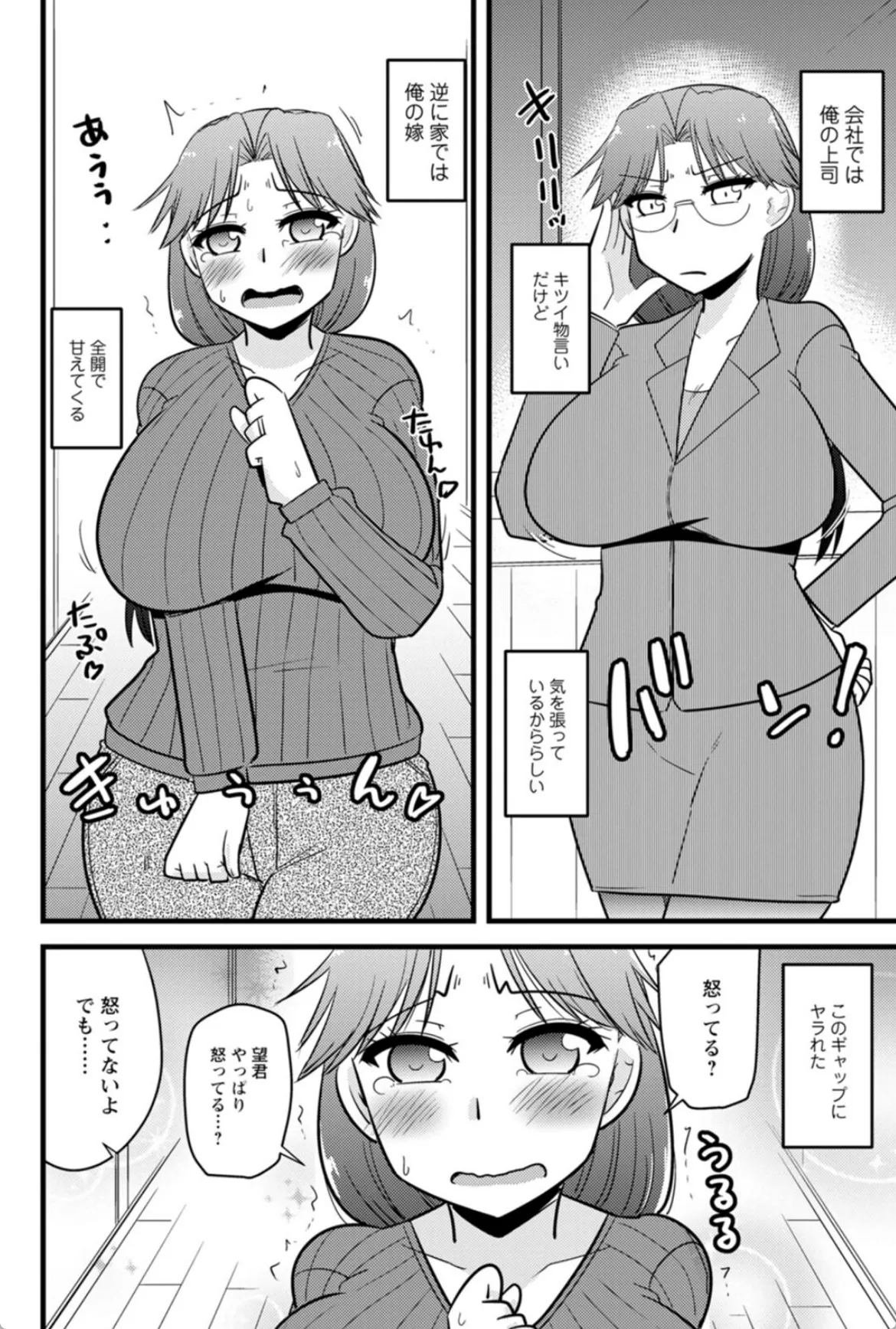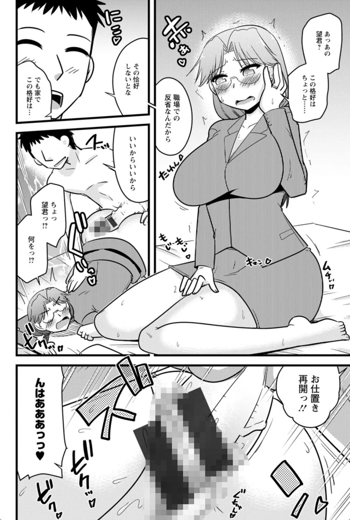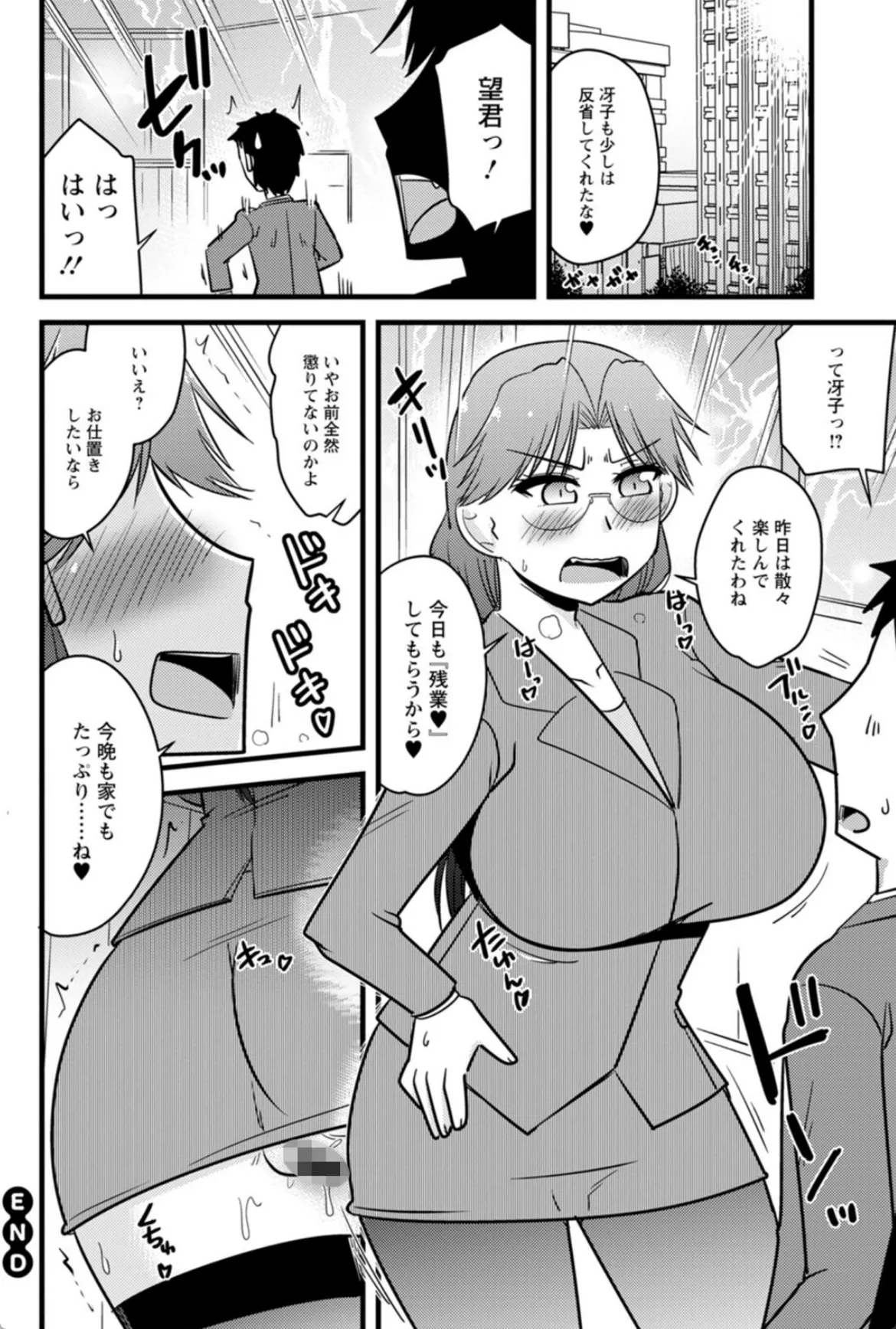 冴子は望の上司であり妻でもある。職場で盛った冴子は会議室でチンポに馬乗りに。冴子の性欲は凄まじく、望は毎回それに付き合わされていた。もう職場でのエッチはやめよう。冴子に反省してもらうため家でお仕置きエッチを敢行する望。喉奥を会社終わりの激臭チンポでドチュドチュついて口内射精。冴子は嬉しそうに精子をごっくんする。そのままマンコに入れて子宮をゴリゴリ抉るように突きまくる。冴子にとってお仕置きエッチとはただのご褒美に過ぎなかった。結局反省などせず翌日も職場で欲情して…。