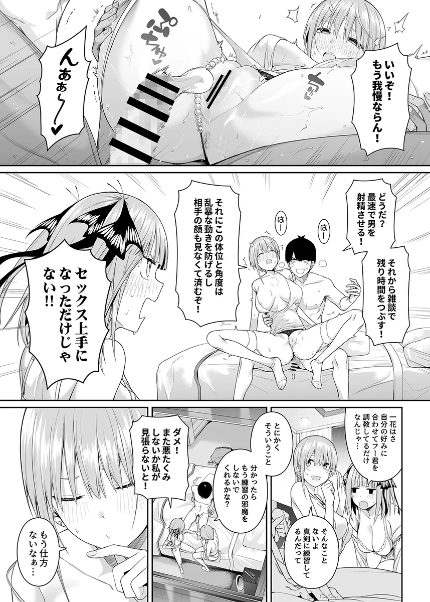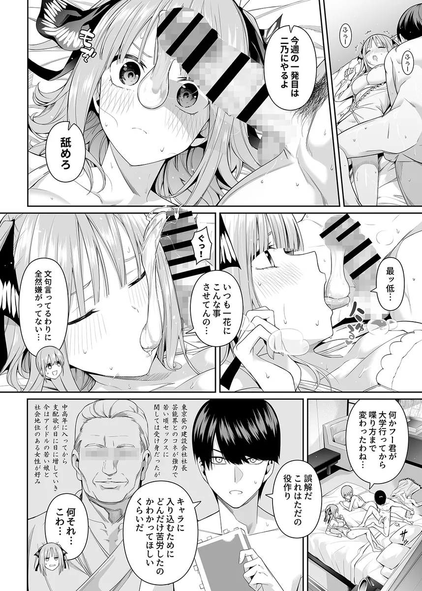 期待の分けて女優、中野一花の深夜二時の密会現場がスクープされてしまう。この記事に映っているのは本当に一花なのか。一花は真相を知るためにすぐに姉妹を集めて家族会議を開く。この中で彼氏がいるのは四女の四葉のみ。そこで映っていたのは四葉ということで世間に釈明することに。一花はこれで難を逃れる。そして、一花は風太郎と次女の二乃を呼び出す。二乃に明かされたのは、あの写真に写っていたのは風太郎と一花本人であるということ。スクープされる一カ月前から二人は身体の関係があり週一でセックスを繰り返していたのだ。