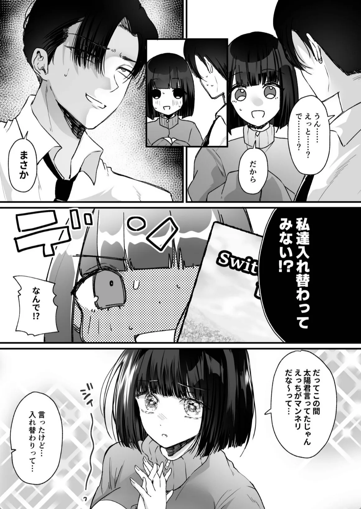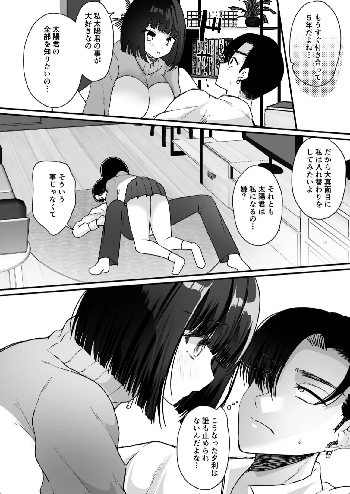 夕利は友達が入れ替わってセックスしているのを見てしまう。その友達曰く、この本を彼氏と同時に開けば入れ替わりに成功するらしい。夕利は早速彼氏の太陽に入れ替わりをしようと提案する。太陽は半信半疑でそれを承諾して一緒に本を開いてみる。しかし何も起こらない。だが、変化は着実に起きていた。寝て起きると太陽は夕利の身体になっていたのだ。少し乳首を触っただけで体に電流が走ったかのように気持ちいい。男の身体じゃ絶対に見ることのできないアングルでオナニーを始める太陽。そして、身体をビクつかせて女の絶頂を味わい…。