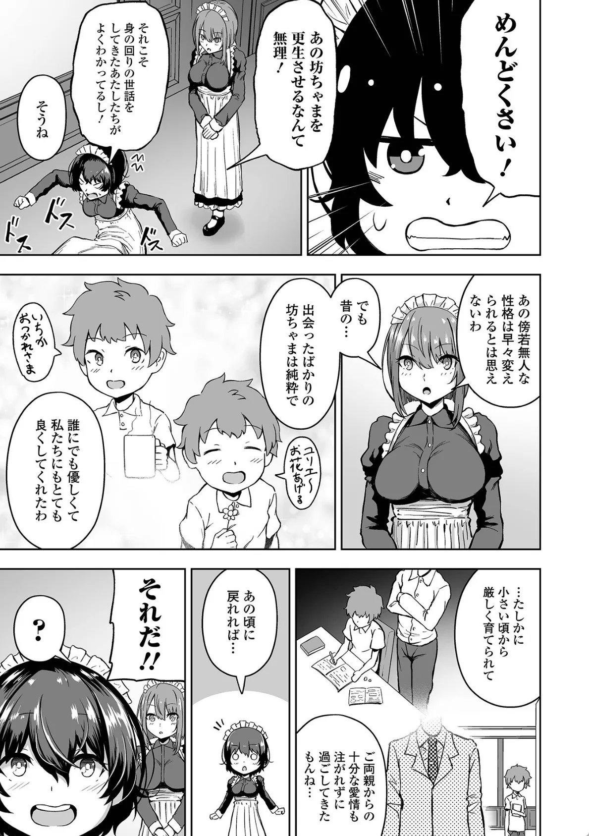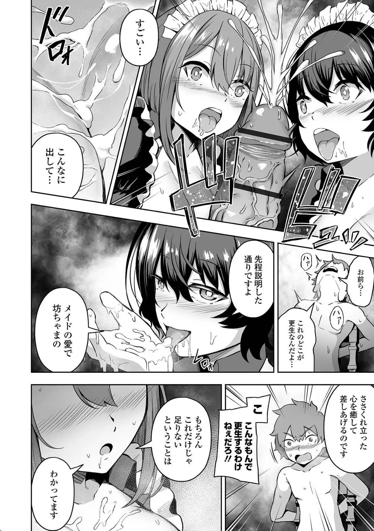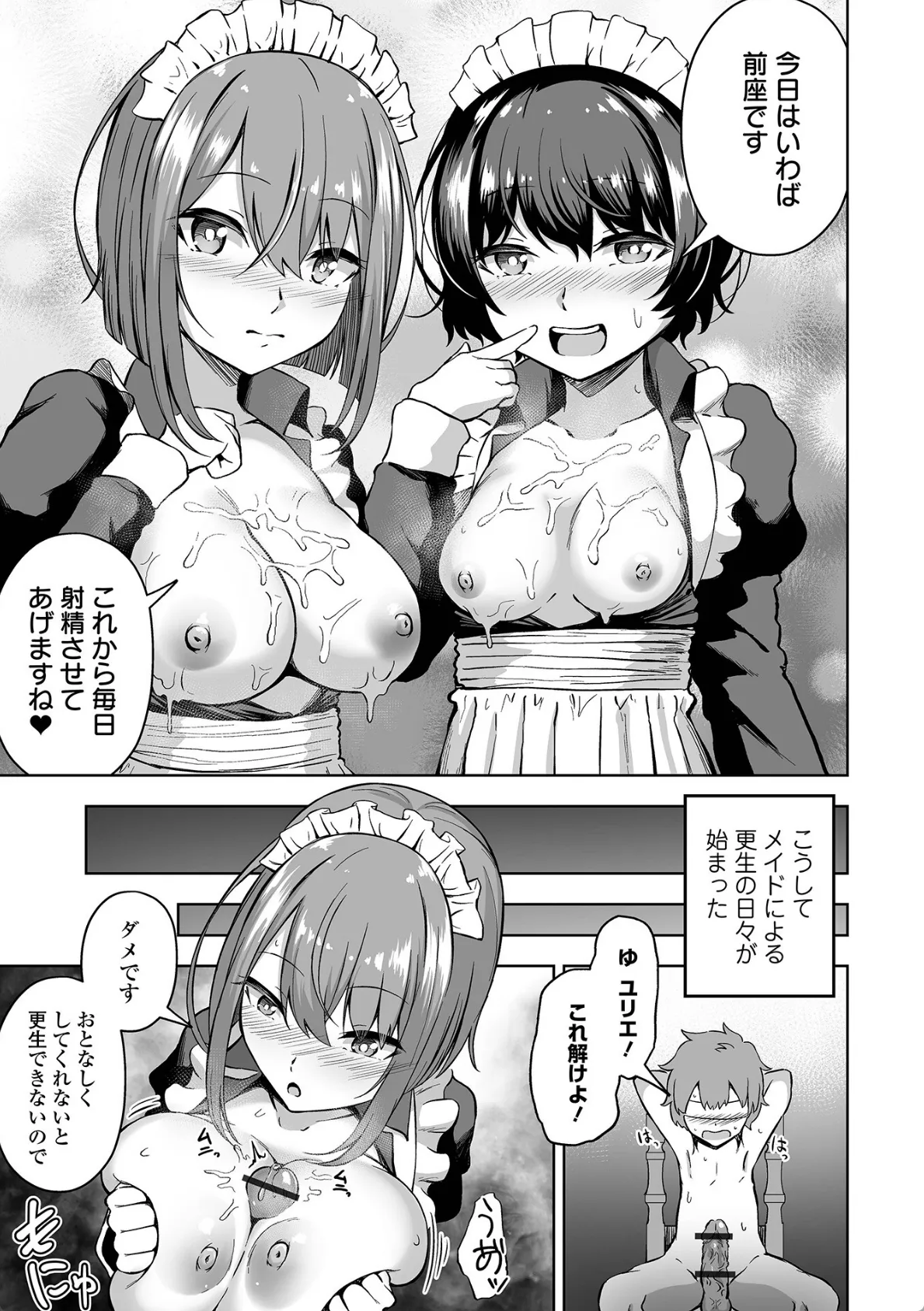 とある屋敷でメイドをしているユリエといちか。最近息子の豪の素行が悪く、父親はほとほと困っていた。そこでユリエといちかは父親からどんな手段を使ってでも息子を更生させるように指示される。早速、豪を椅子に拘束するユリエといちか。二人が選んだ手段はメイドの愛で更生させるというものだった。おっぱいを見せると豪のチンポはビキビキに勃起。ダブルフェラチオで大量射精させる。こうしてメイドによる更生の日々が始まった。この日、いつものように更生させようと豪の部屋を訪れたユリエといちかだったが、逆に手枷をハメられてしまい…。