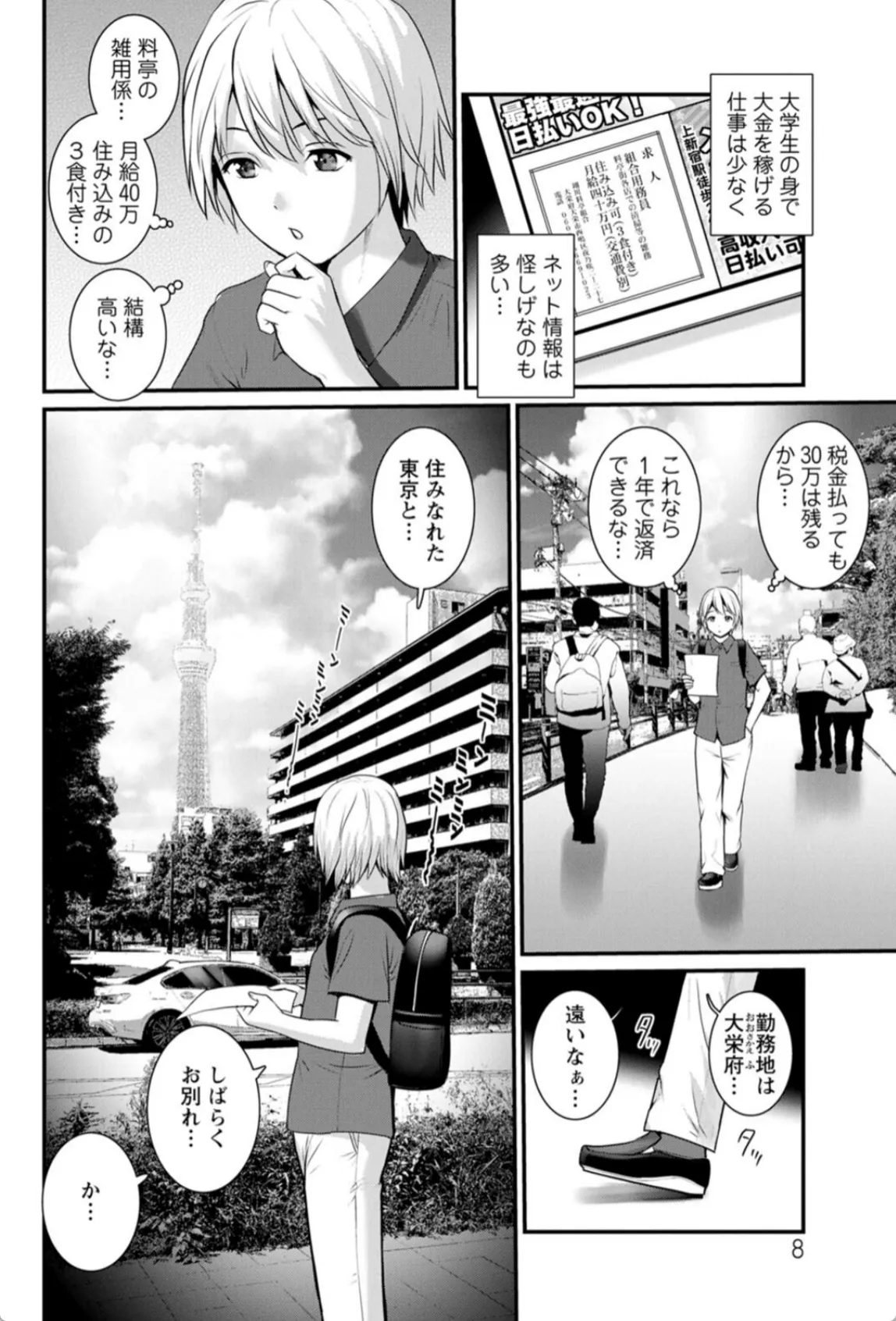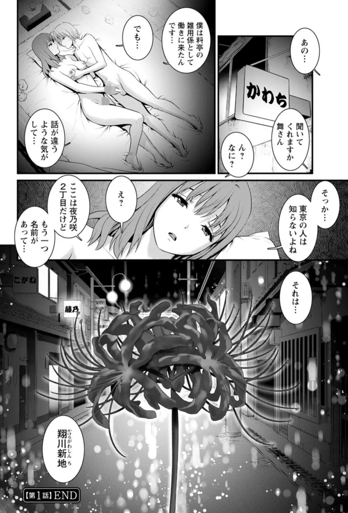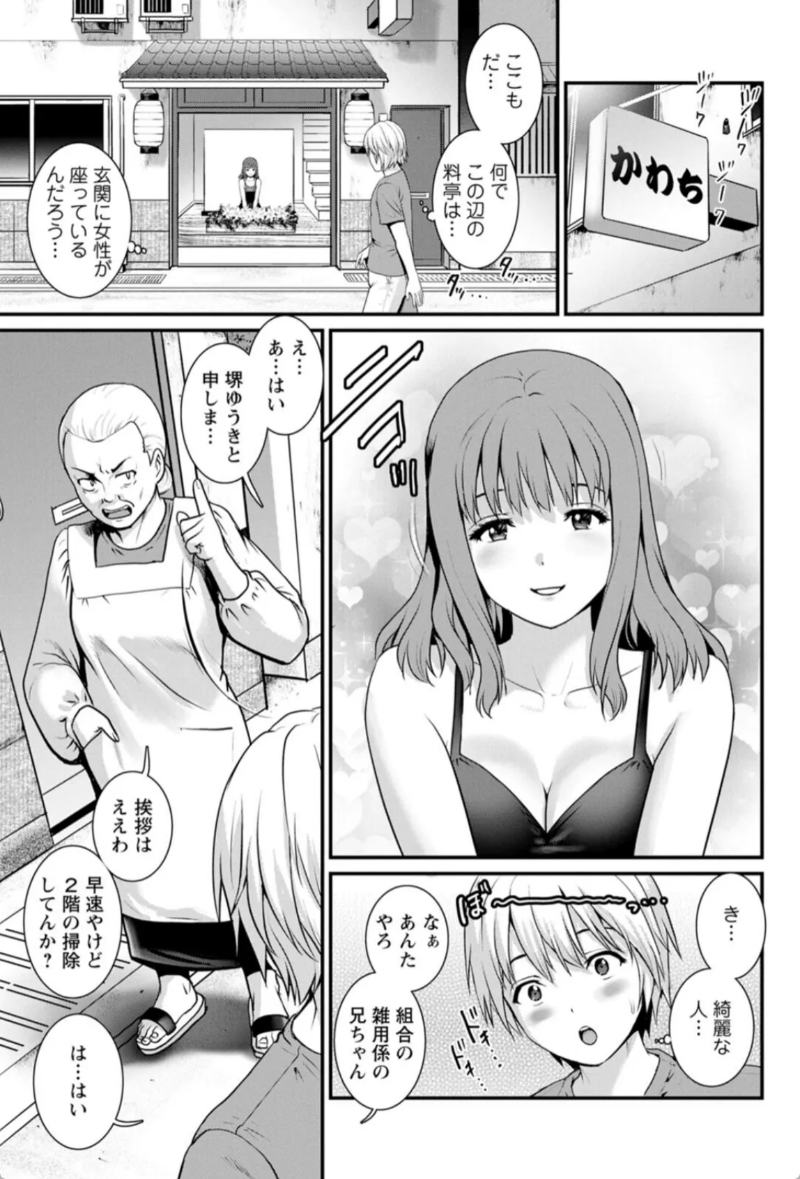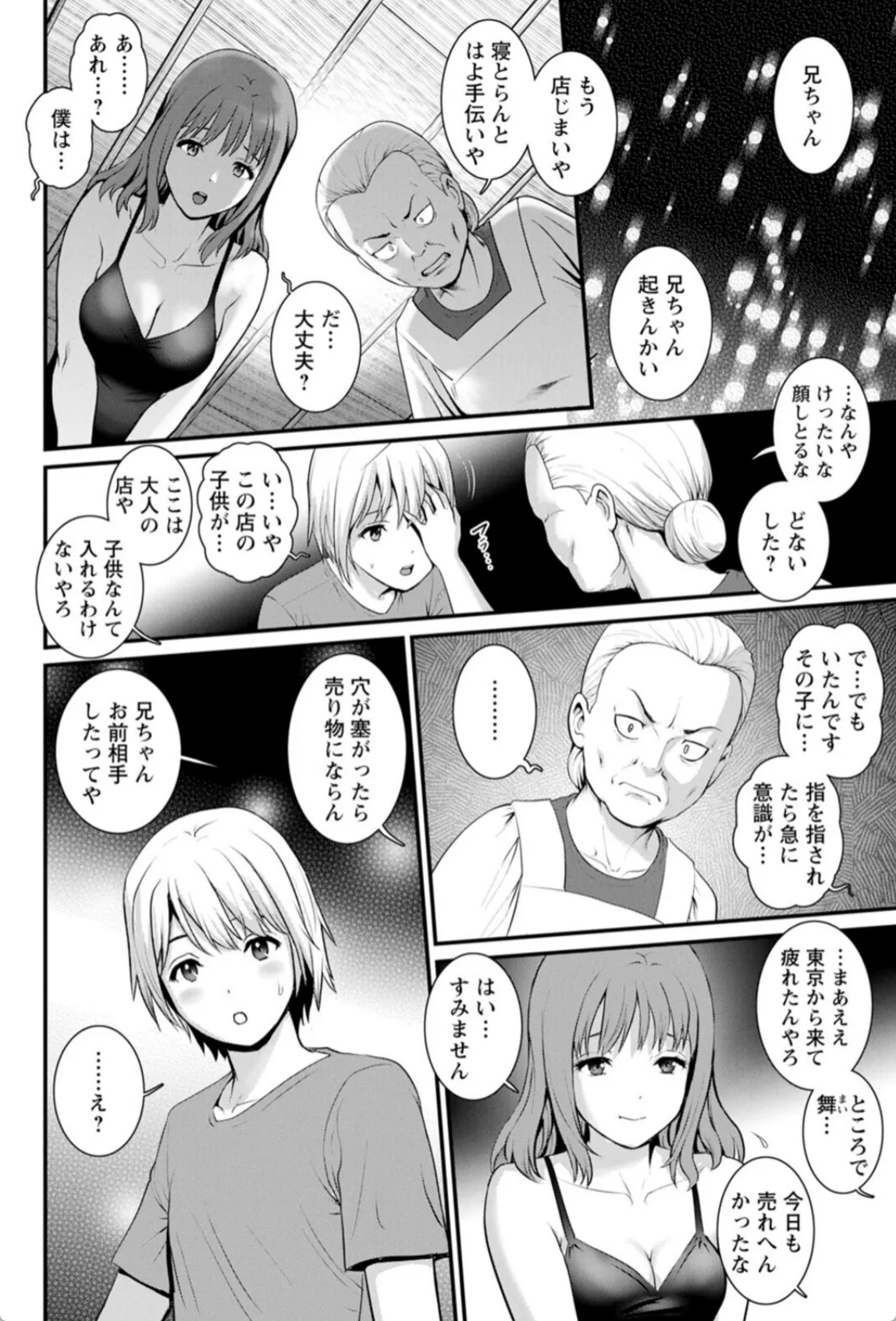 ゆうきは薄汚れた暗い部屋で名前と年齢しか知らない女性とセックスをしていた―。こうなったのも数日前、父親の会社が倒産し連帯保証人となっていたゆうきは300万円の借金を背負うことになってしまう。住み込みの料亭バイトで月給40万、その言葉に釣られてゆうきは東京を離れてここへ来た。何故か店の前に若い女性が鎮座してこちらに微笑みかける不思議な場所。ここでゆうきは舞という女性と知り合う。この店を取り仕切ってるおばさんに穴が塞がっては売り物にならないと、ゆうきは舞のセックスの相手をすることになる。ゆうきはこの場所が普通の場所ではないことにようやく気付き始める…。