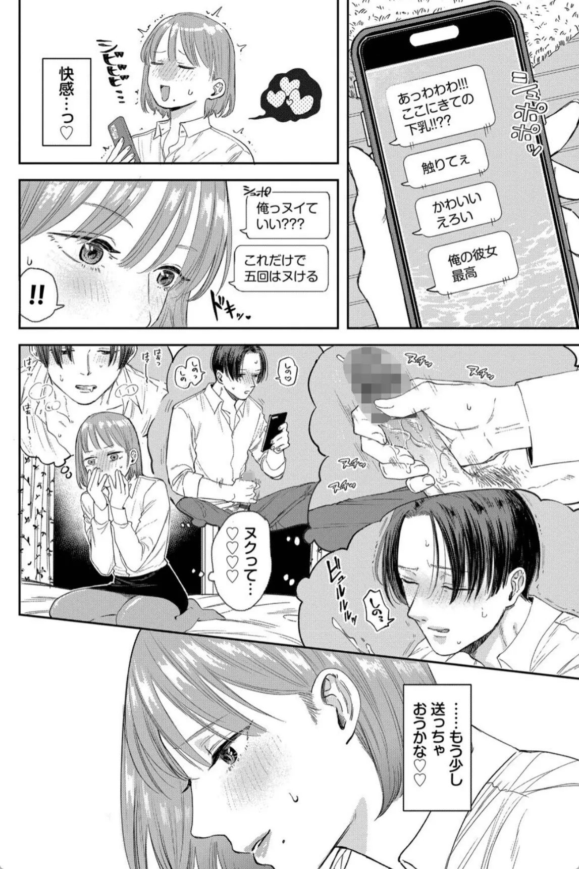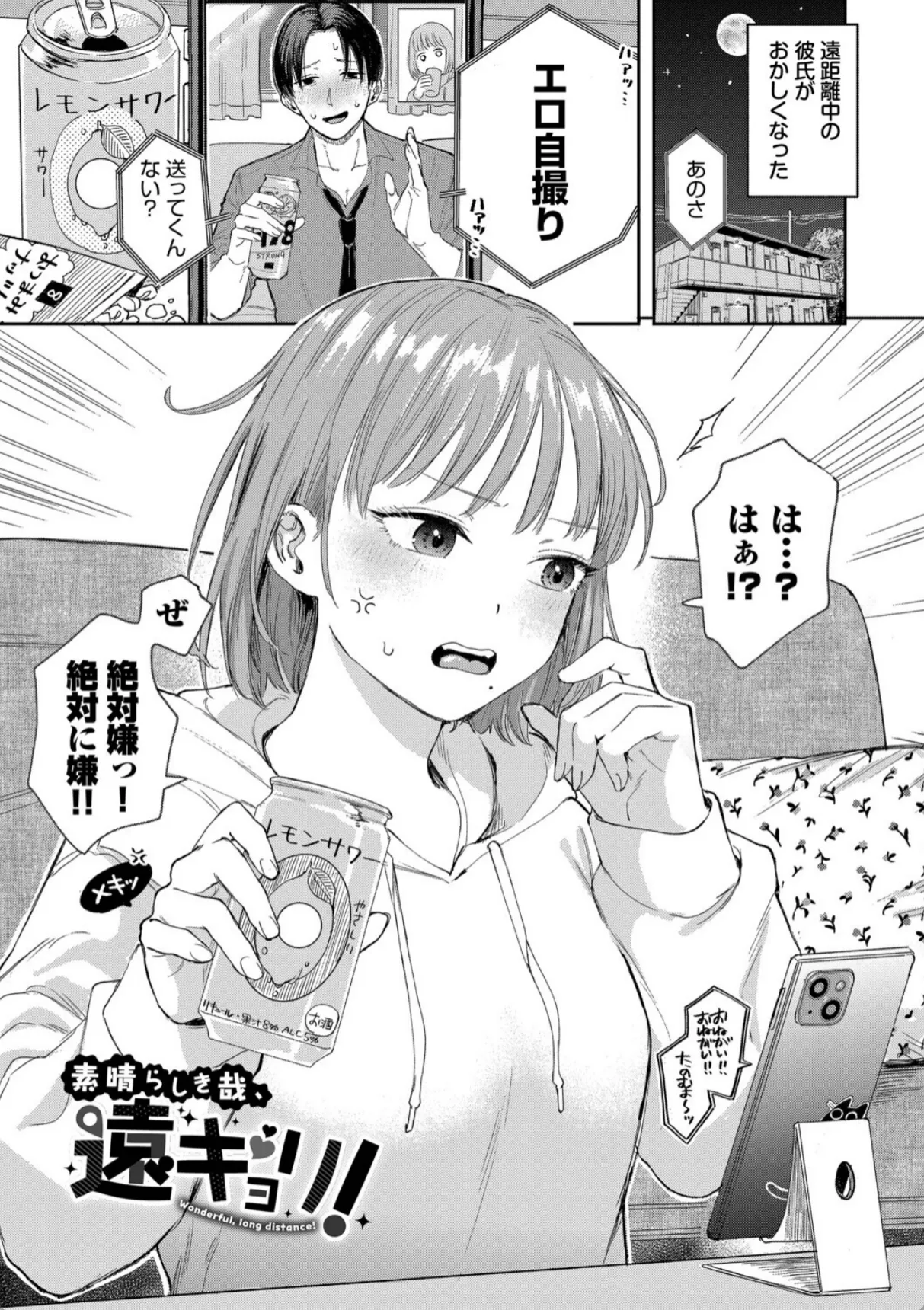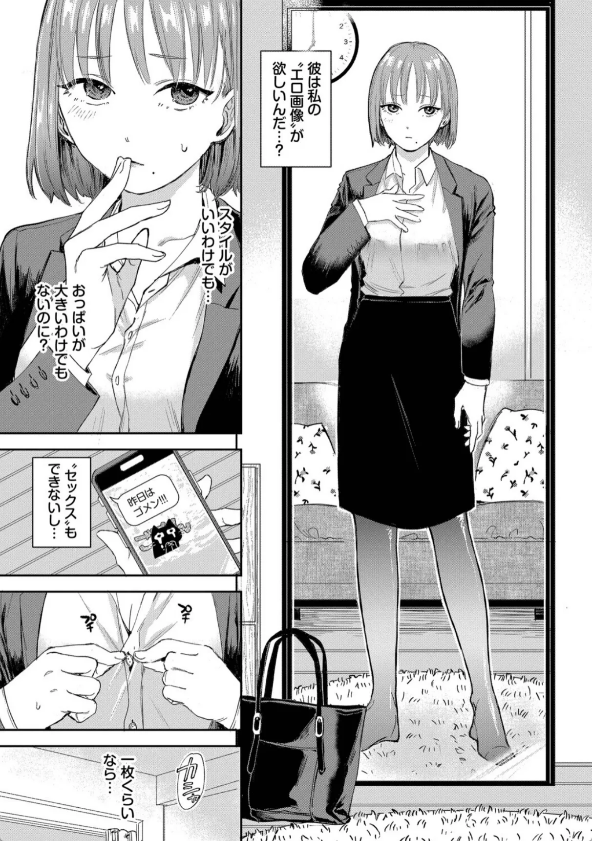 遠距離恋愛中の彼氏にエロ自撮りを要求される彼女。最初は断るも谷間の画像を送ってあげると彼氏は大喜び。こんなのでこんなに喜んでくれるなら…とどんどんエッチな自撮り画像を彼氏に送る。するとまたまた大喜び。最初はそんなつもりじゃなかったが、送る画像はどんどん過激になっていき、最後は鏡越しにおまんこをくぱあした自撮り写真を送信。すると返信は来ずに既読スルー。嫌われてしまったかと心配になる彼女だったが、玄関を開けるとそこには彼氏がいた。いきなりキスをされてチンポをハメられる彼女。彼氏はあの最後の自撮り写真で興奮して遠路はるばる彼女の自宅までやって来たのだ―。