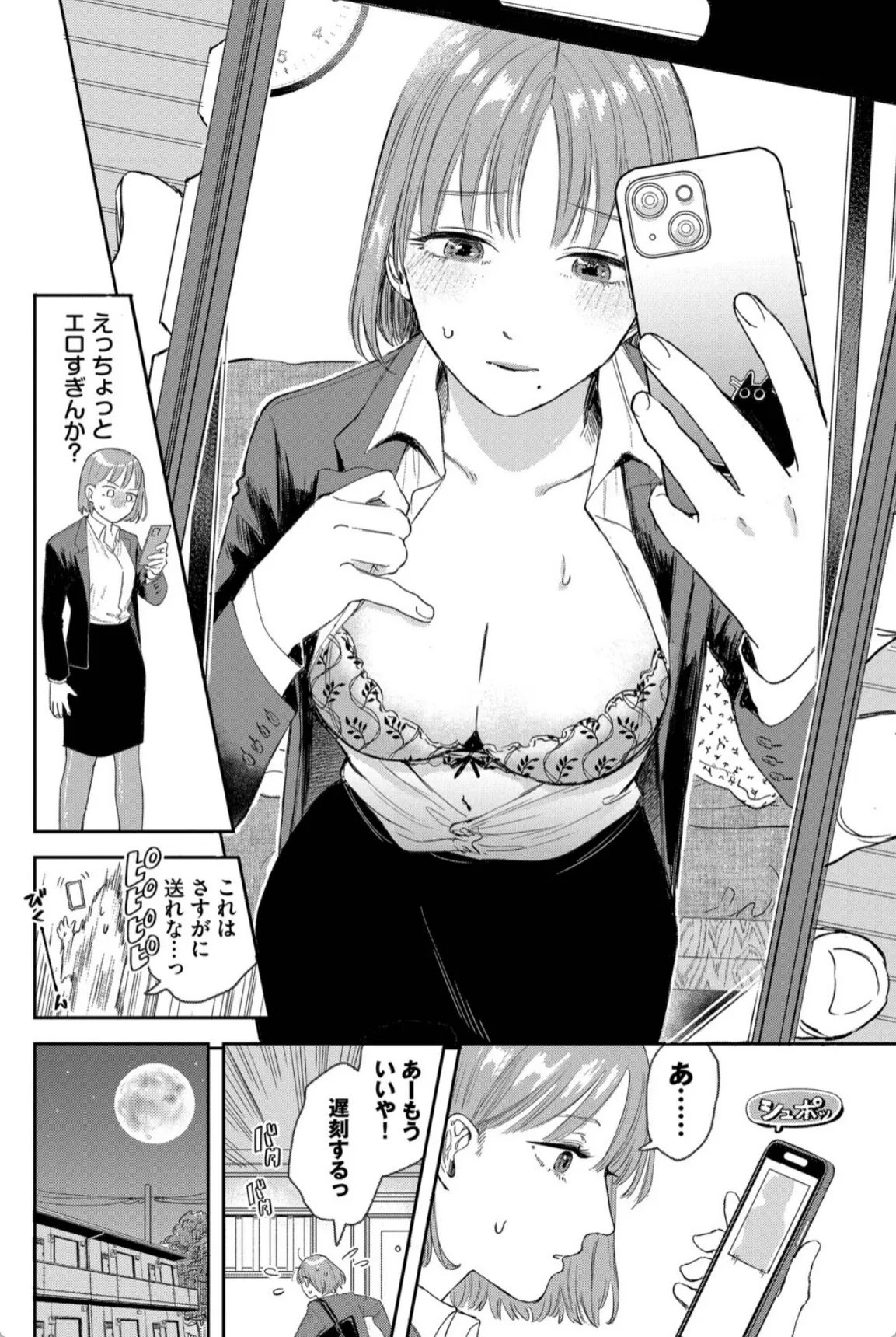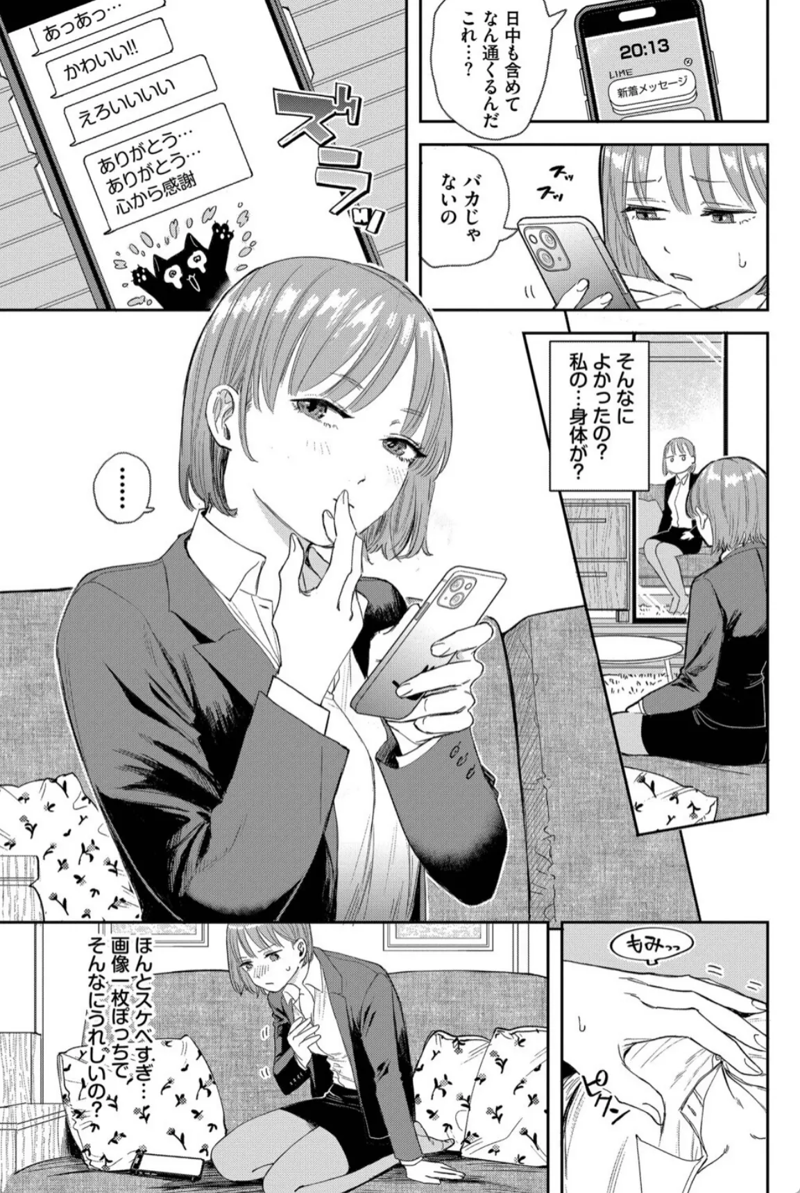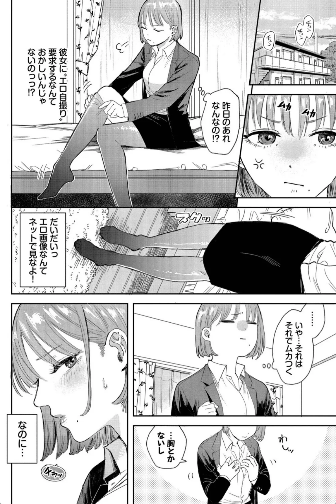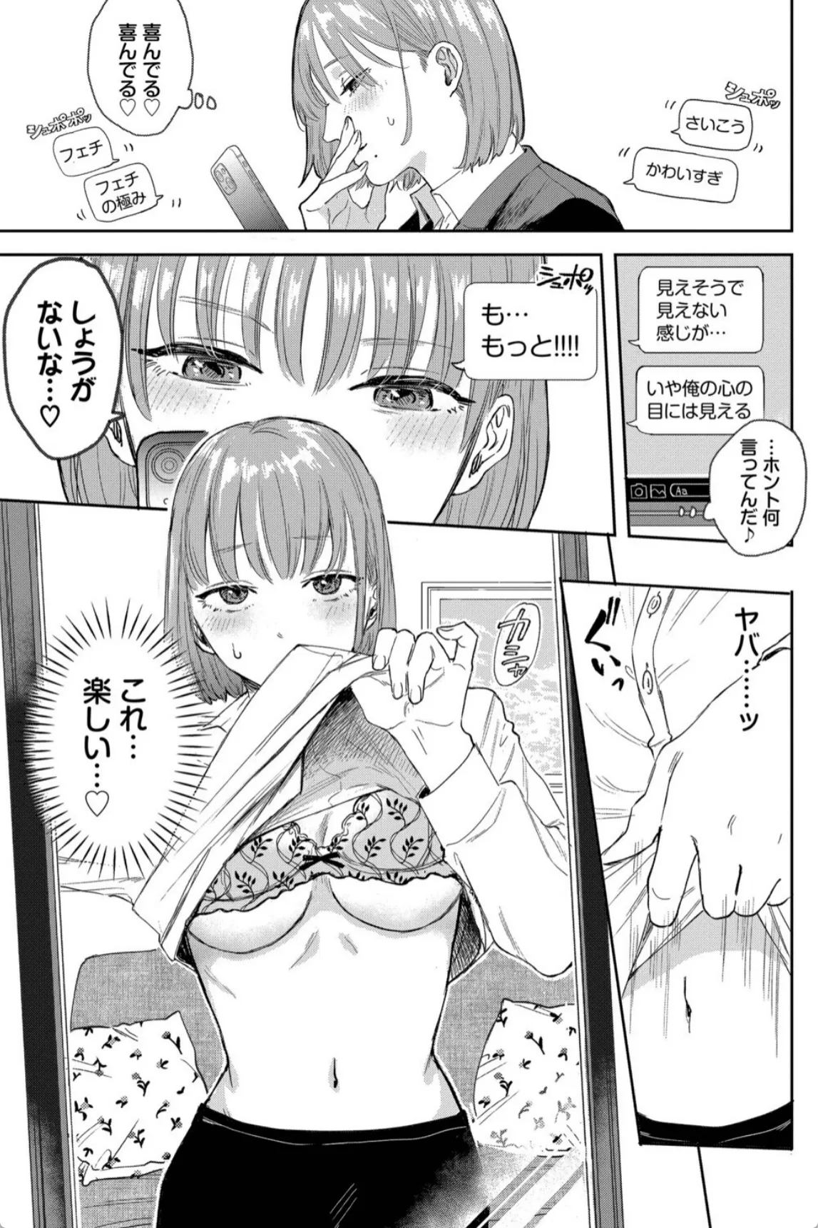 遠距離恋愛中の彼氏にエロ自撮りを要求される彼女。最初は断るも谷間の画像を送ってあげると彼氏は大喜び。こんなのでこんなに喜んでくれるなら…とどんどんエッチな自撮り画像を彼氏に送る。するとまたまた大喜び。最初はそんなつもりじゃなかったが、送る画像はどんどん過激になっていき、最後は鏡越しにおまんこをくぱあした自撮り写真を送信。すると返信は来ずに既読スルー。嫌われてしまったかと心配になる彼女だったが、玄関を開けるとそこには彼氏がいた。いきなりキスをされてチンポをハメられる彼女。彼氏はあの最後の自撮り写真で興奮して遠路はるばる彼女の自宅までやって来たのだ―。