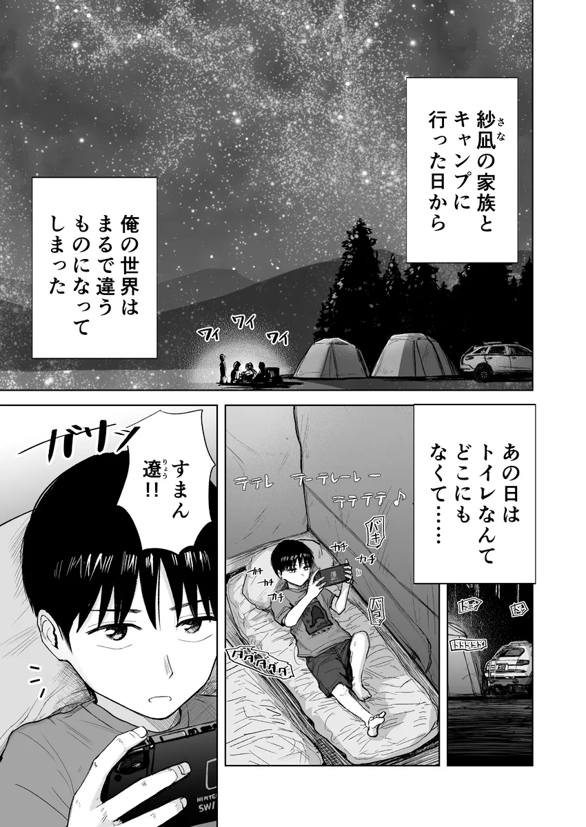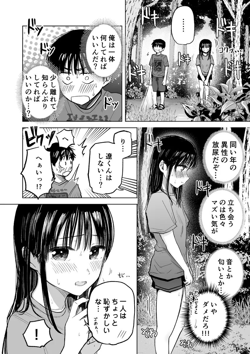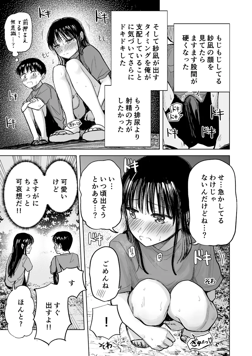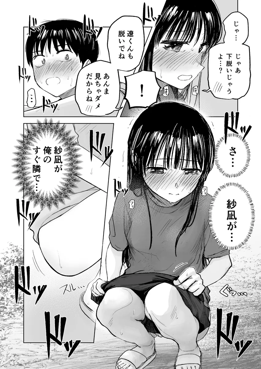 紗凪の家族とキャンプに行った日から遼の生活は一変する。あの日のキャンプの夜、遼は紗凪から連れションに誘われる。このキャンプ場にはトイレが無かった。紗凪とは家が隣同士なだけであまり話したことが無い。ただ親同士が仲が良いというだけの関係だ。二人は暗がりの山道を進み、紗凪がおしっこの体勢になる。一人だけするのは恥ずかしいということで遼も一緒に横並びでおしっこをすることに。しかしチンポが勃起してしまいなかなかおしっこがだせない遼。ふと横を見ると、紗凪が勢いよくマンコからおしっこを噴射していて…。