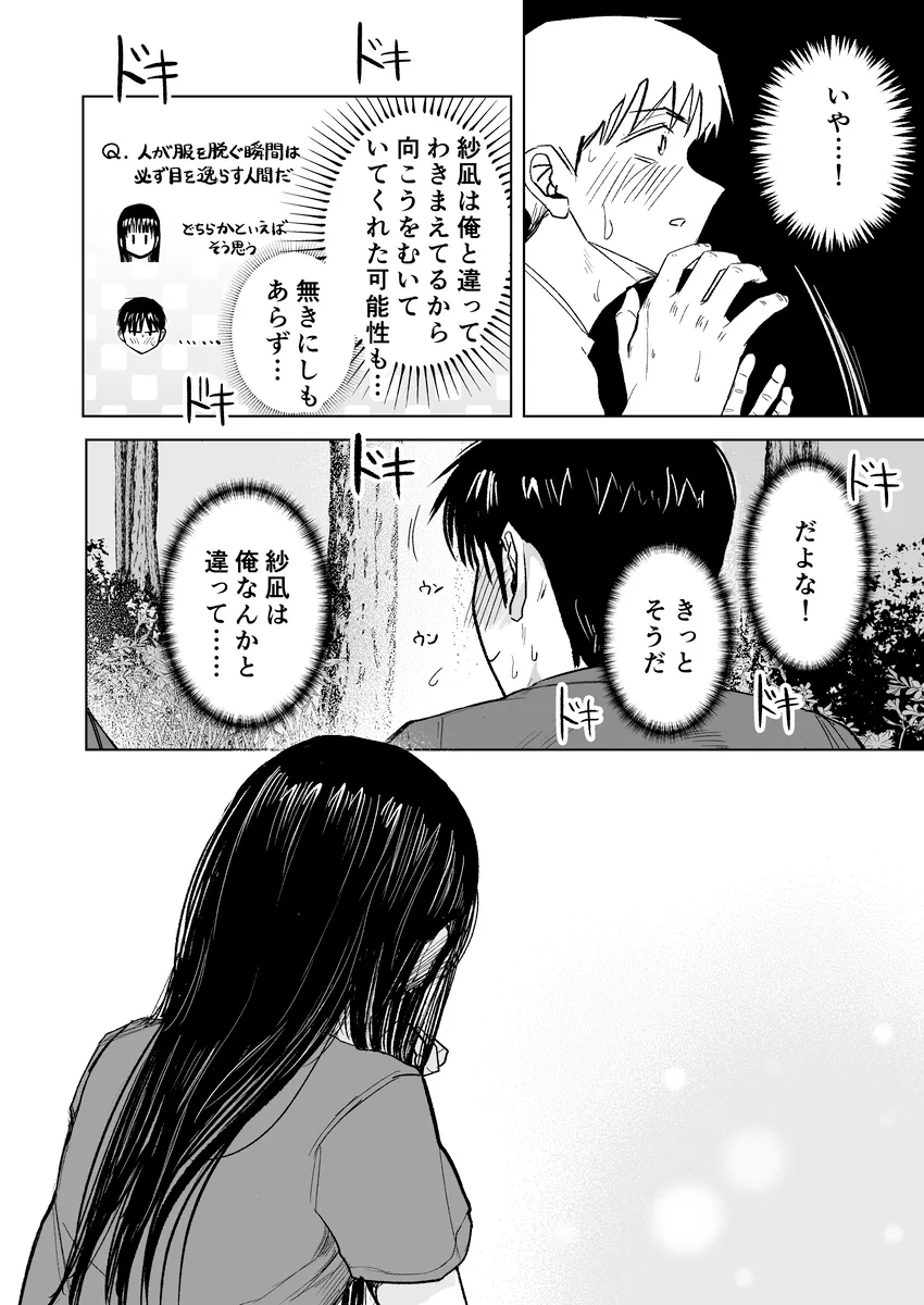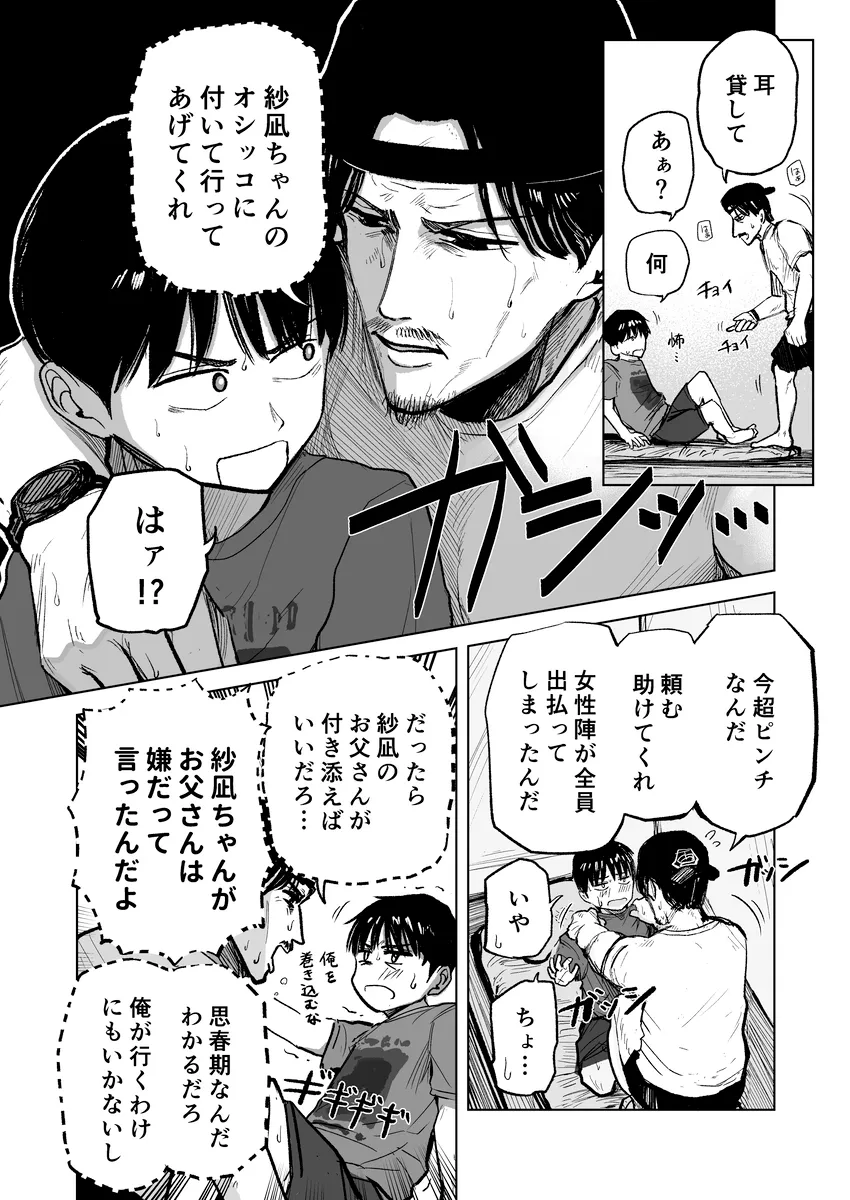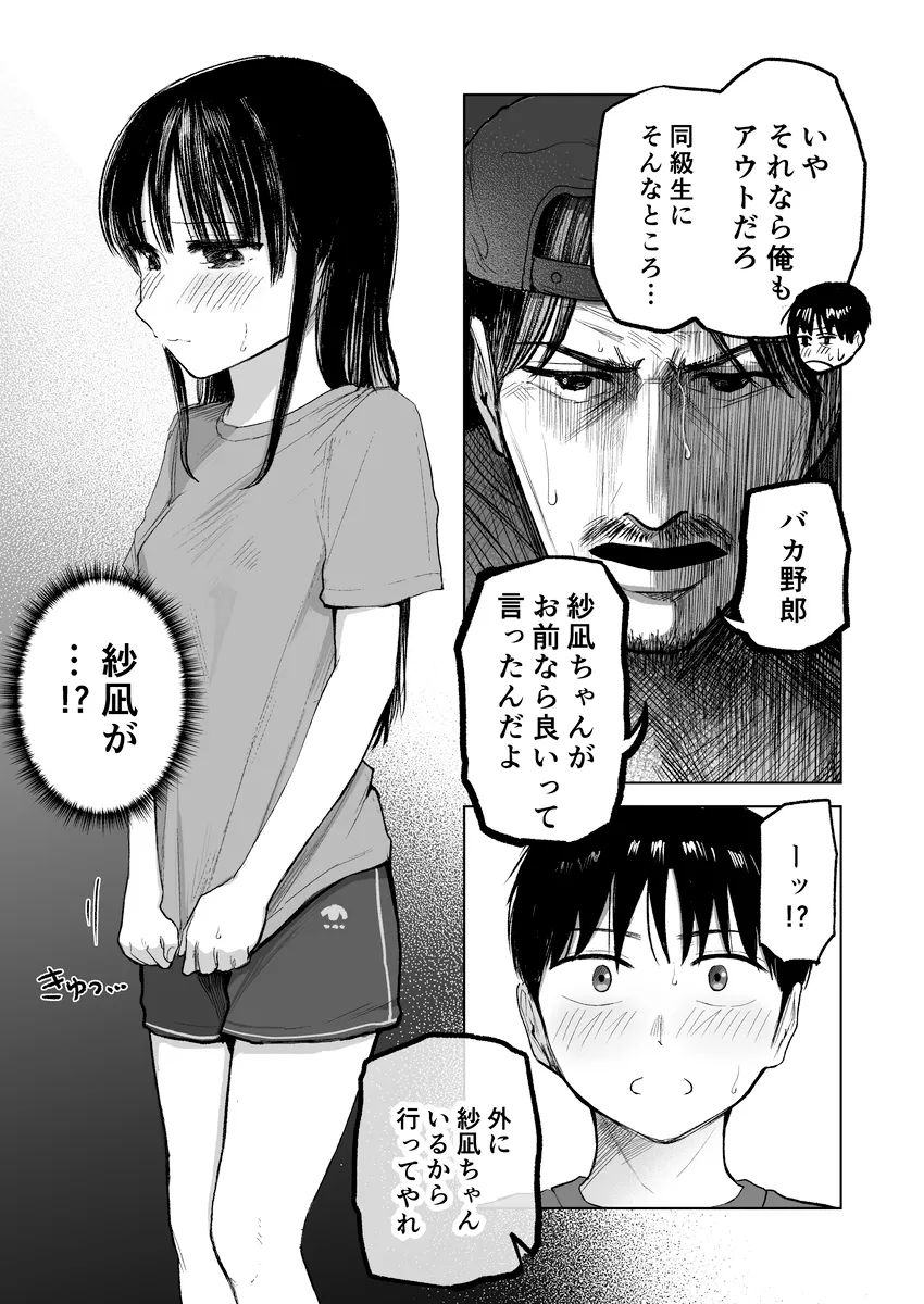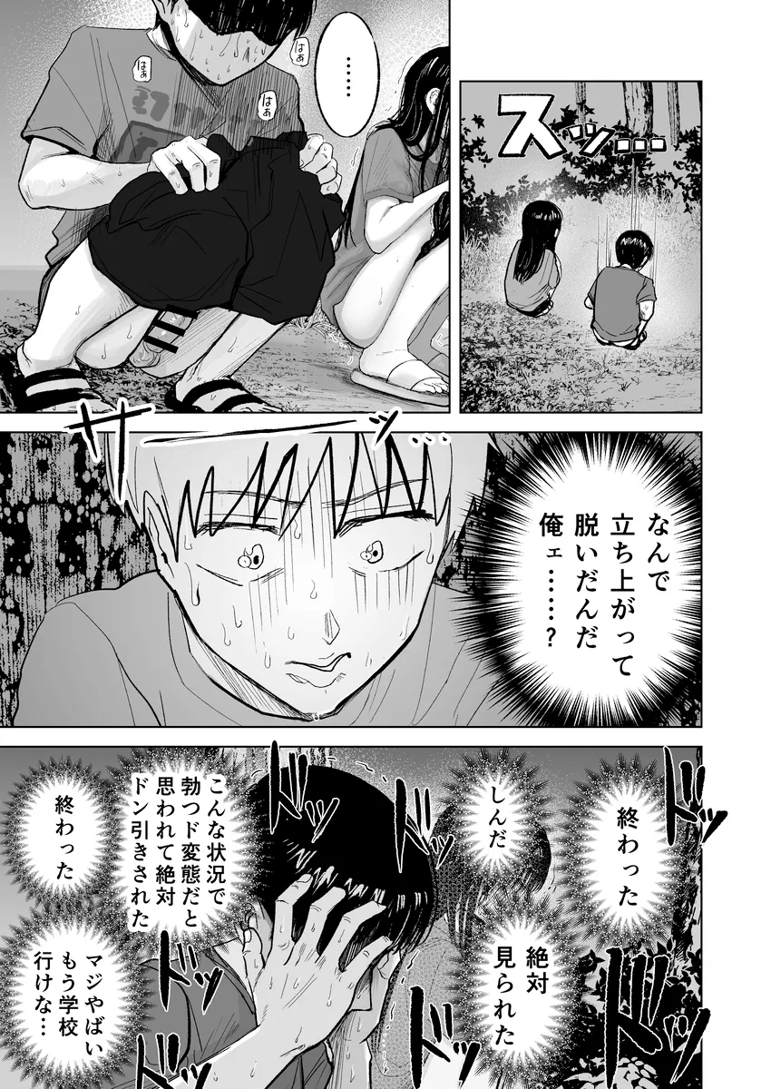 紗凪の家族とキャンプに行った日から遼の生活は一変する。あの日のキャンプの夜、遼は紗凪から連れションに誘われる。このキャンプ場にはトイレが無かった。紗凪とは家が隣同士なだけであまり話したことが無い。ただ親同士が仲が良いというだけの関係だ。二人は暗がりの山道を進み、紗凪がおしっこの体勢になる。一人だけするのは恥ずかしいということで遼も一緒に横並びでおしっこをすることに。しかしチンポが勃起してしまいなかなかおしっこがだせない遼。ふと横を見ると、紗凪が勢いよくマンコからおしっこを噴射していて…。