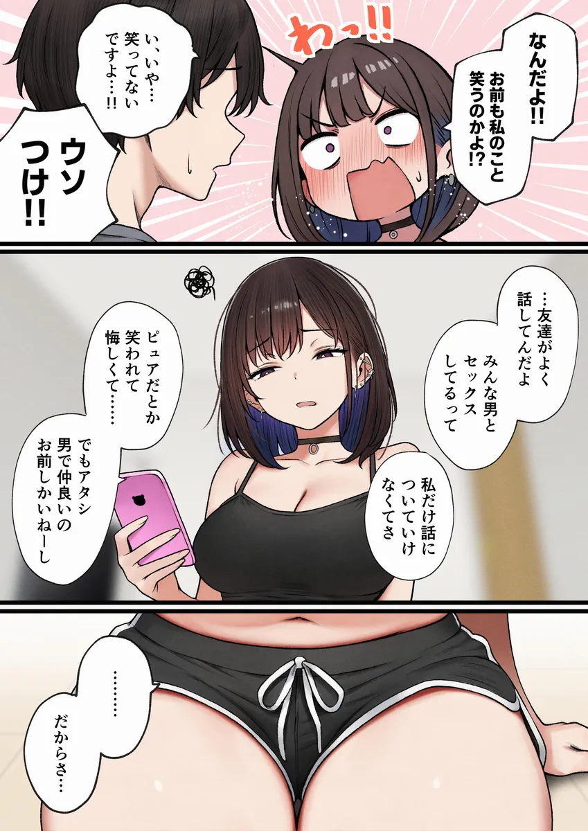 非モテオタクの主人公が暮らす一人暮らしの部屋に入り浸る幼馴染ギャルの美咲。大学生になって自由を謳歌しようとしていた所にこれである。「お前さ、セックスってしたことある?」美咲が唐突に質問する。童貞のくせに強がってもちろんヤりまくりと答えると、美咲は恥ずかしそうに自分は処女だと告白する。美咲の友達はみんな非処女であるため美咲はどこか劣等感を感じていた。そしてその流れで美咲の処女を生チンポで卒業させてあげることに。もちろん主人公も童貞なのでお互いが初セックスとなる。記念すべき一発目のセックスがまさか生中出しとは…。