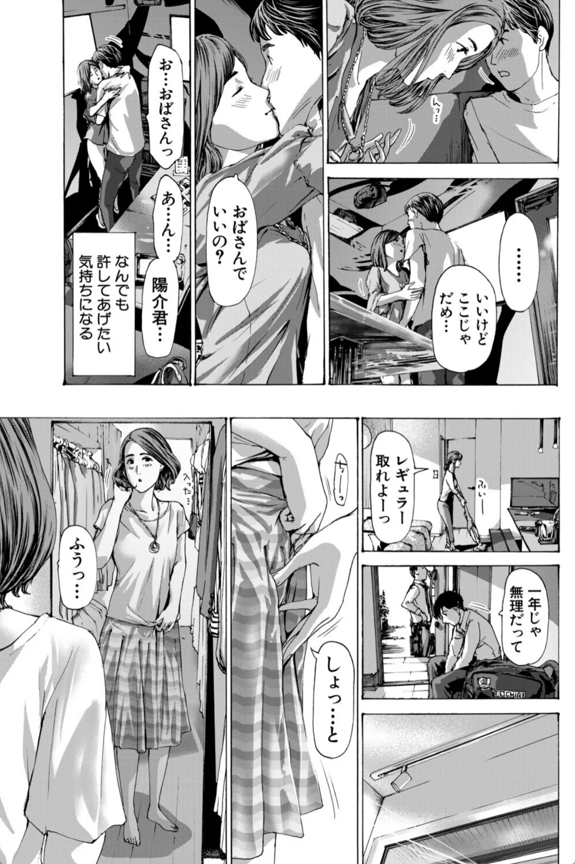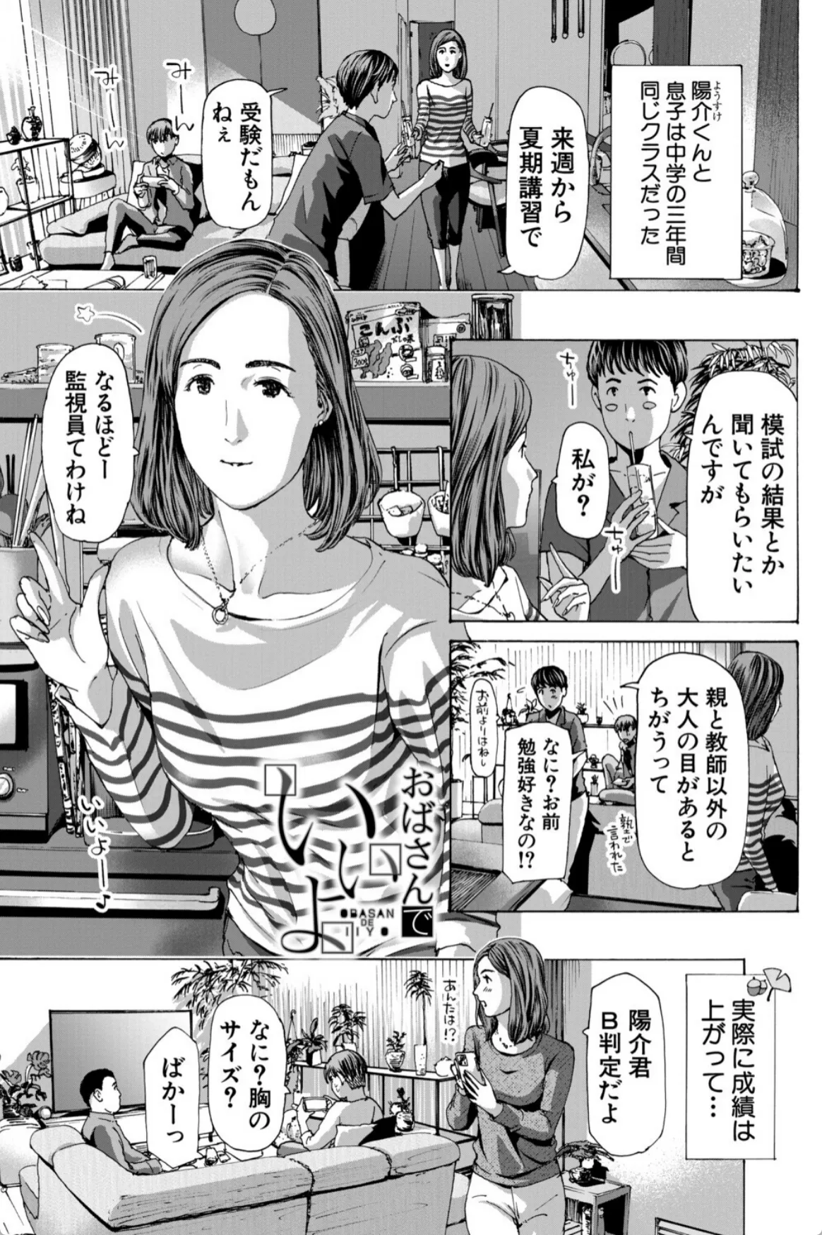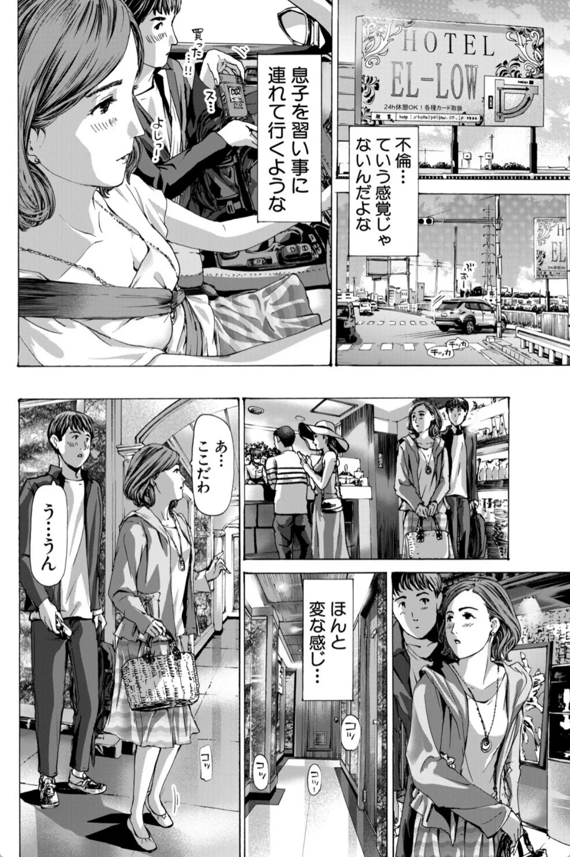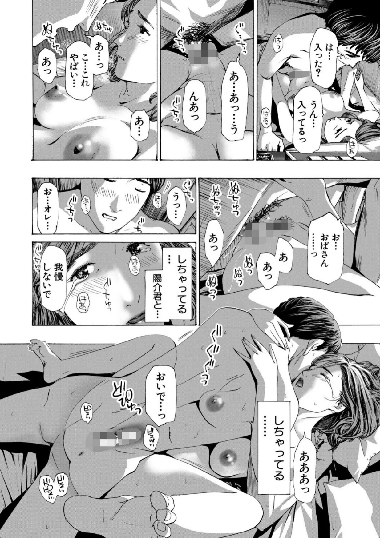 実花は息子の友達の陽介の勉強を教えるのをきっかけにどんどん陽介との仲を深めていく。無事に陽介は希望の学校に合格。それからも二人の関係は続いていく。手を繋ぎ、車の中でキスを二人。実花にとっては不倫という感覚はなかった。息子を習い事に連れて行くような感覚。そして、実花は陽介をラブホへと連れていく。「どうぞ、触って?」陽介の前に垂れ乳を差し出す実花。実花は陽介に女というものがなんなのか体を使って教示する。筆下ろしも終わりここからはボーナスタイム。実花と陽介はこのあと五回も交じり合い…。