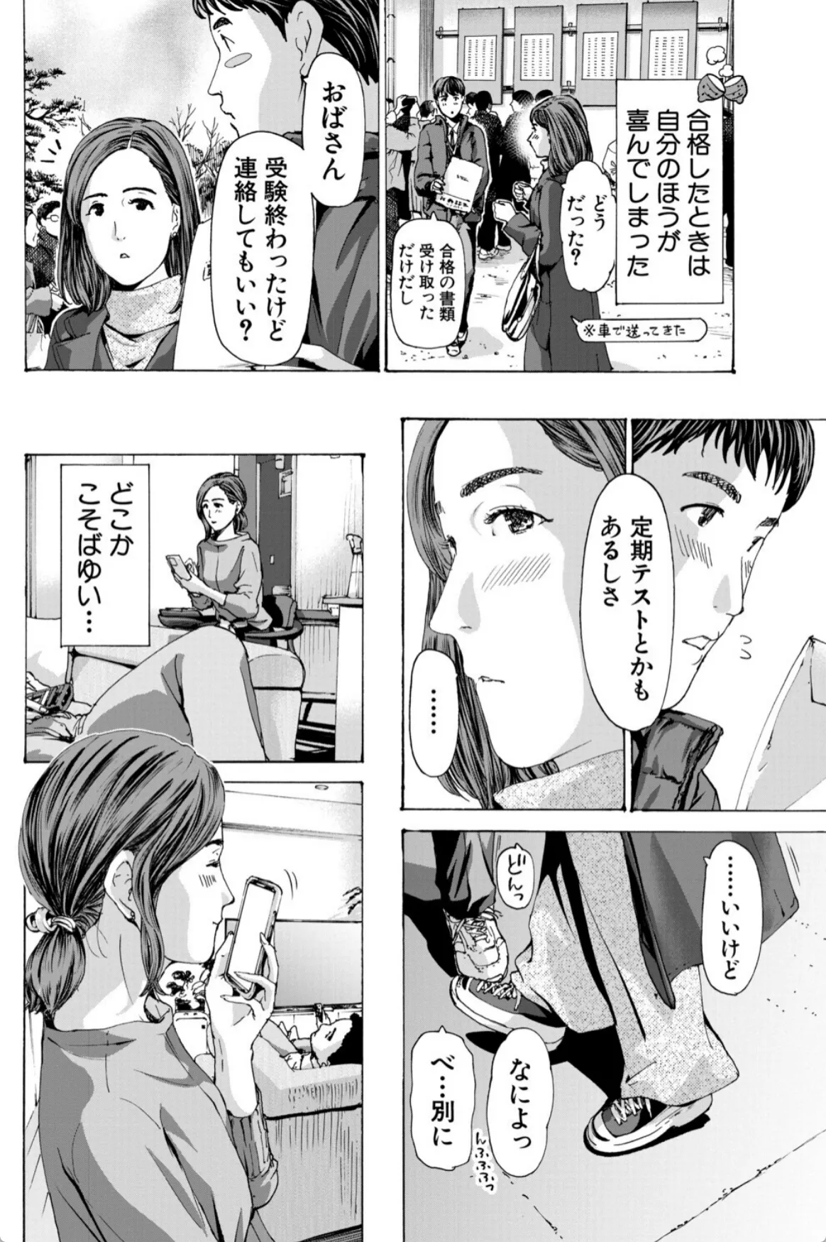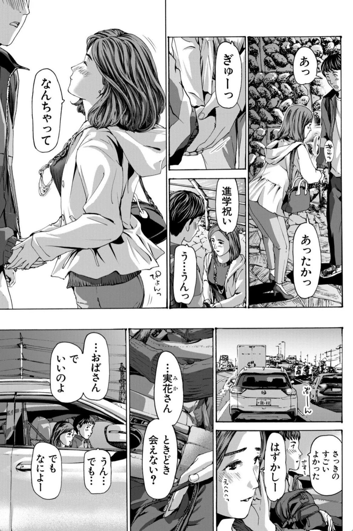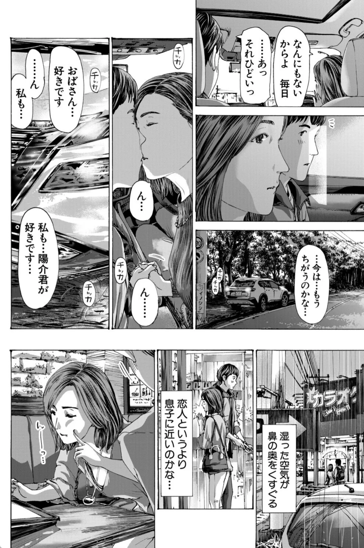 実花は息子の友達の陽介の勉強を教えるのをきっかけにどんどん陽介との仲を深めていく。無事に陽介は希望の学校に合格。それからも二人の関係は続いていく。手を繋ぎ、車の中でキスを二人。実花にとっては不倫という感覚はなかった。息子を習い事に連れて行くような感覚。そして、実花は陽介をラブホへと連れていく。「どうぞ、触って?」陽介の前に垂れ乳を差し出す実花。実花は陽介に女というものがなんなのか体を使って教示する。筆下ろしも終わりここからはボーナスタイム。実花と陽介はこのあと五回も交じり合い…。
