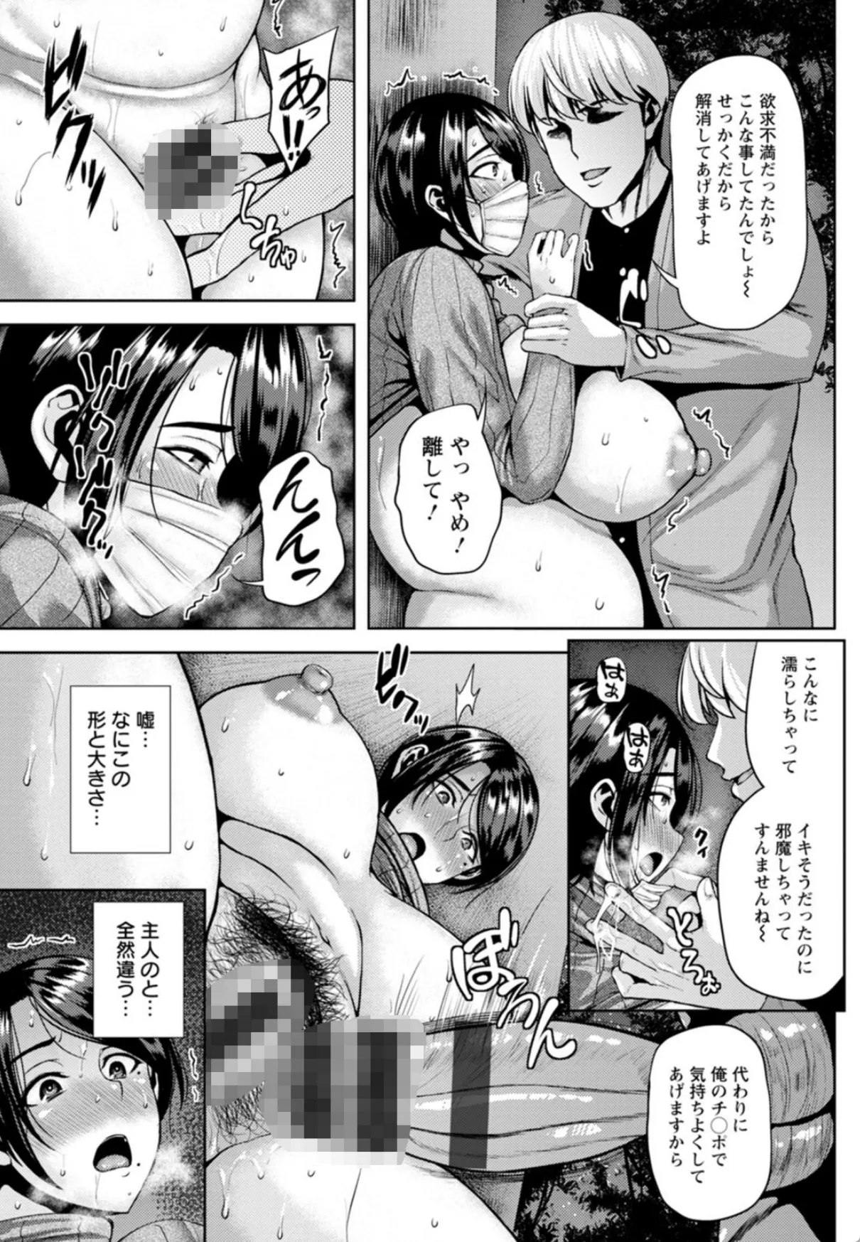 平凡だけど幸せな日々。夫との夜の営みは少ないながらも夫との関係は良好。しかし淡々とした毎日を繰り返していくばかり。そこで少し刺激が欲しいと思ってしまった妻は、SNSに自分のエロい自撮り写真をアップし始める。そして、さらに刺激を欲した妻は夜の公園に一人で赴き露出オナニーを始める。するとそこへ現れたのがパート先の同僚修司だった。修司にSNSの裏アカがバレていたのだ。そして、その場でデカチンポをハメられて中出しされてしまう。デカチンポの快感に浸る妻。その後、修司の友達らにまたハメられて…。